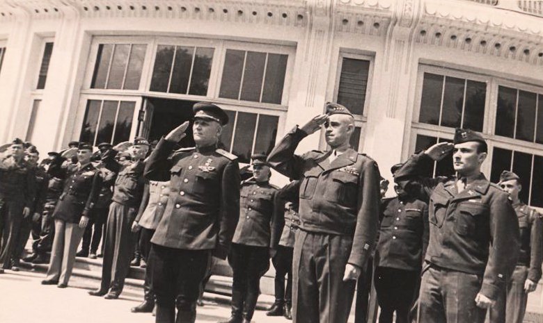 - Маршал И. С. Конев (слева) с группой советских и американских офицеров перед вылетом в резиденцию генерала О. Бредли, г. Лейпциг