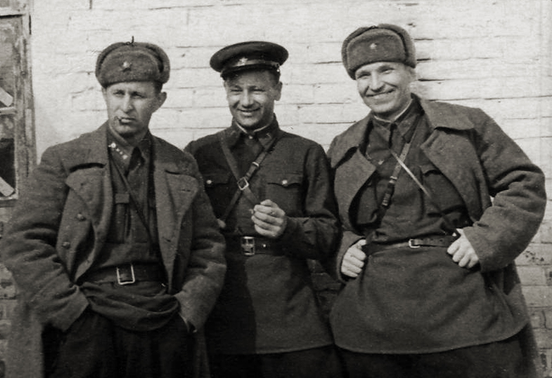 - Фронтовые корреспонденты газеты «Боевой натиск» (слева направо): Б. Мясников, В. Клюжев, В. Чухланцев. Новый Оскол, 1941-1942