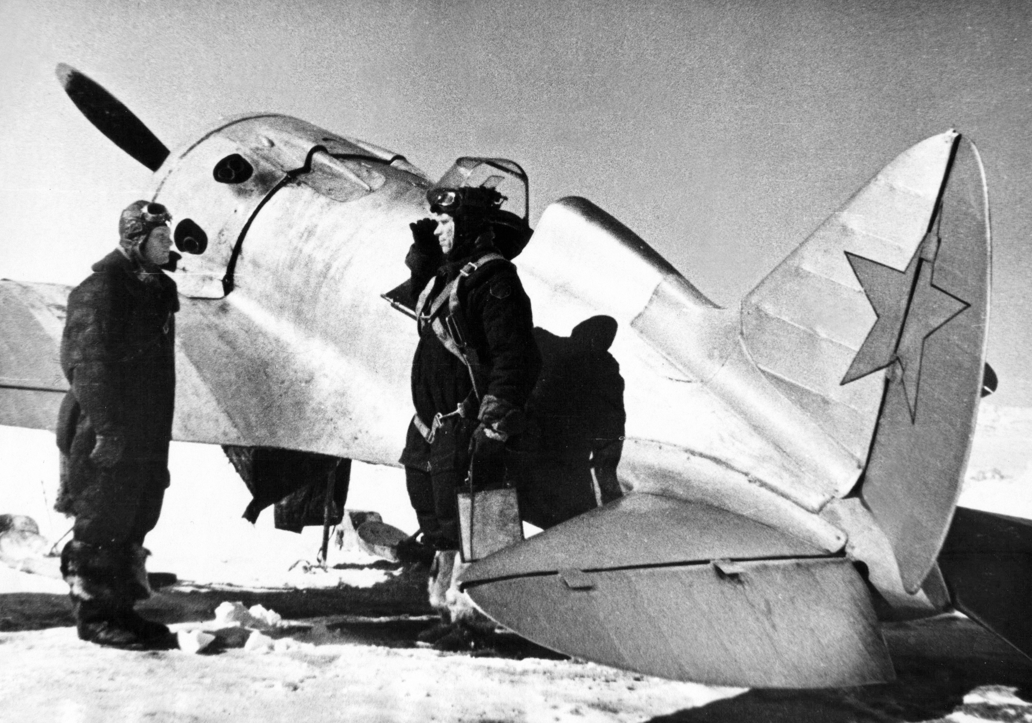 - О выполнении боевого задания докладывает ст. лейтенант Л. Борисов командиру эскадрильи В. Шишкину (справа), р-он Белгорода, 1942