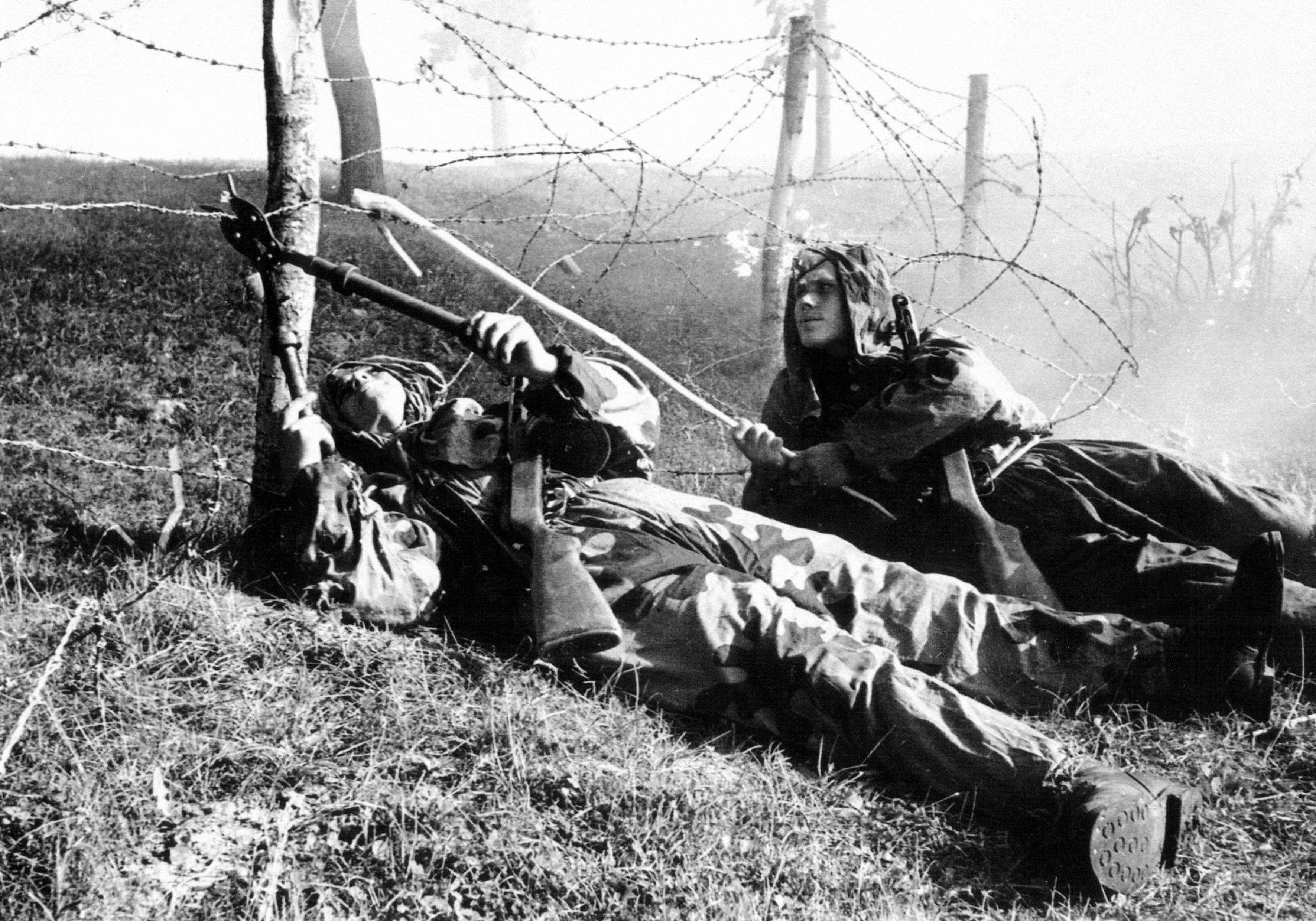 - Сапёры-разведчики А. Калашников и С. Землянский выполняют проход в проволочных заграждениях противника, 1943