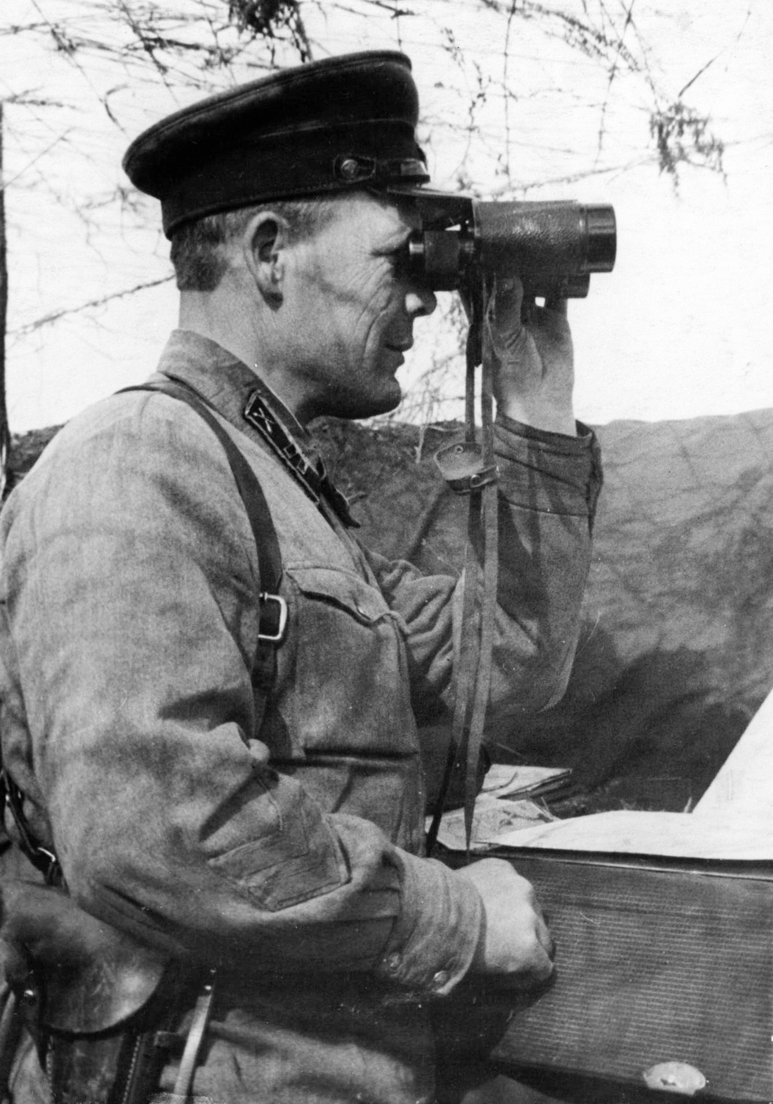 - Командир артполка 21-ой армии т. Михеев на передовом наблюдательном пункте во время боев под Рогачевом на Днепре, июль 1941