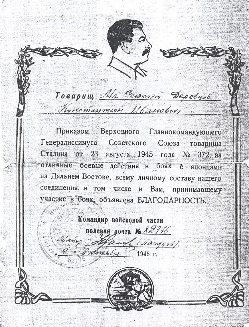Константин Иванович Деревцов вернулся к мирной жизни в 1947 году. За героизм и мужество, проявленные в боях с фашистскими захватчиками, награждён орденом Отечественной войны II степени, медалями «За победу над Германией в Великой Отечественной войне 1941—1945 гг», «За победу над Японией». Имеет благодарность от командования за отличные боевые действия в боях с японцами на Дальнем Востоке.