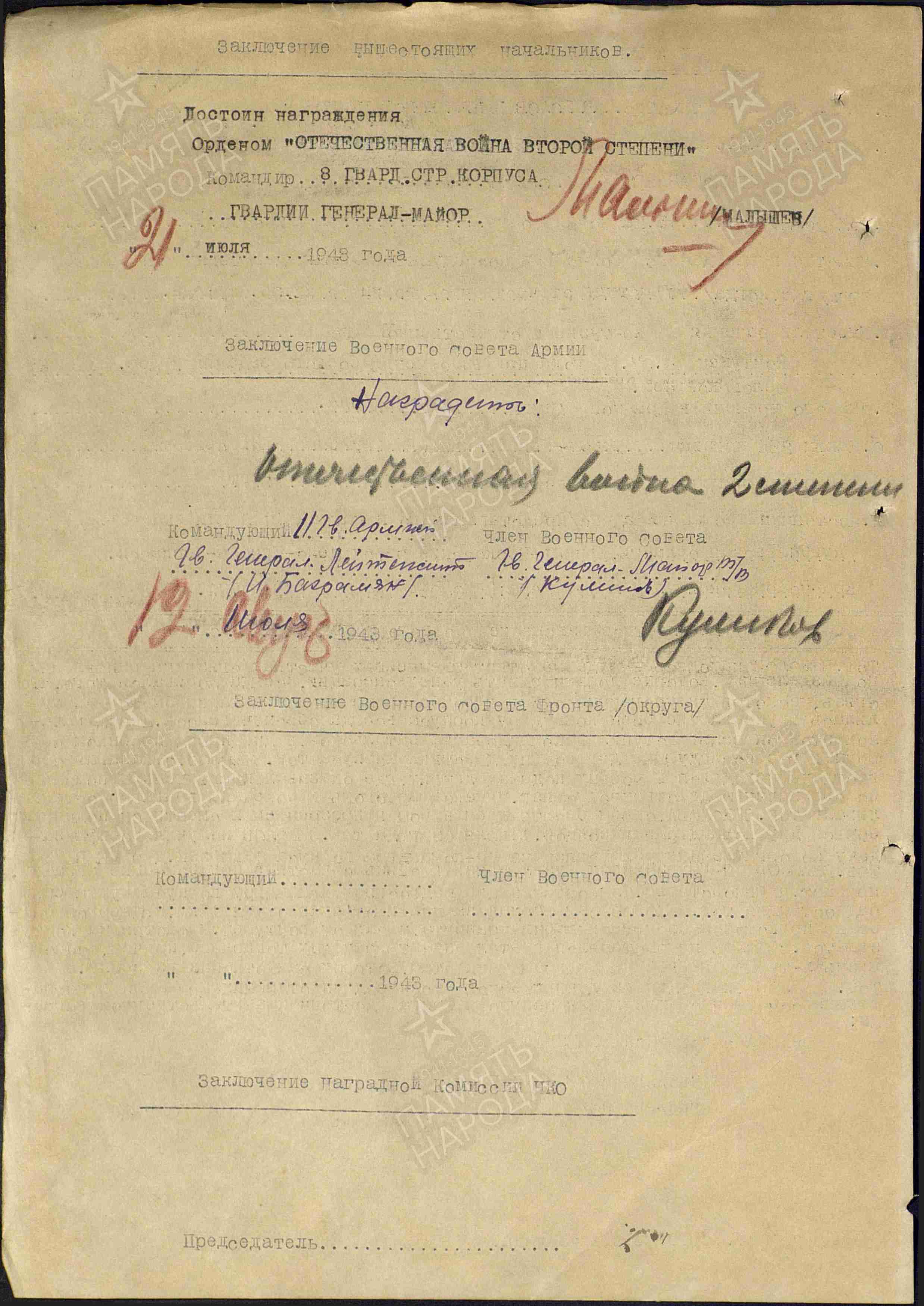 Веколов П.К. Наградной лист от 19 июля 1943 г. к ордену Красной Звезды (решением командования был награжден орденом Отечественной войны II степени), архивная копия, 2 страницы