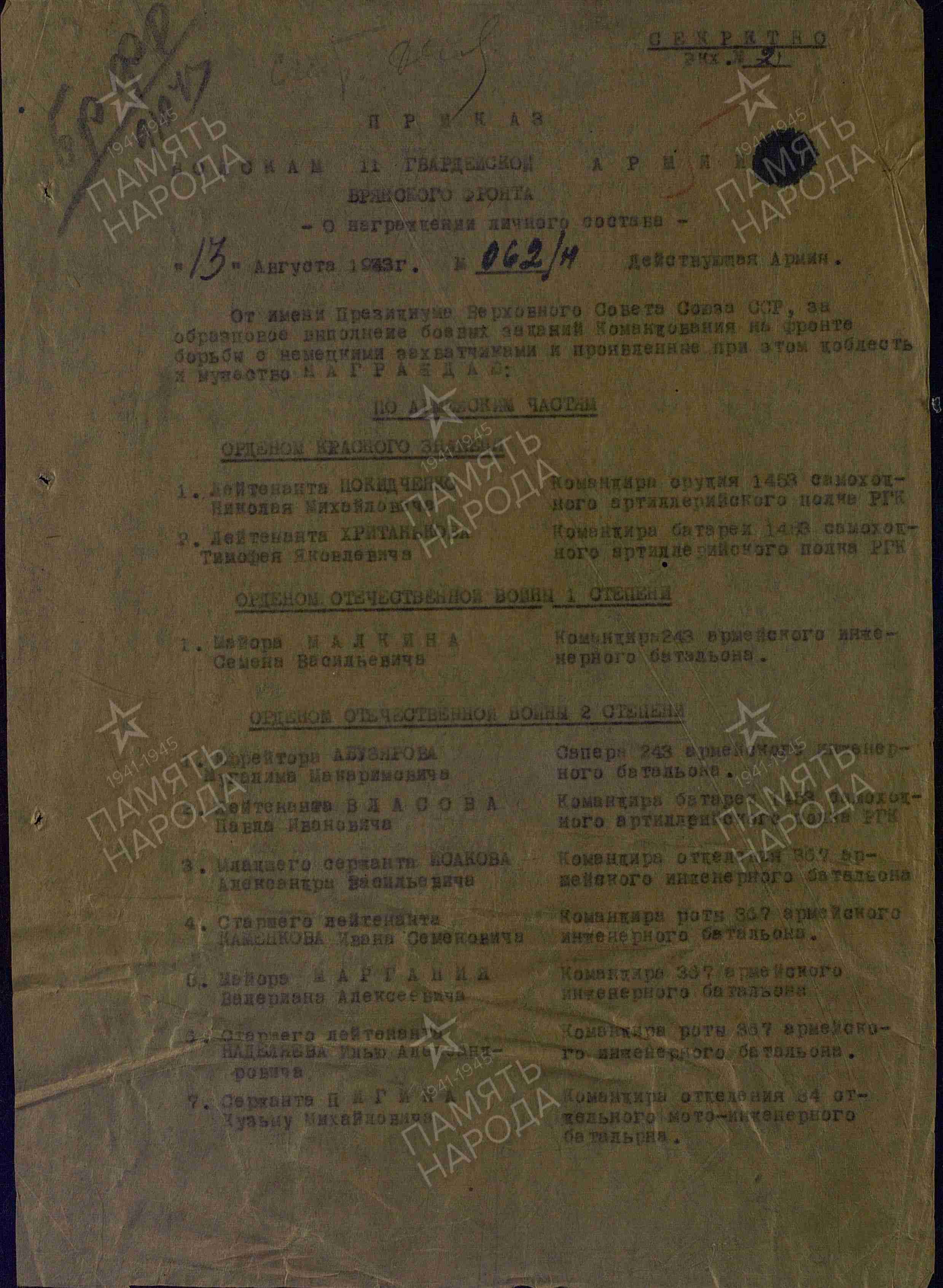 Веколов П.К. Приказ от 13 августа 1943 г. о награждении орденом Отечественной войны II степени (архивная копия, 2 страницы)