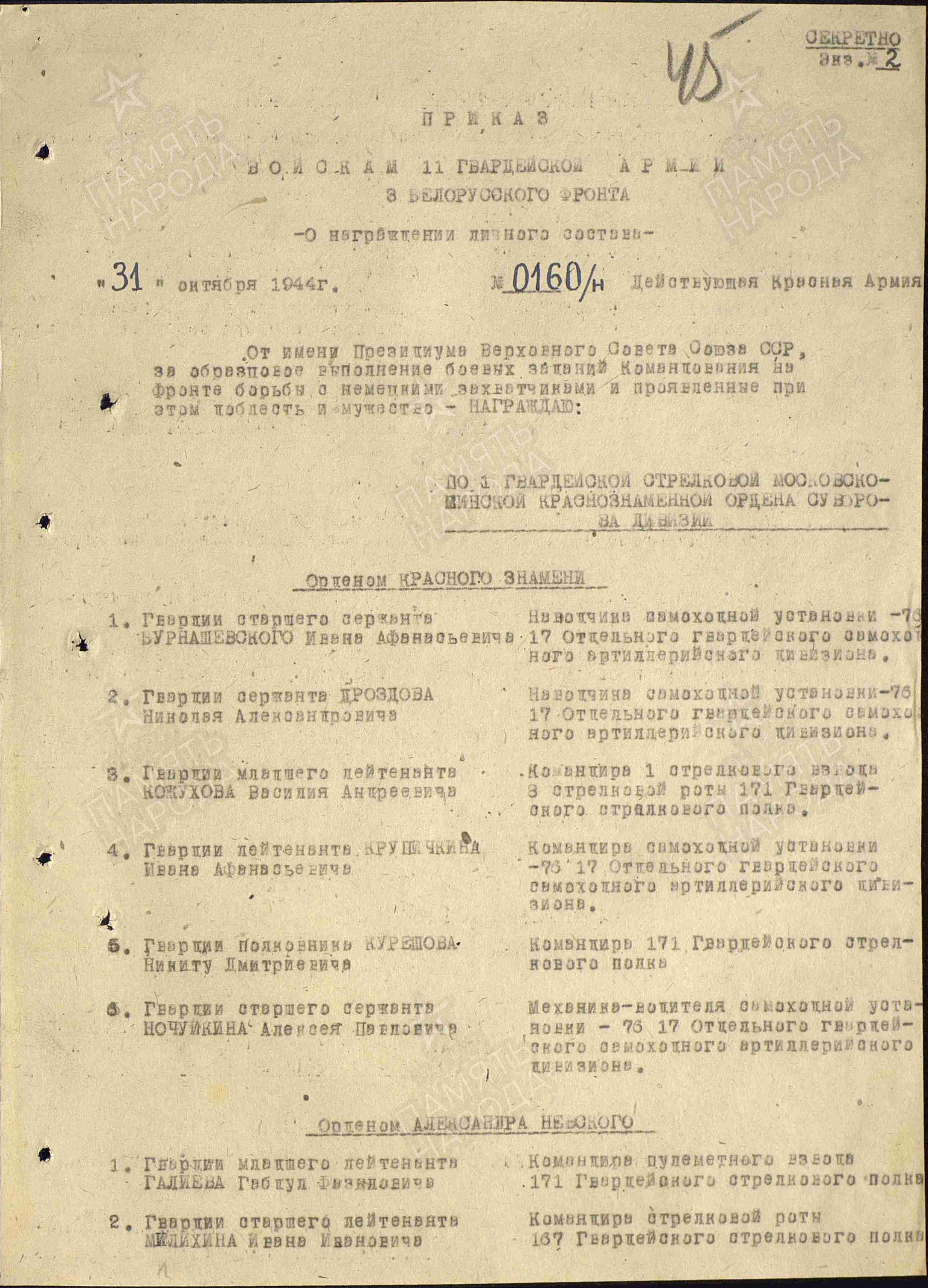 Веколов П.К. Приказ от 27 апреля 1945 г. о награждении орденом Александра Невского (архивная копия, 2 страницы)