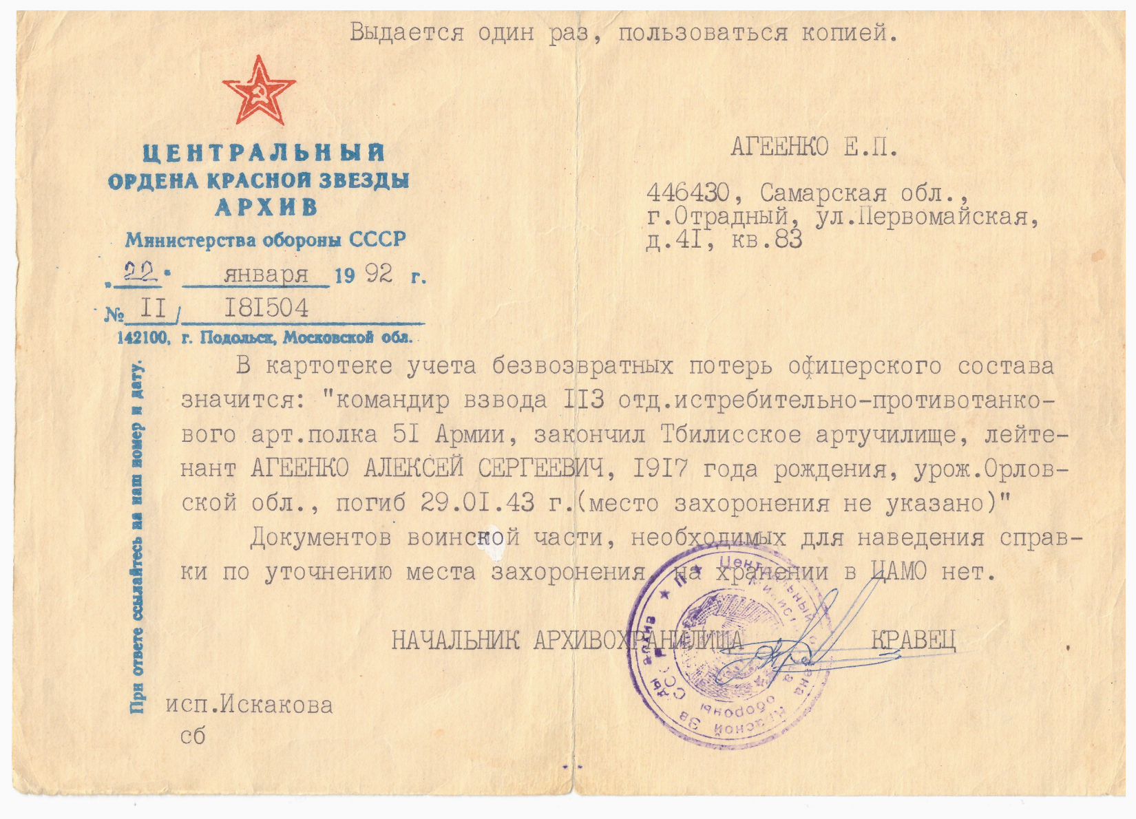 Документы и фотография представлены сыном Агеенко Василием Алексеевичем, г. Отрадный Самарской области