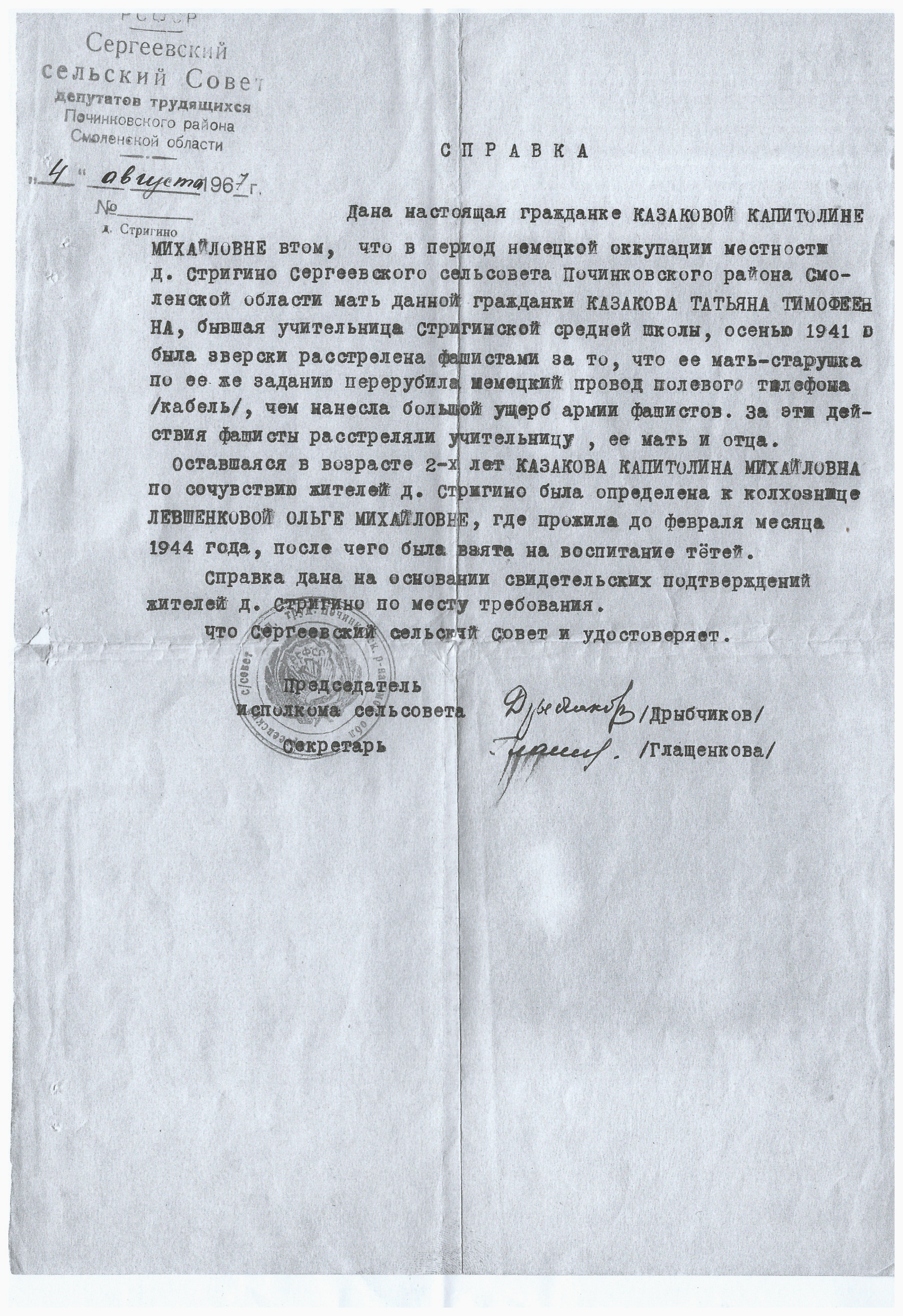Сергеевский сельский совет Починковского района Смоленской области в августе 1967 года предоставил справку следующего содержания: «Дана настоящая гражданке Казаковой Капитолине Михайловне в том, что в период немецкой оккупации д. Стригино Сергеевского сельсовета Починковского района Смоленской области мать данной гражданки Казакова Татьяна Тимофеевна, бывшая учительница Стригинской средней школы, осенью 1941 года была зверски расстреляна фашистами за то, что ее мать-старушка по ее же заданию перерубила немецкий провод полевого телефона (кабель), чем нанесла большой ущерб армии фашистов. За эти действия фашисты расстреляли учительницу, ее мать и отца.
