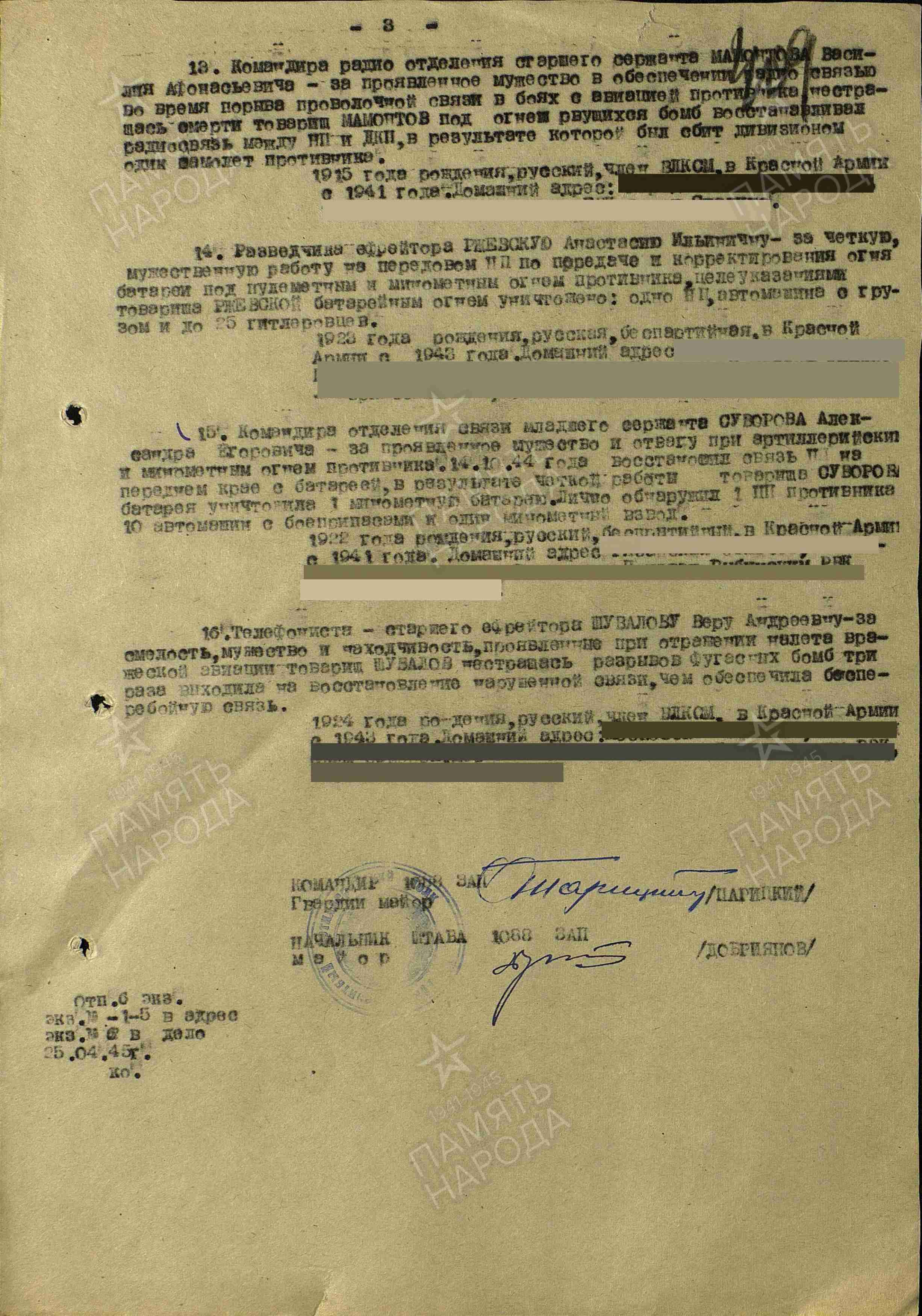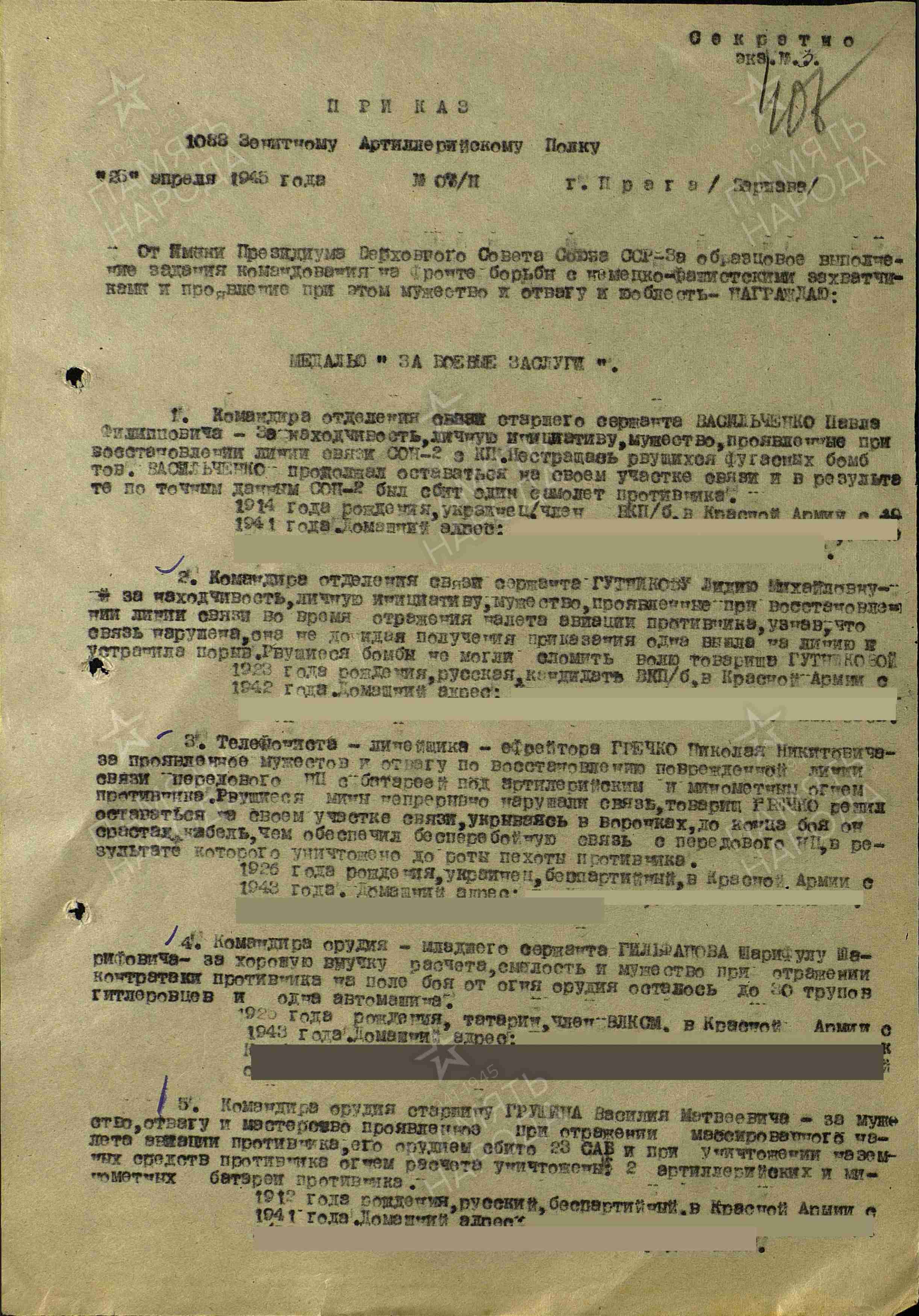 Моя бабушка, Ржевская Анастасия Ильинична, ушла на фронт в июле 1941 года, ей едва исполнилось 18 лет. Сначала она, как и многие ее сверстники, были направлены на рытье окопов. В действующую армию бабушка попала в январе 1943 года. Её зачислили в 1088 зенитно-артиллерийский полк на должность разведчика — она должна была наводить и координировать огонь нашей артиллерии по позициям противника.