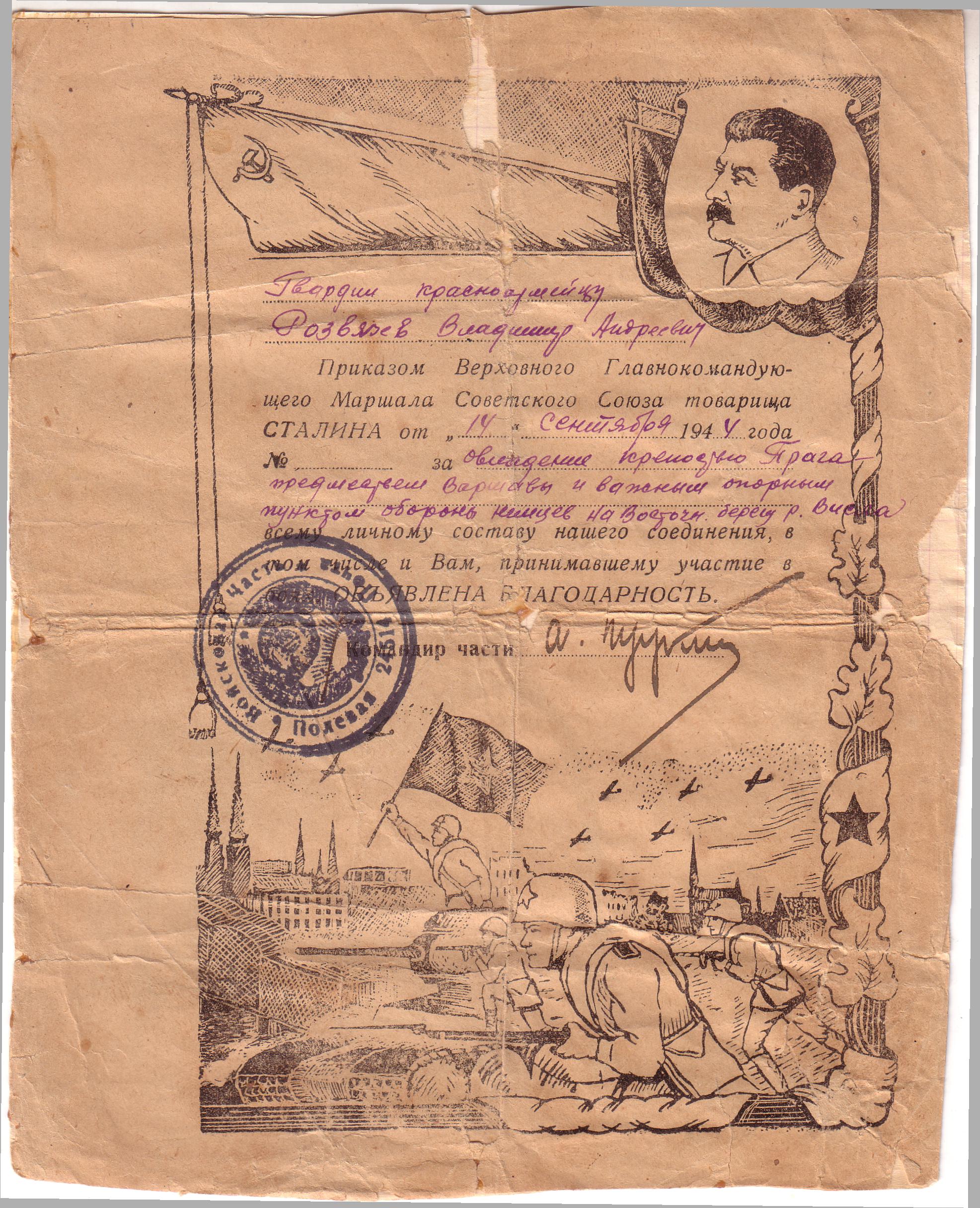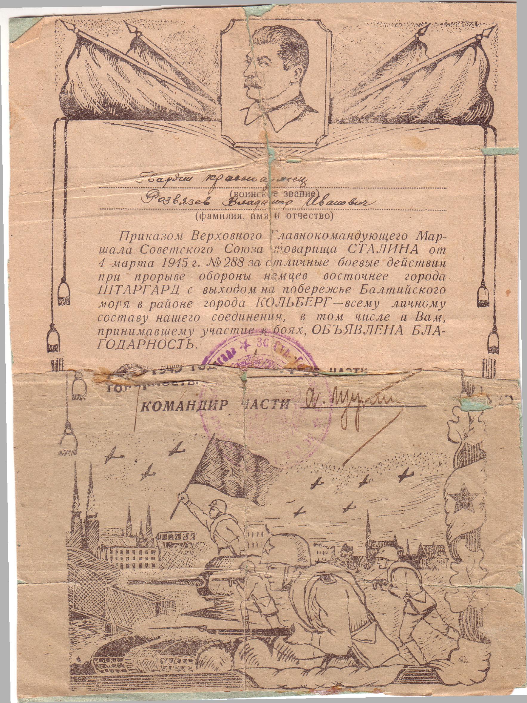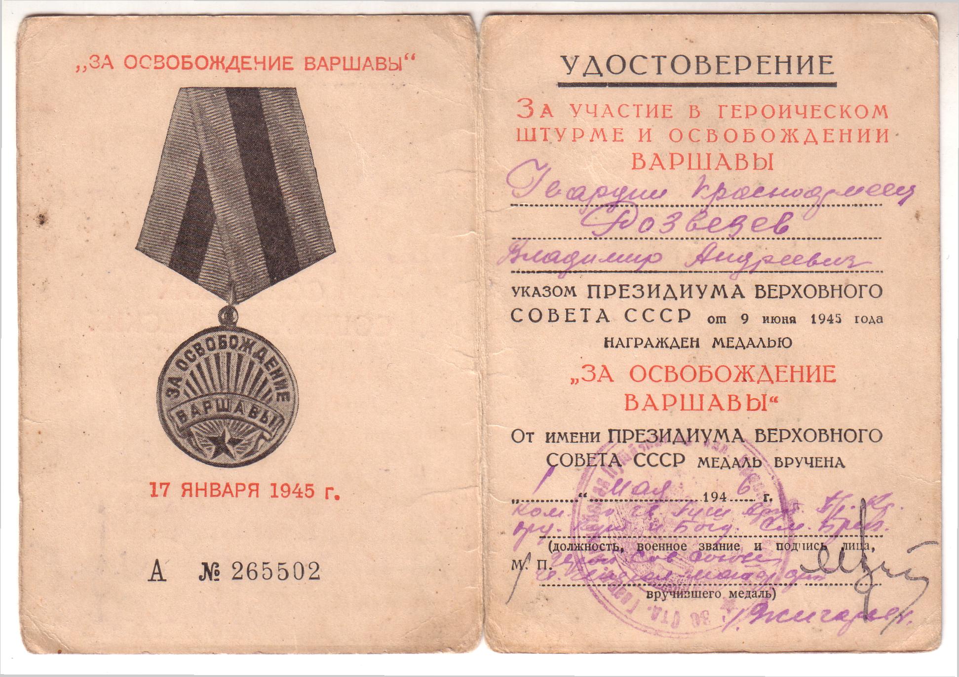 А остались нам на память его награды: медали «За боевые заслуги», «За освобождение Варшавы», «За взятие Берлина», «За победу над Германией», юбилейные. А кроме того - истертые пожелтевшие листы благодарностей. Все это бережно хранится в нашей семье.