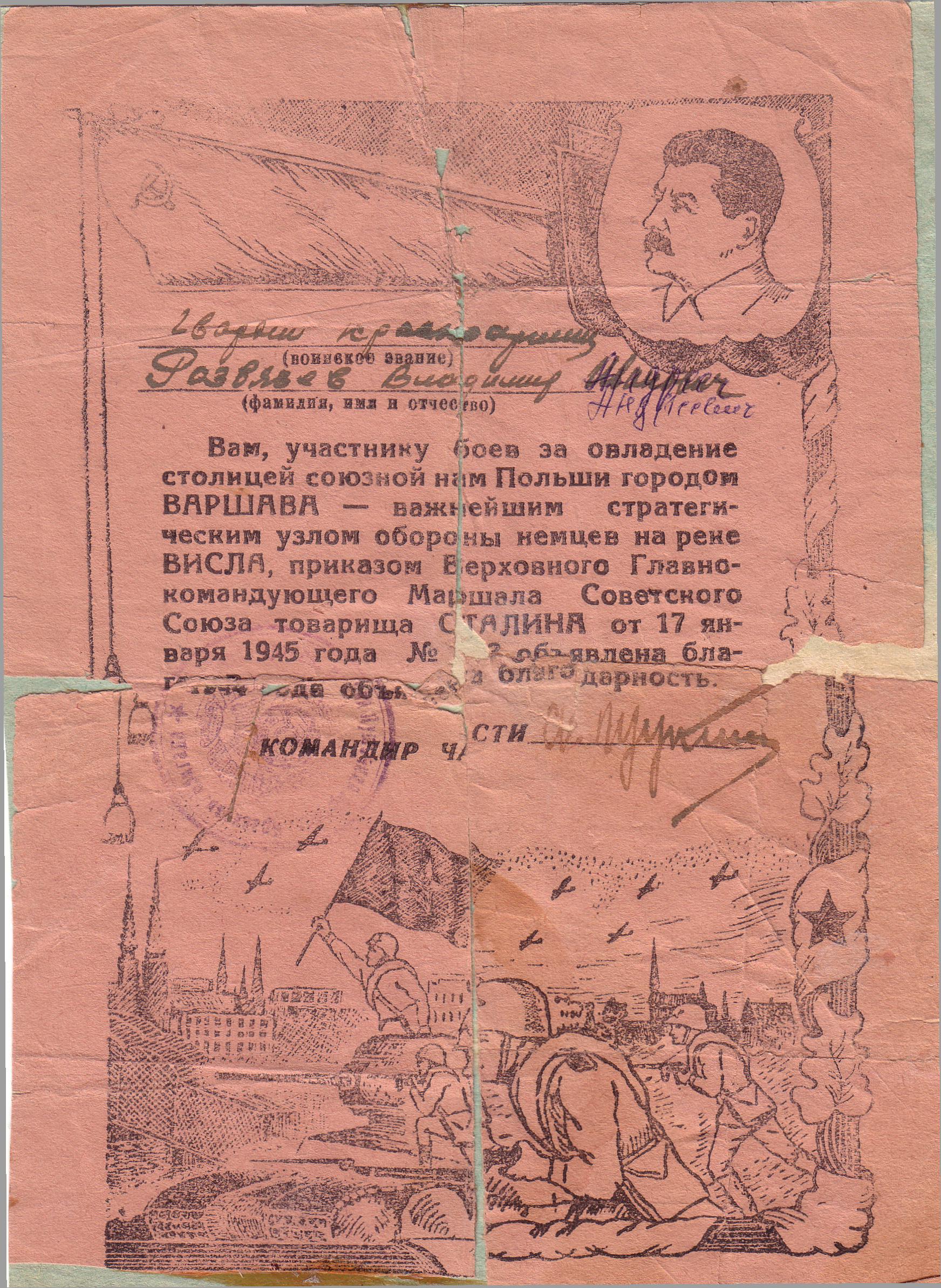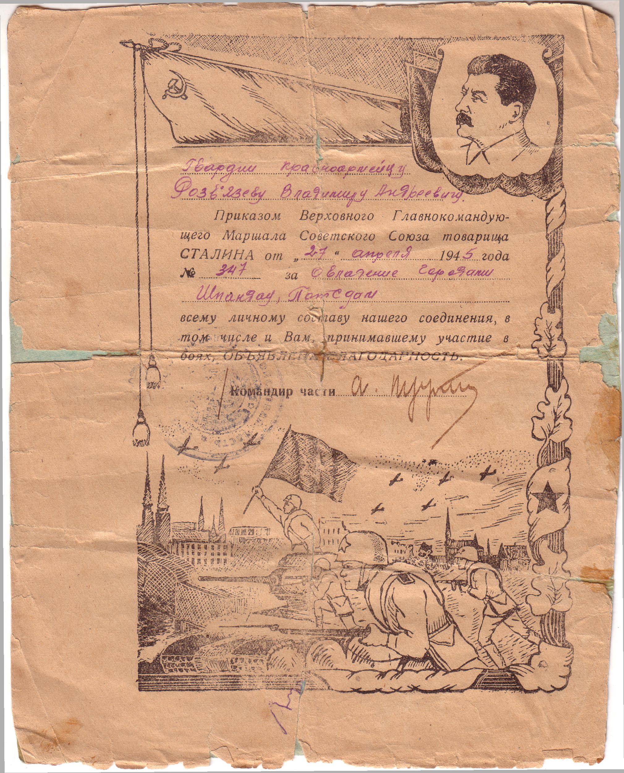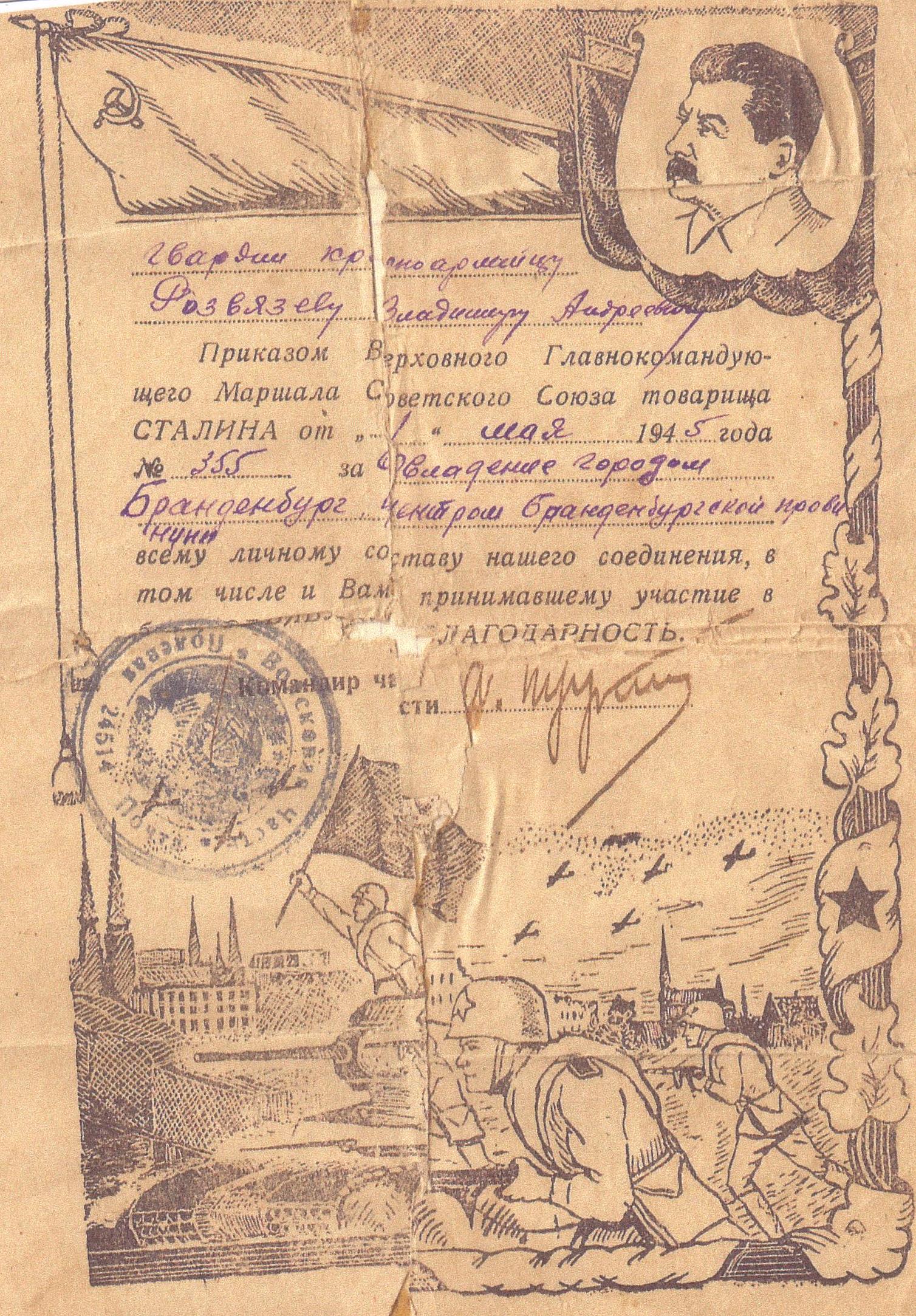 А остались нам на память его награды: медали «За боевые заслуги», «За освобождение Варшавы», «За взятие Берлина», «За победу над Германией», юбилейные. А кроме того - истертые пожелтевшие листы благодарностей. Все это бережно хранится в нашей семье.