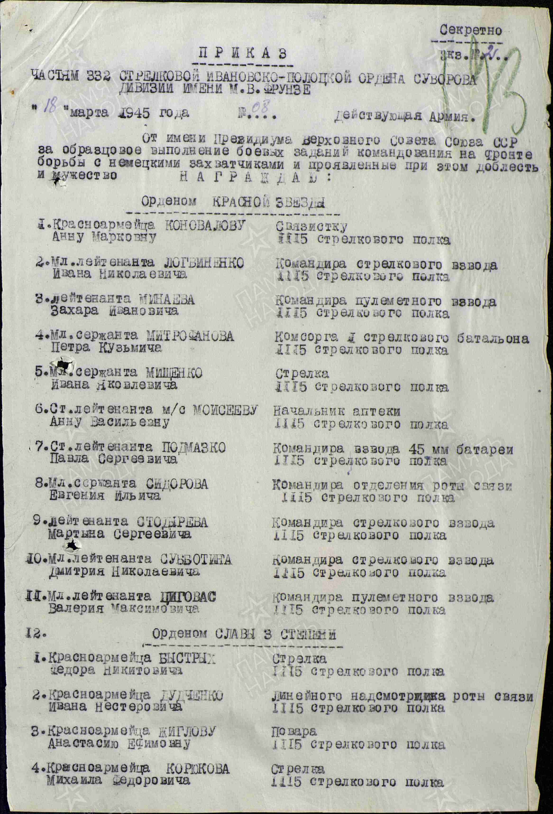 На всю жизнь запомнил Петр Кузьмич день 5 февраля 1945 г. После тяжелого боя под Даугавпилсом, который закончился победой, их батальон наткнулся на приземистые постройки. Бойцы решили, что это брошенный немцами военный лагерь. Когда из этого мрачного, полутемного, сырого чрева стали выводить и выносить грязные, в лохмотьях живые существа, они не сразу поняли, что это были дети. Бледные, словно из них по капельке выцедили кровь. Они были настолько изнуренные, что маленькие, будто усохшие тела казались бесплотными. Вечером, когда на привал приехала полевая кухня, солдаты отказались есть. Хлеб застревал в горле, свой ужин они отправили маленьким освобожденным узникам. 9 мая 1945 г. Петр Кузьмич Митрофанов встретил в Восточной Пруссии. После победы еще 4 года служил в Ленинграде.