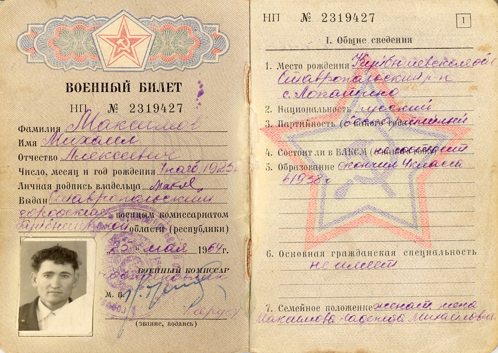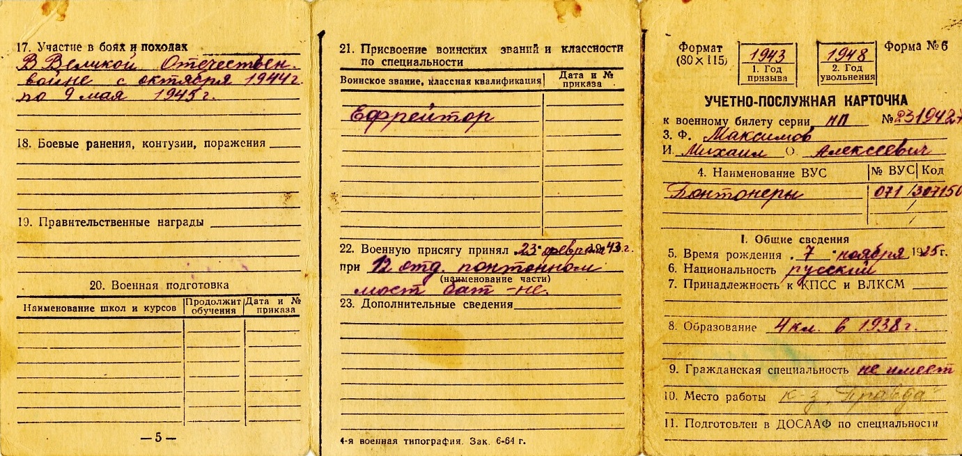 С ноября 1945 года Михаил Алексеевич служил в 277 инженерно-саперном батальоне сапером уже в звании ефрейтор. С июня 1946 года – в 120 отдельном парке инженерных машин, поваром. Демобилизовался в марте 1948 года, вернулся на родину. Вскоре женился на односельчанке – Надежде Михайловне. Вместе они прожили 49 лет, воспитали четверых детей. Умер 22 февраля 2014 года.