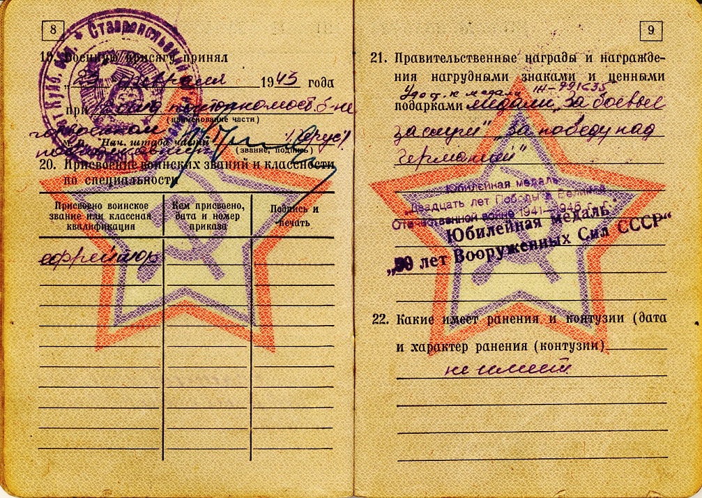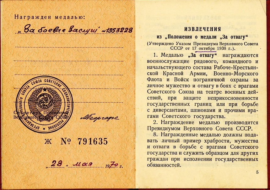 Восстанавливая шоссейные мосты в районе Сукель (Украина) под огнем противника проявил себя отважным воином, не боящимся смерти, отдавал все силы и умения на быстрейшее выполнение задания» (из наградного листа).