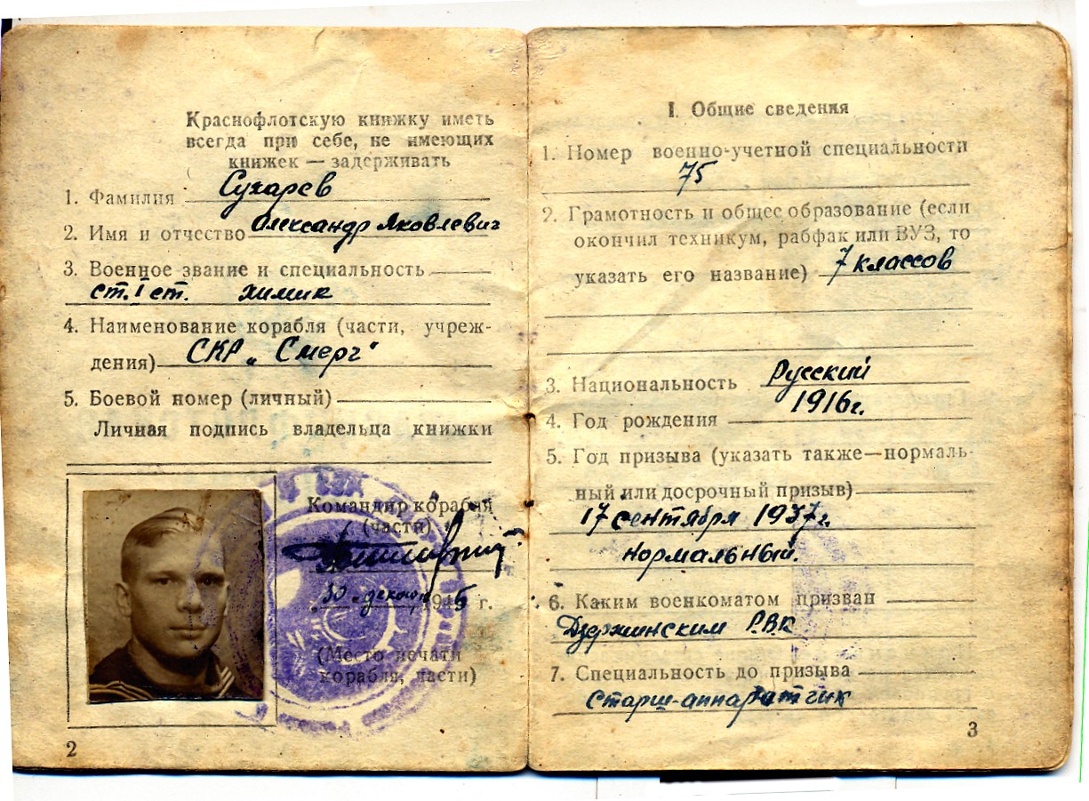 Александр, родившийся 22 марта 1918 года в Нижегородской области, с детства мечтал о море. Будучи шестнадцатилетним парнем, он изменил в метрике год рождения, прибавил себе 2 года и в сентябре 1937 года был призван матросом на Северный флот. На сторожевой корабль «Смерч» он попал в апреле 1938 года старшиной первой статьи. В январе 1946 года был уволен в запас первой категории. Он прошел две войны: Финскую и Великую Отечественную. В январе 1946 года был уволен в запас.
