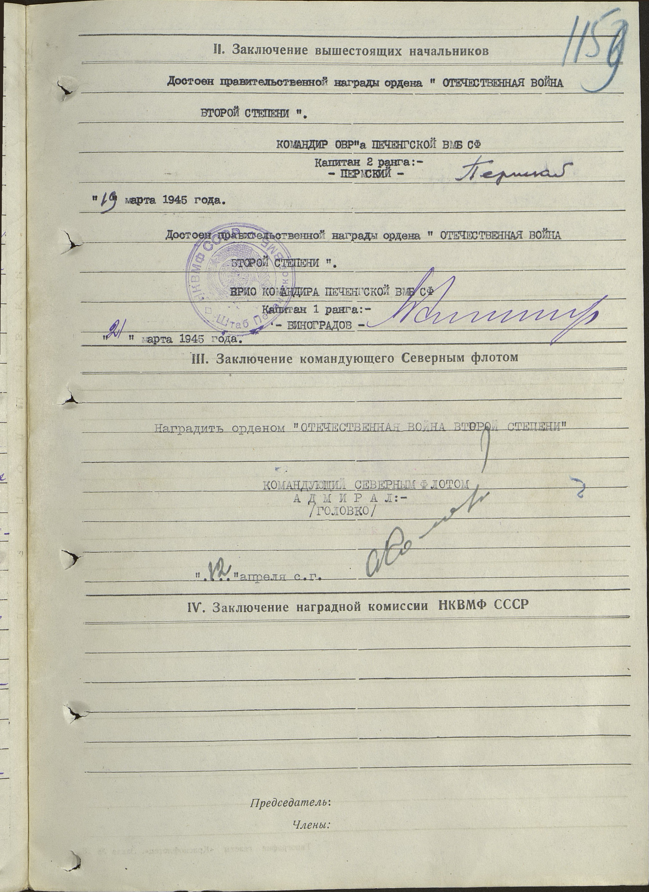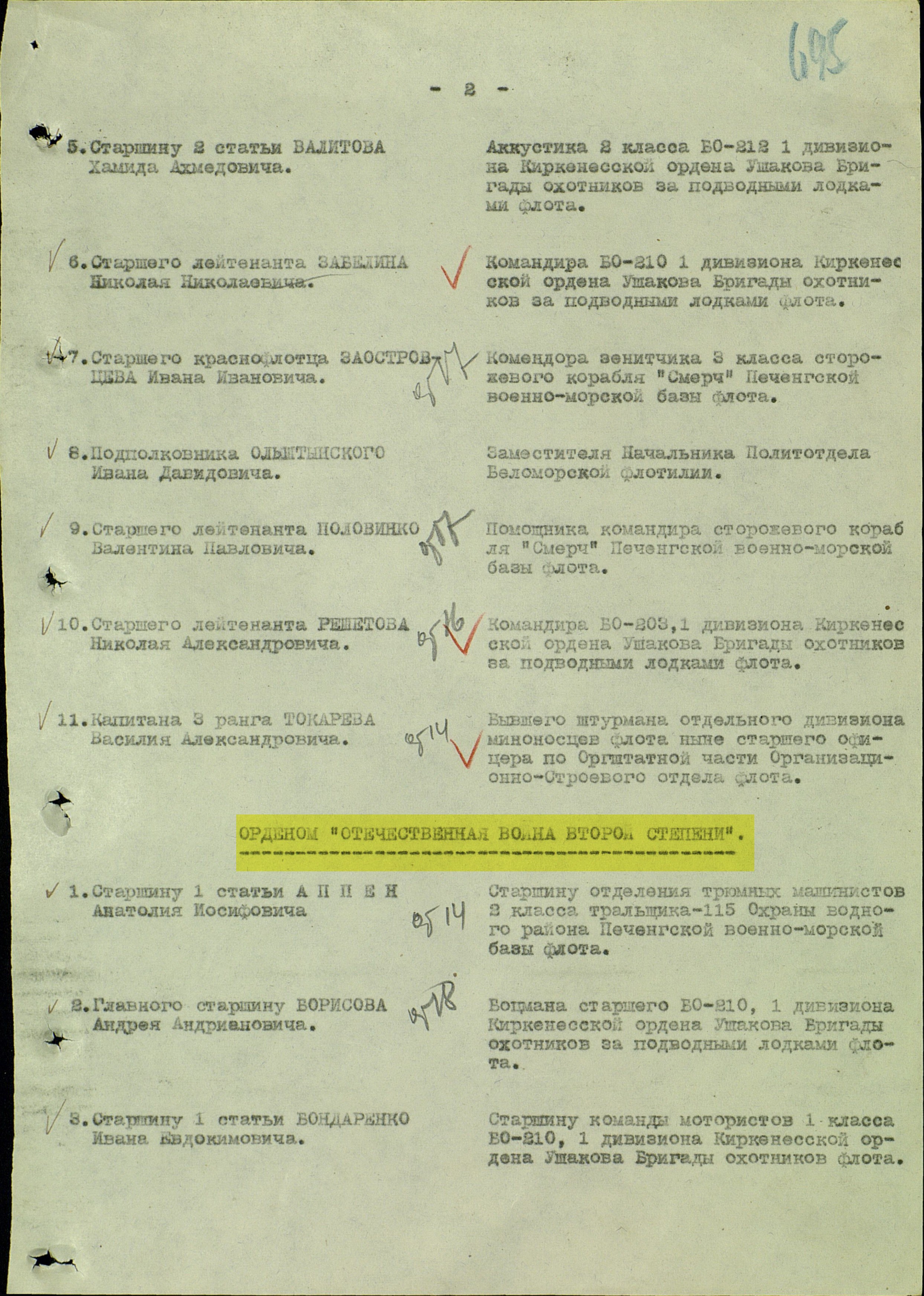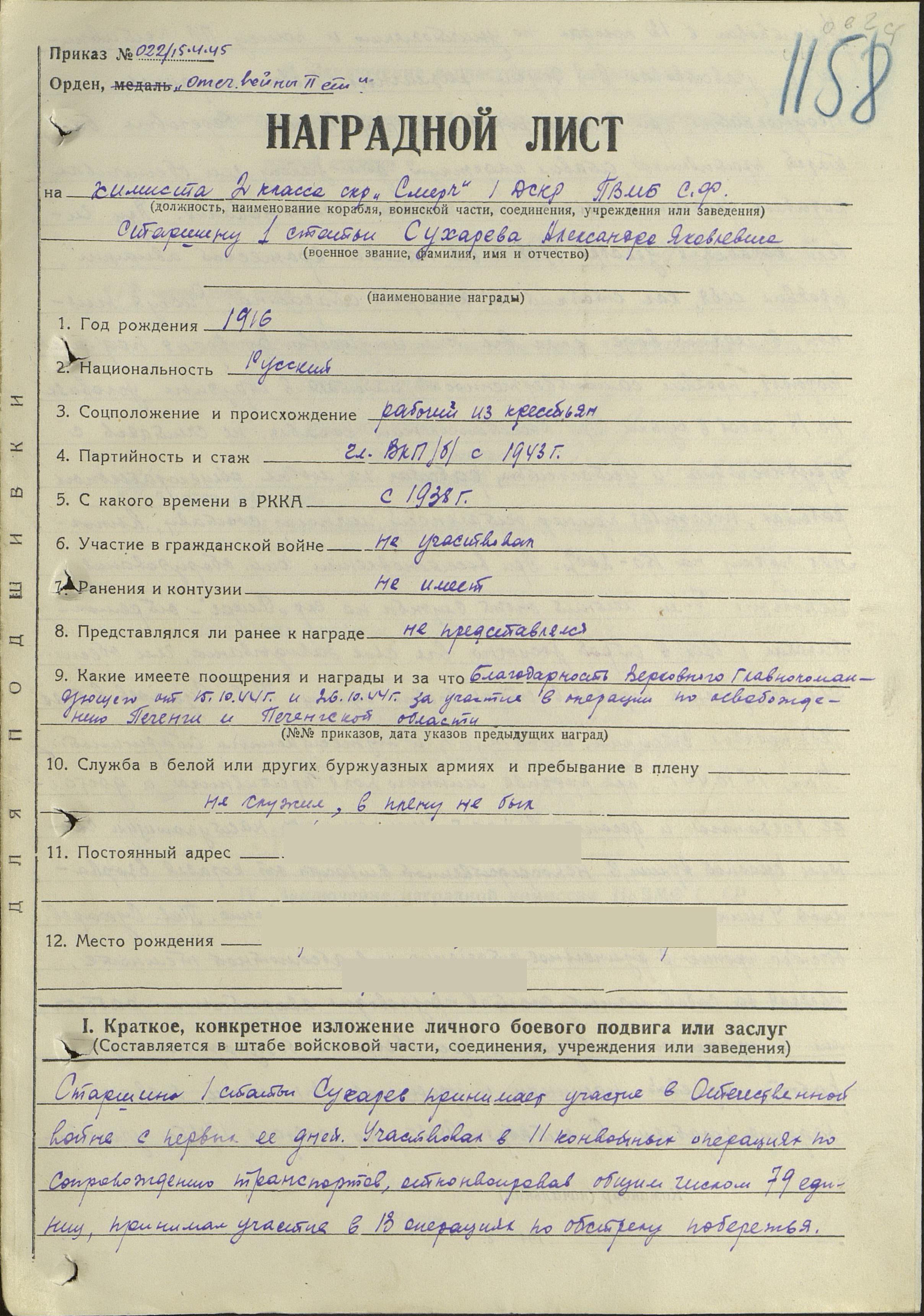 Дед мой был награжден двумя орденами Отечественной войны II степени, медалями «За оборону Советского Заполярья», «За победу над Германией в Великой Отечественной войне 1941-1945 гг.», юбилейными медалями, имеет Благодарности от Верховного Главнокомандующего за освобождение Печенги. Мать рассказывала нам, что после войны игрушек у детей не было и дети играли медалями своих отцов, поэтому в семье сохранились только два боевых ордена.