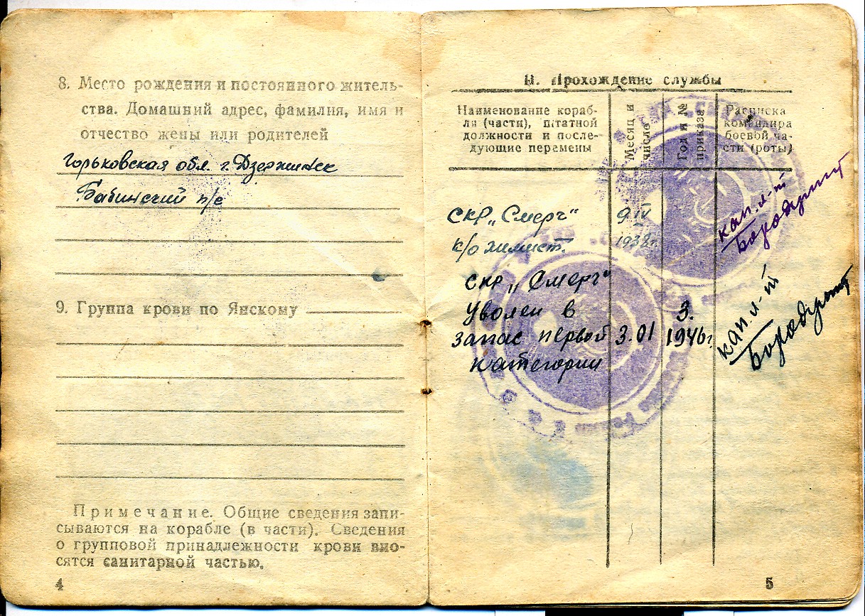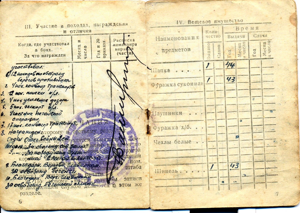 Из его рассказов я помню один – когда при конвоировании транспорта сторожевой корабль был атакован фашистами, обстрелян минами и начал тонуть, мой дед взял знамя своего корабля, обмотал его вокруг талии и нырнул в холодные северные воды. Спаслись тогда только 2 человека, мой день и еще один матрос. Только двое живых из всей команды. Мой дед сохранил боевое знамя «Смерча». Построенной вновь сторожевой корабль СКР снова стал носить гордое имя «Смерч». Про этот подвиг я также читала в газете города Дзержинска.