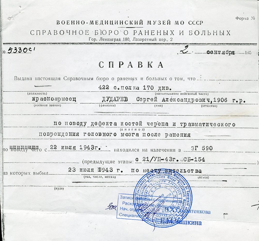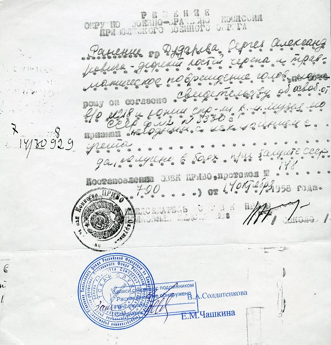 При обходе войск Центрального фронта К.К. Рокоссовским и маршалом Советского Союза Г. К. Жуковым перед Курской битвой получил фронтовую кличку «Спиритус». Жуков Г. К. попросил у него фляжку, захотел пить видимо, а отец, то ли не смог отказать, то ли растерялся и отдал ему свою фляжку со спиртом. Он служил арт. техником и у него всегда был спирт для работы. Жуков, ничего не подозревая, взял фляжку и сделал глоток… «поперхнулся, побагровел, покраснел и сказал: «Спиритус, 5 суток ареста». Так его с легкой руки Жукова и стали звать Спиритус. Пять суток он не отсидел, начался штурм немецких войск и затем наступление наших войск на гитлеровские полчища. Продержался он в той бойне 15 суток, затем его засыпало в блиндаже вместе с арт. техникой. Получил ранение в голову и с 22 июля находился на излечении в 7Г № 590, затем выбыл по месту жительства в г. Куйбышев, пролежал он практически год без сознания, но слава тем докторам – они спасли ему жизнь. Он выжил и жил с огромной дырой в голове до 84-х лет и до последнего не терял сознания, но правая часть тела после ранения была парализована. После госпиталя признан негодным к воинской службе в связи с повреждением головного мозга.