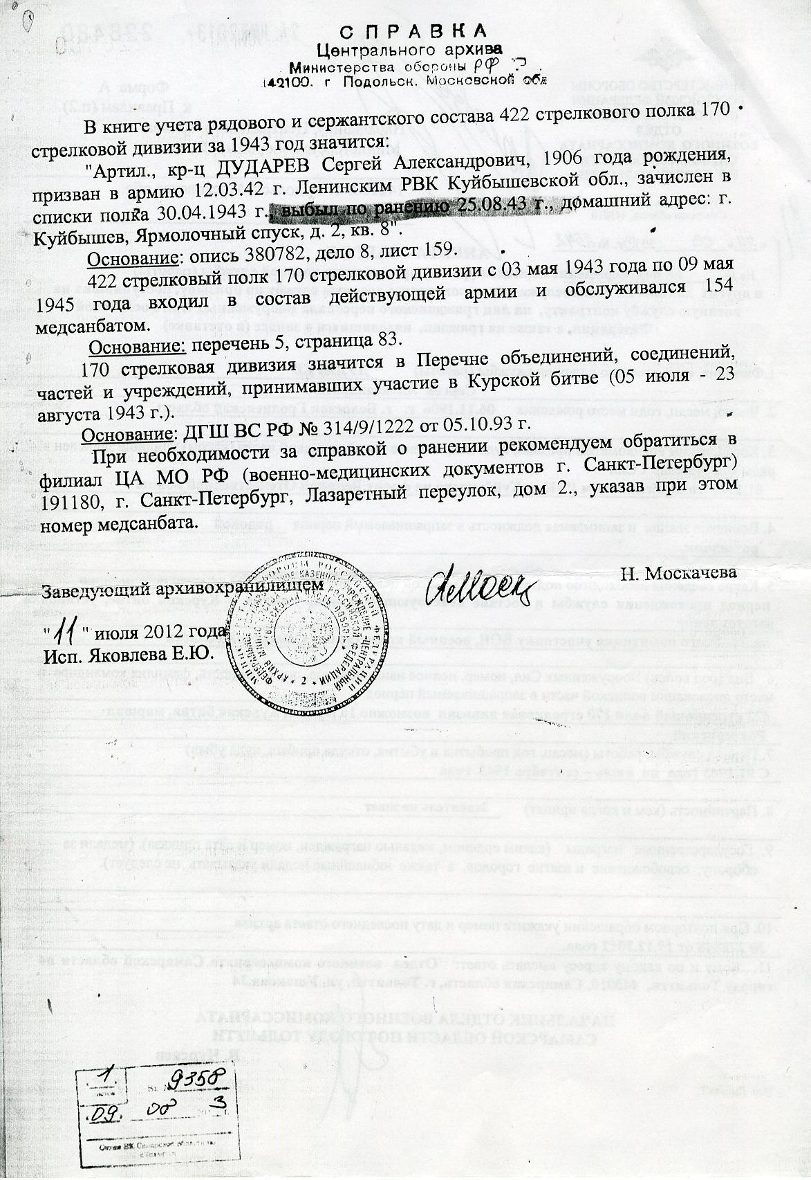 После окончания военного училища получил специальность – арт. техник. Был призван в ряды РККА, где служил с 1928 по 1930 г.г. Сначала КВЖД, затем Приволжский военный округ, откуда был призван Ленинским РВК г. Куйбышева на фронт. Был ранен. С декабря 1941 по апрель 1942 лечился в эвакогоспитале (номер не указан). Был снят с учета, и повторно призван 12.03.1942 г. Ленинским РВК г. Куйбышева. Зачислен в списки 422 стрелкового полка 170 стрелковой дивизии 30.04.1943 г., которая принимала участие в Курской битве, он там числился с 5 июля по 21 июля 1943 г.