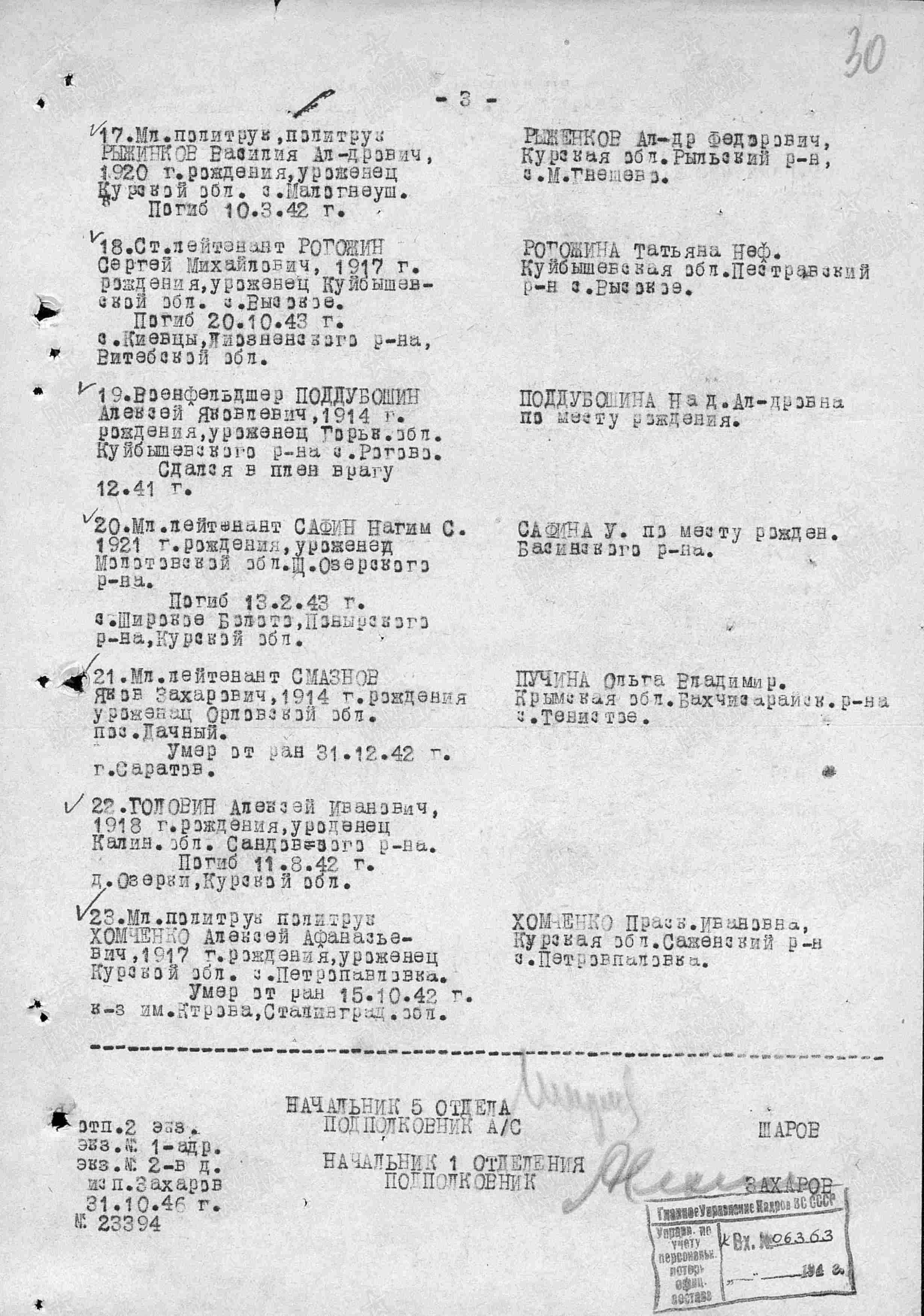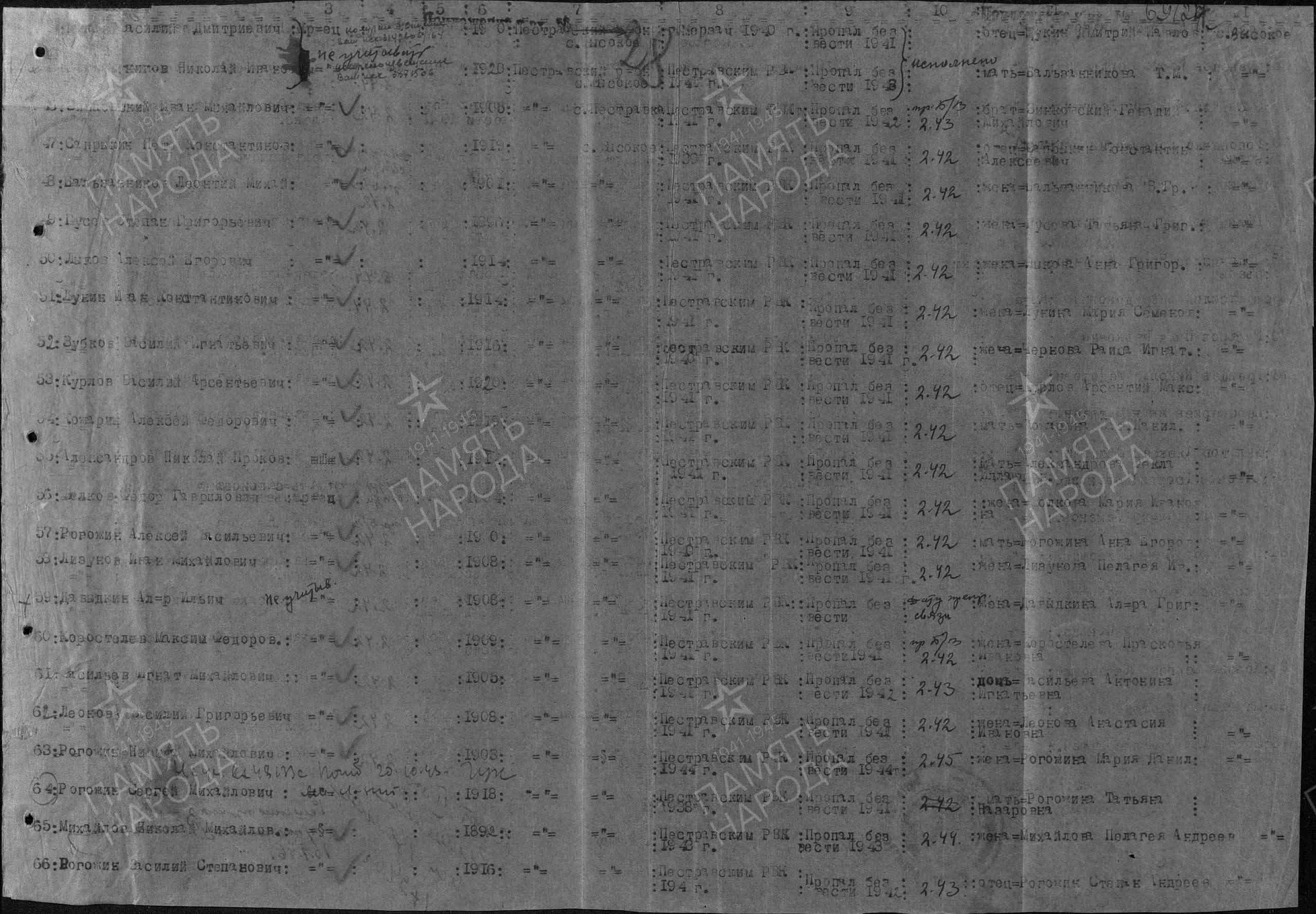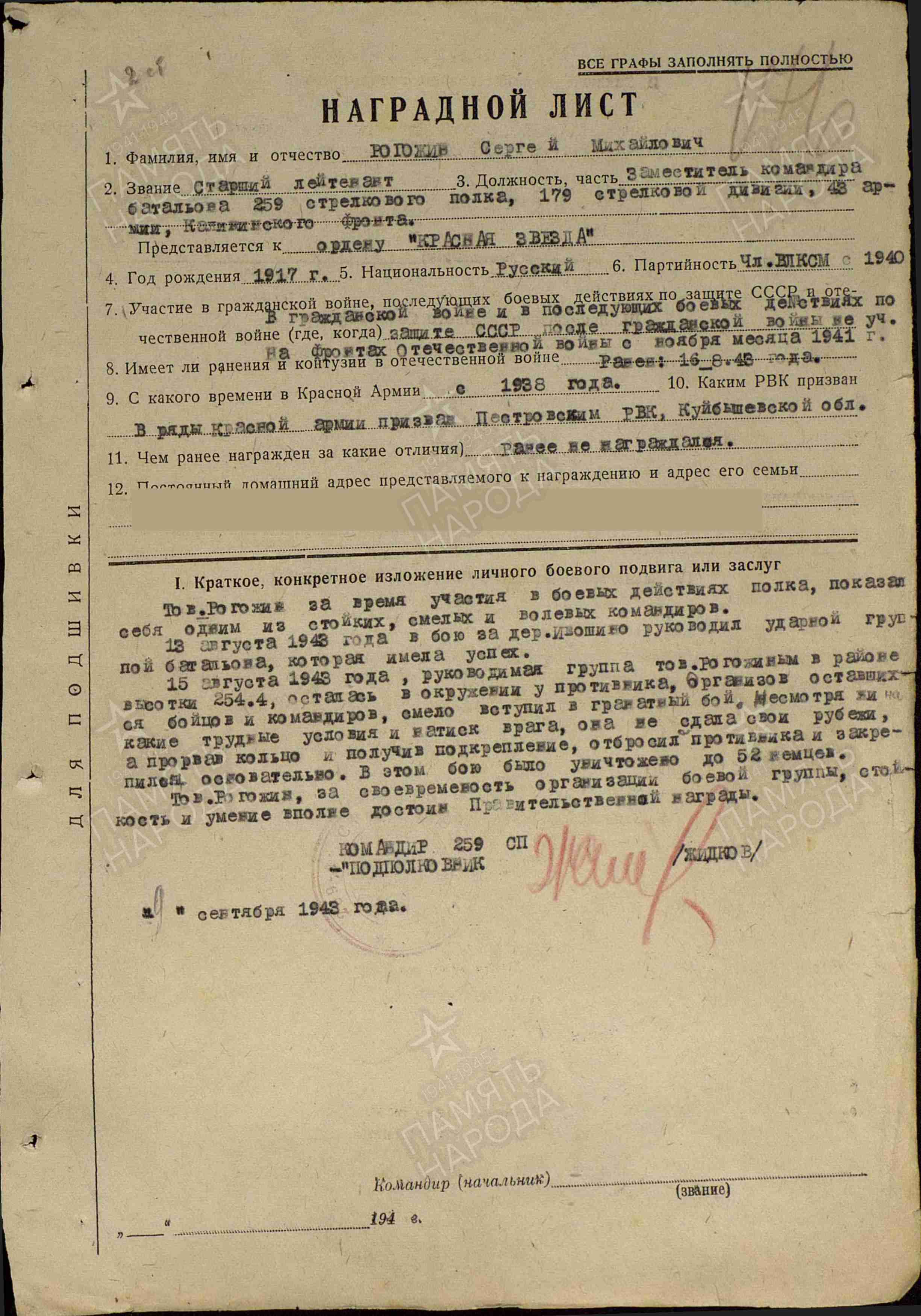 Родился в 1917 году. Закончил 7 классов Пестравской школы. В РККА с 1938 года. Выпускник Кемеровского пехотного училища. Старший лейтенант Сергей Рогожин, заместитель командира батальона 259 стрелкового полка 179 стрелковой дивизии погиб 30 октября 1943 года. За отвагу и мужество был награждён орденом Отечественной войны II степени.