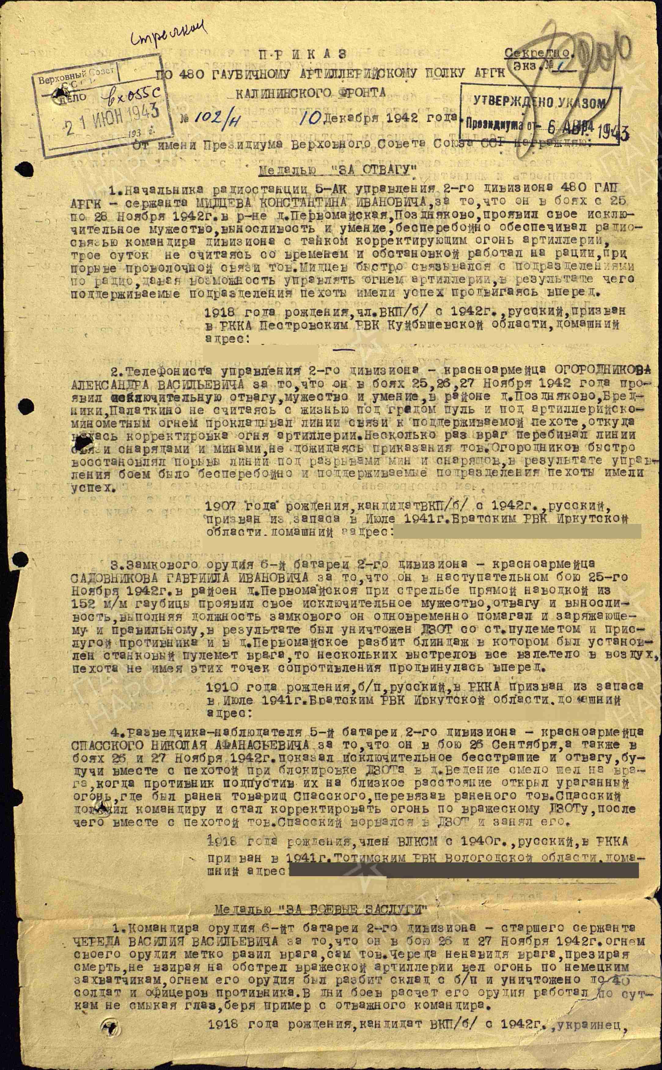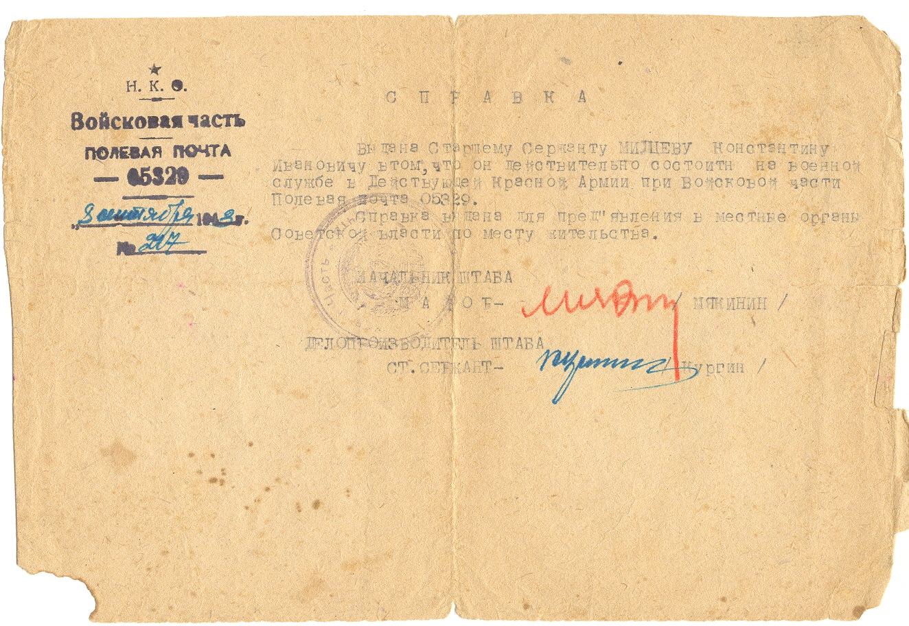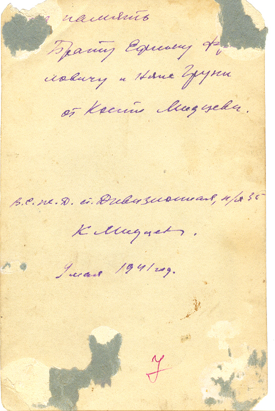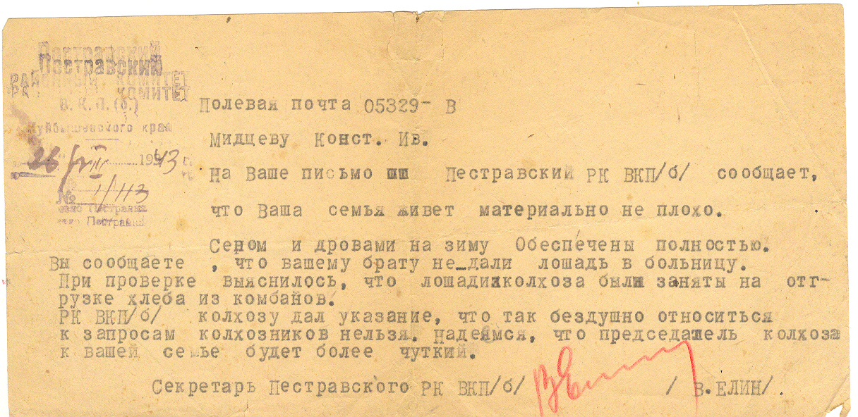 Ответ Константину Мидцеву от Пестравского РК ВКП (б) Куйбышевской области от 26 августа 1943 года: «Полевая почта 05329 В. Мидцеву Константину Ив. На Ваше письмо Пестравский РК ВКП (б) сообщает, что Ваша семья живет материально не плохо. Сеном и дровами на зиму обеспечены полностью. Вы сообщаете, что Вашему брату не дали лошадь в больницу. При проверке выяснилось, что лошади колхоза были заняты на отгрузке хлеба из комбайнов. РК ВКП (б) колхозу дал указание, что так бездушно относиться к запросам колхозников нельзя. Надеемся, что председатель колхоза к Вашей семье будет более чуткий. Секретарь Пестравского РК ВКП (б) В. Елин».