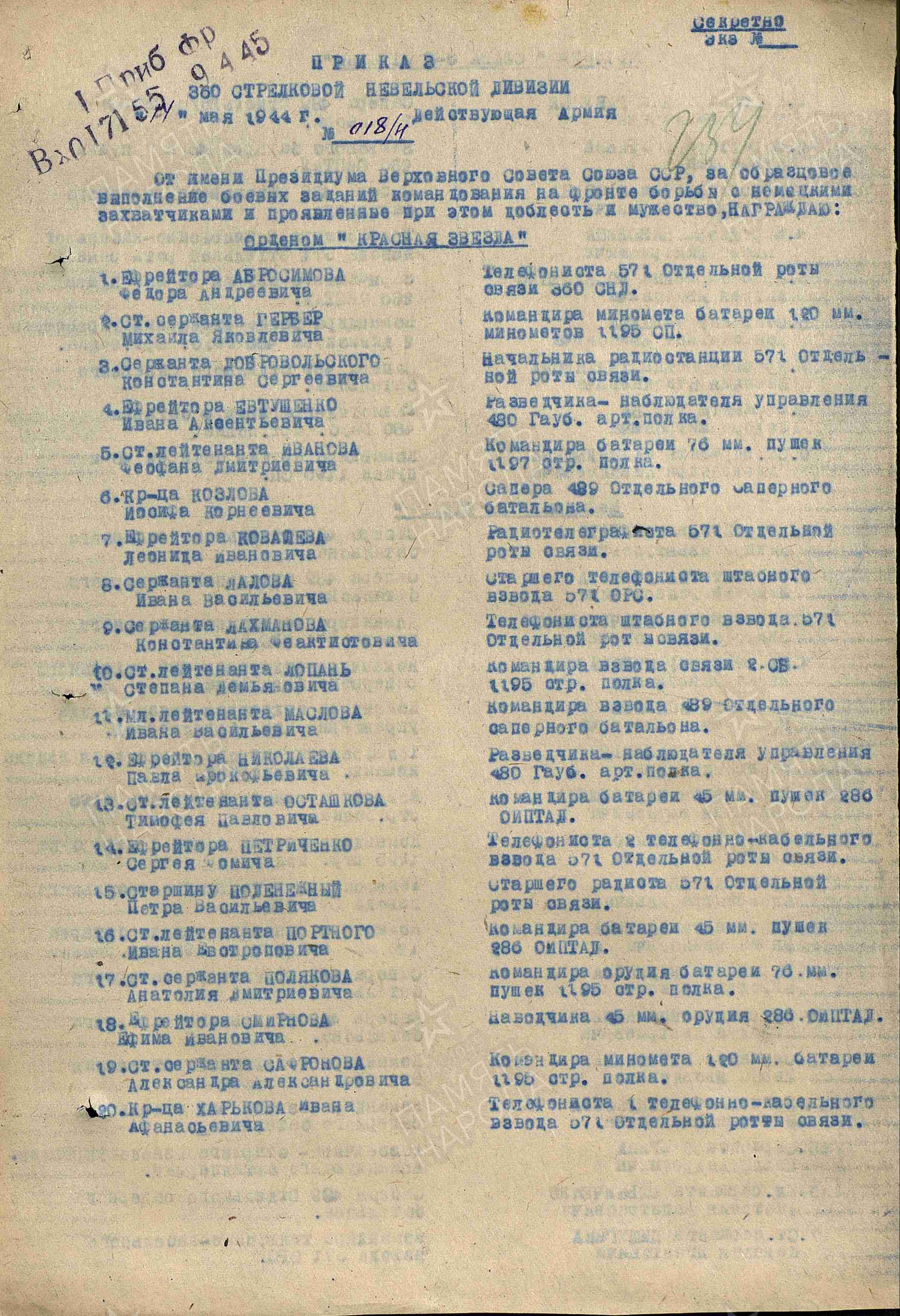 Награжден орденом Красной Звезды (1943 г.), орденом Славы III степени (1944 г.), орденом Отечественной войны II степени (1945 г.), медалью «За отвагу» (1942 г.), медалью «За победу над Германией в Великой Отечественной войне 1941–1945 гг.». Воинское звание: ст. сержант; старшина; сержант; лейтенант. Воинская часть: 480 гаубичный артиллерийский полк.