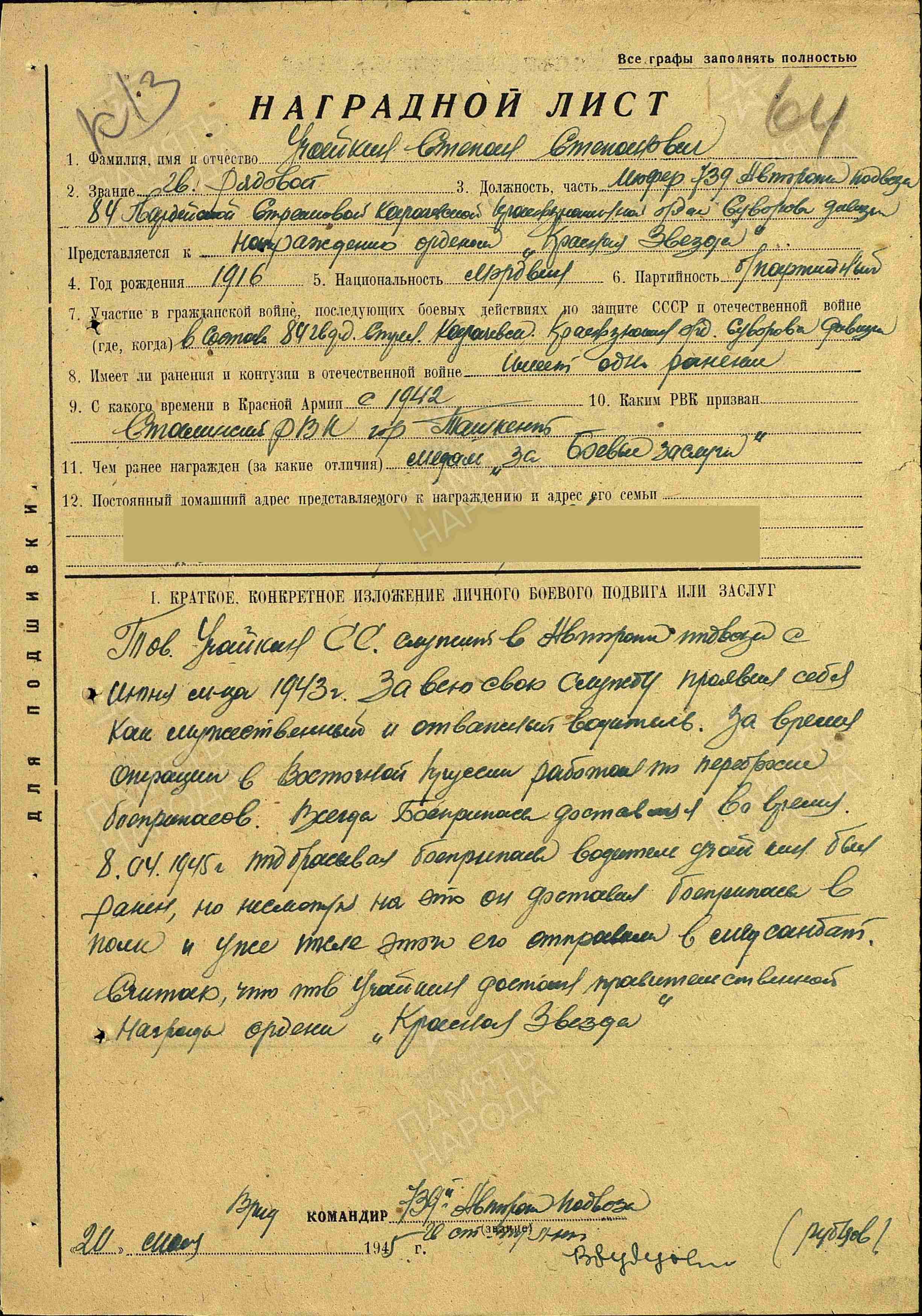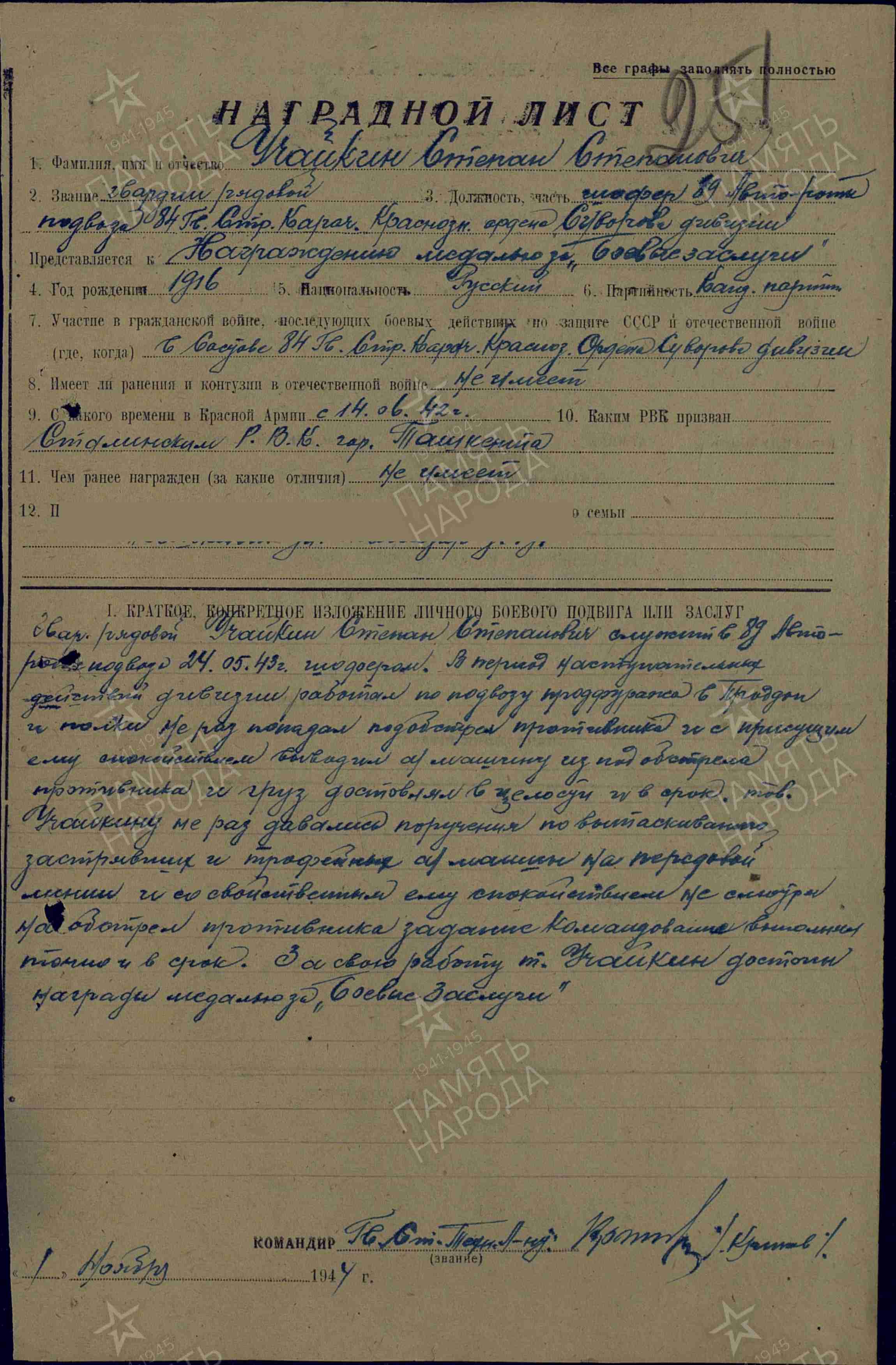 Гвардии рядовой, стрелок, шофёр. Призван Сталинским РВК г. Ташкента 14 июня 1942 г. Стрелок в 84-ой гв. Карачаевской стрелковой дивизии. После ранения в 1943 г. - шофёр подвоза снарядов и фуража 89-ой автотранспортной роты. Участник боёв за Скугоревские высоты, за Витебск, Великие Луки, Орша, Борисов, Минск, Вильнюс, Каунас, Кенигсберг. Награждён орденом Красной Звезды (апрель 1945 г.), медалью «За отвагу» (ноябрь 1944 г.), орденом Отечественной войны II степени (1985 г.). Демобилизован в феврале 1946 г. Жена Мария жила в Ташкенте, умерла в 1949 г. С четырьмя детьми Степан Степанович Учайкин вернулся в с. Съезжее. Со второй женой Таисией Дмитриевной воспитали 8 детей. Степан Степанович умер 24 января 1989 г. Похоронен в пос. Заливной.
