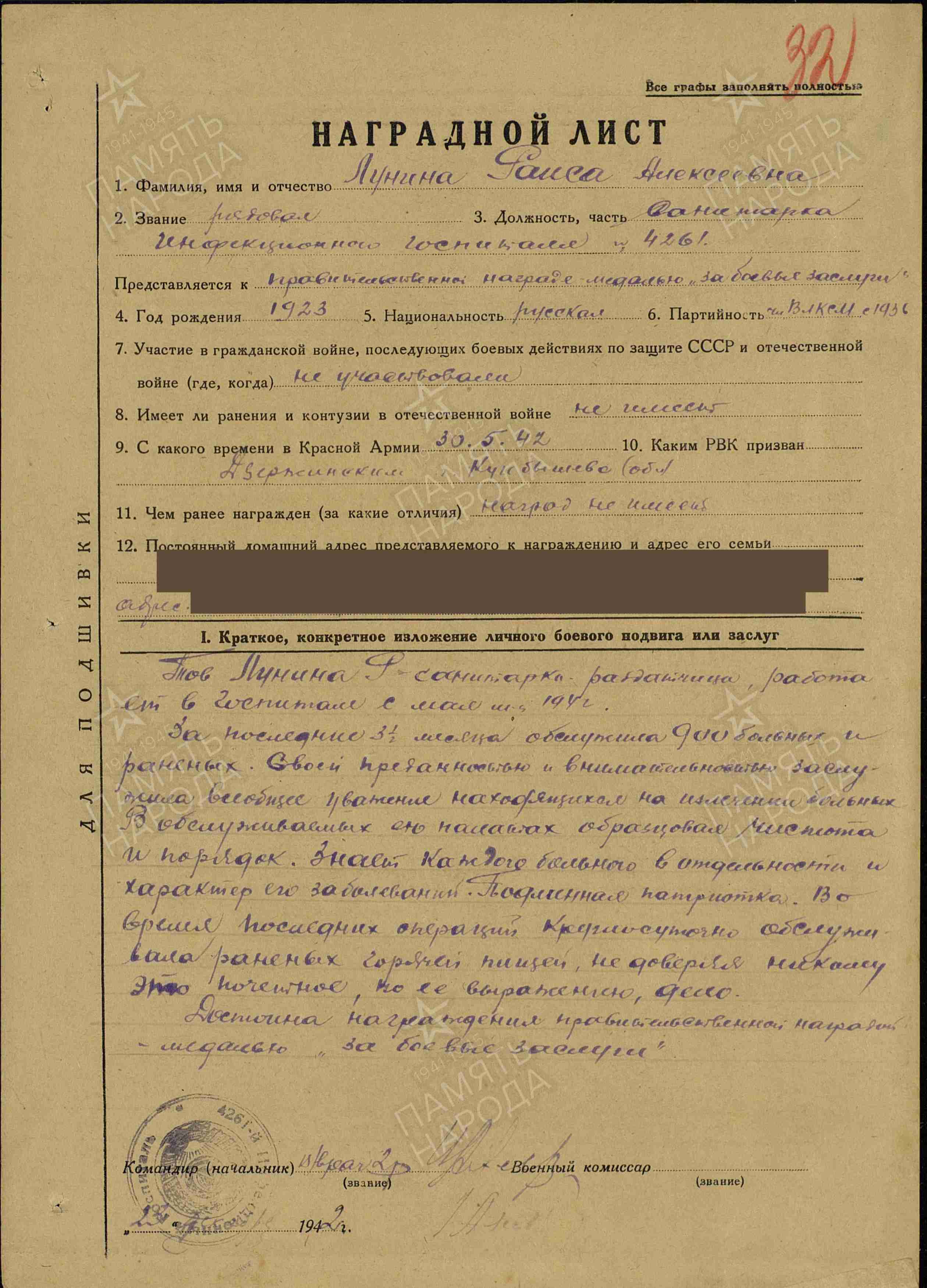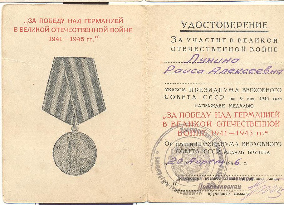 В 1941 году переведена в 10 класс Богатовской средней школы, но учиться не пришлось. Ее старший брат - Сергей Лунин был военным летчиком, на фронте с первых дней войны. Сергей погиб 14 сентября 1941 года.