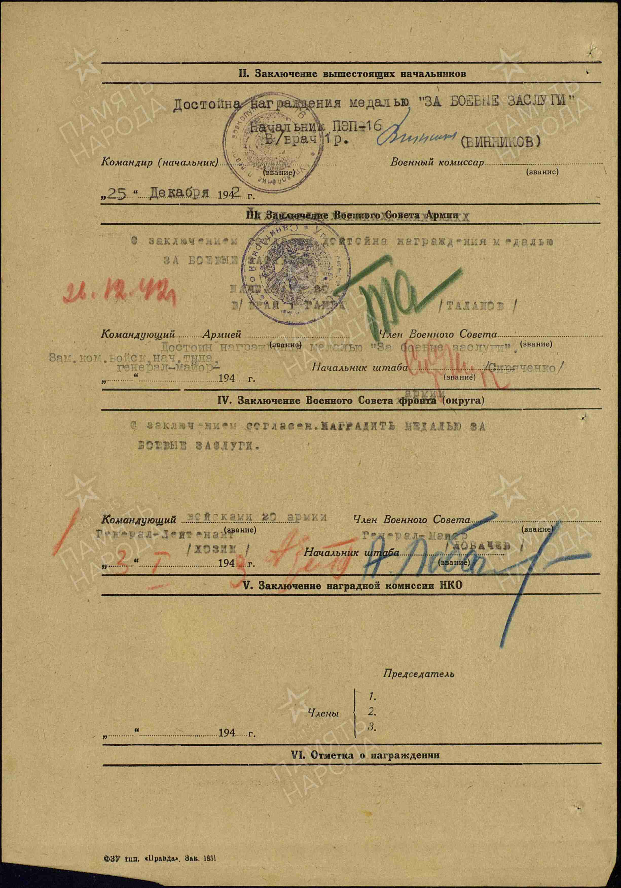 Награды: медали «За оборону Советского Заполярья», «За боевые заслуги», «За победу над Германией в Великой Отечественной войне 1941-1945 гг.».