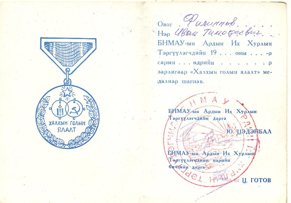 Родился 24 июня 1908 года в с. Заплавное Борского района. До войны служил на Дальнем Востоке, где участвовал в боях в связи с событиями в Монголии. Его первая награда за службу - медаль за Халкин-Гол. Сначала это был знак «Халкин-Гол» (1939 г.), затем уже в 1966 году знаку был придан статус медали Указом Президиума Великого Народного Хурала Монголии. На фронтах Великой Отечественной войны Иван Тимофеевич воевал с первых дней.