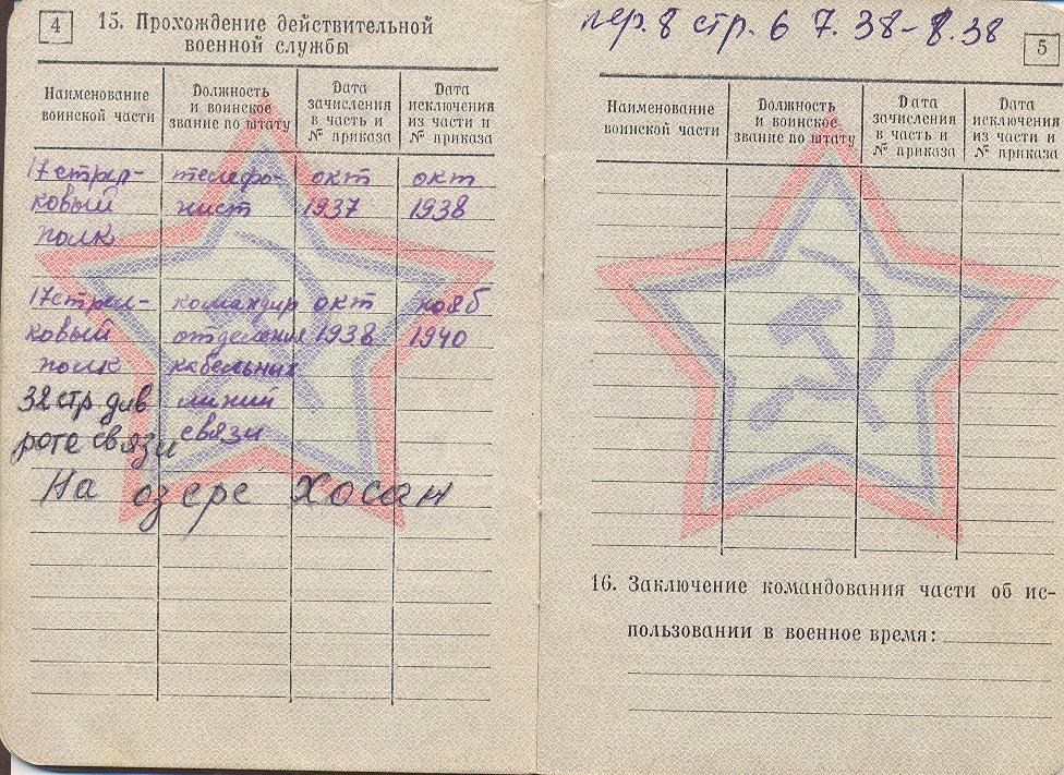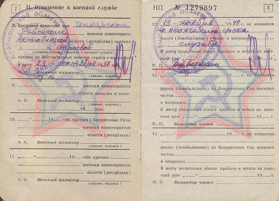 Находясь в Актюбинской области, работал стрелочником на разъезде 62. Отсюда и был призван в армию 23 сентября 1937 г. Принимал участие в боевых действиях в ходе советско-японского конфликта в июле 1938 года на озере Хасан.