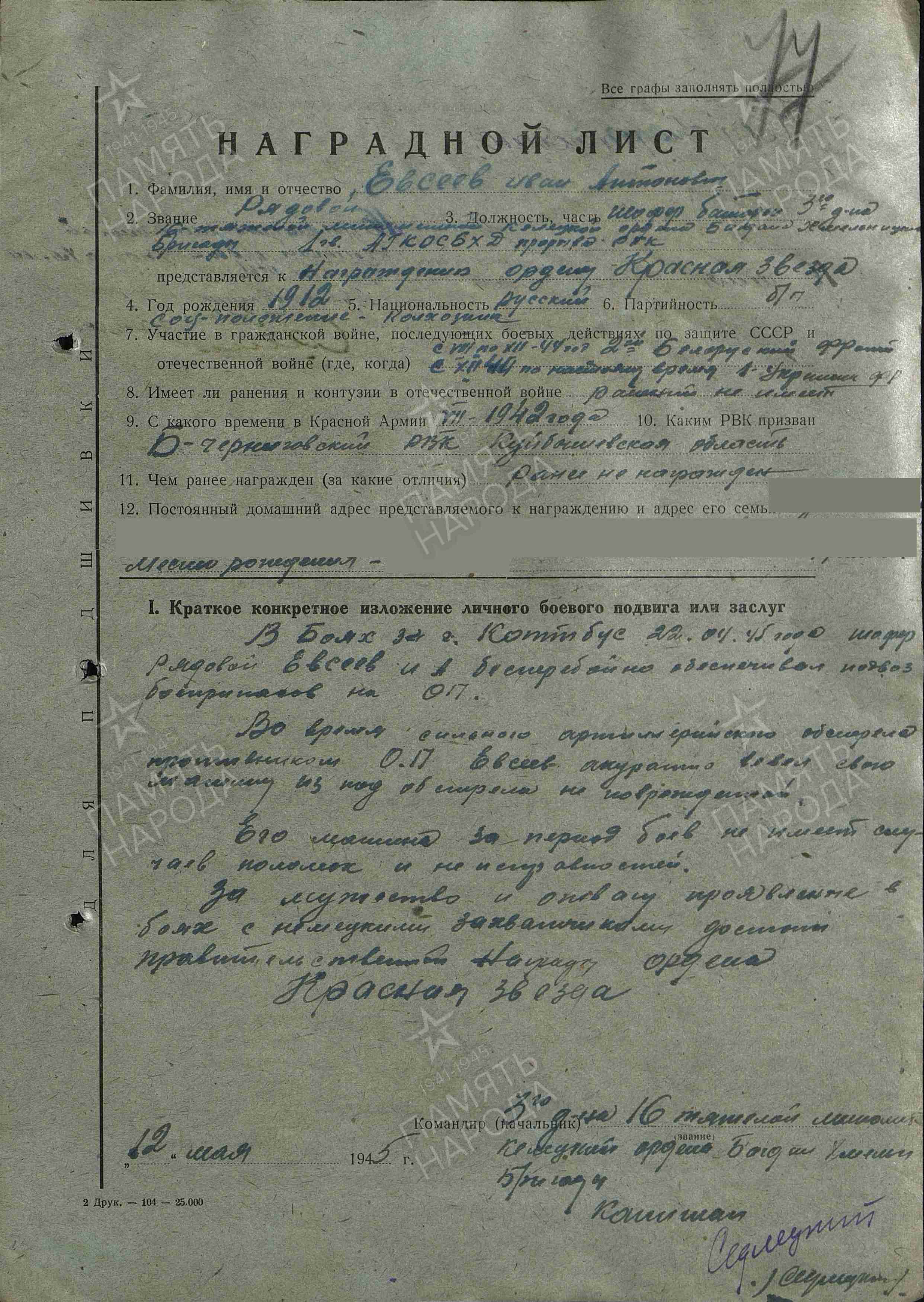 Информация из Наградного листа от 12 мая 1945 года: «В боях за г. Коттбус 22.04.45 года шофер рядовой Евсеев И.А. бесперебойно обеспечивал подвоз боеприпасов на ОП. Во время сильного артиллерийского обстрела противником ОП Евсеев аккуратно вывел свою машину из-под обстрела не поврежденной. Его машина за период боев не имеет случаев поломок и неисправностей. За мужество и отвагу, проявленные в боях с немецкими захватчиками, достоин Правительственной награды ордена Красная Звезда».