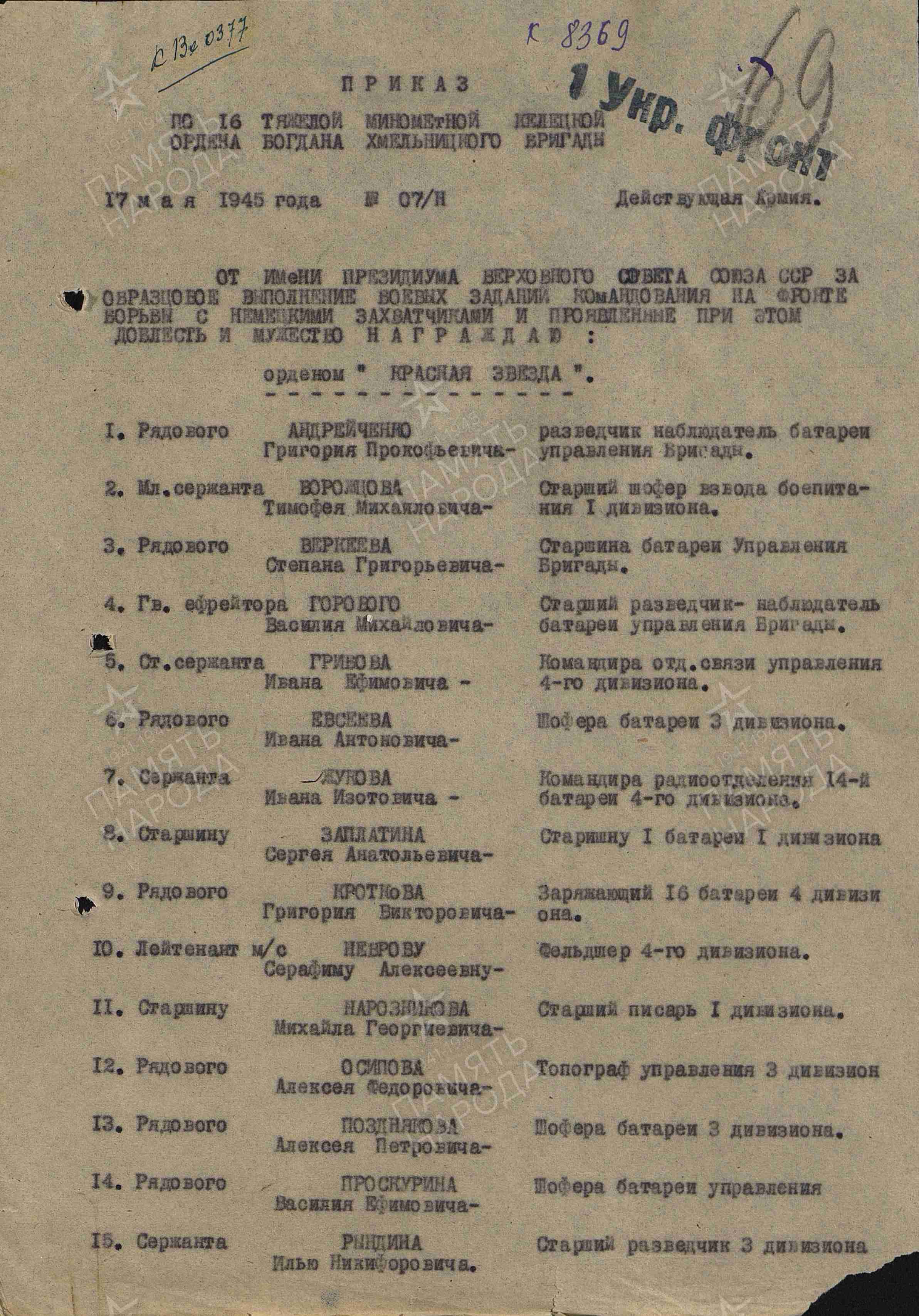 1912 года рождения. Призван Больше-Черниговским РВК 23 июня 1941 г. Рядовой, позднее старший сержант. Военный шофер. С августа по декабрь 1944 года воевал в составе 2 Белорусского фронта, с декабря 1944 г. по май 1945 года в составе 1 Украинского фронта.