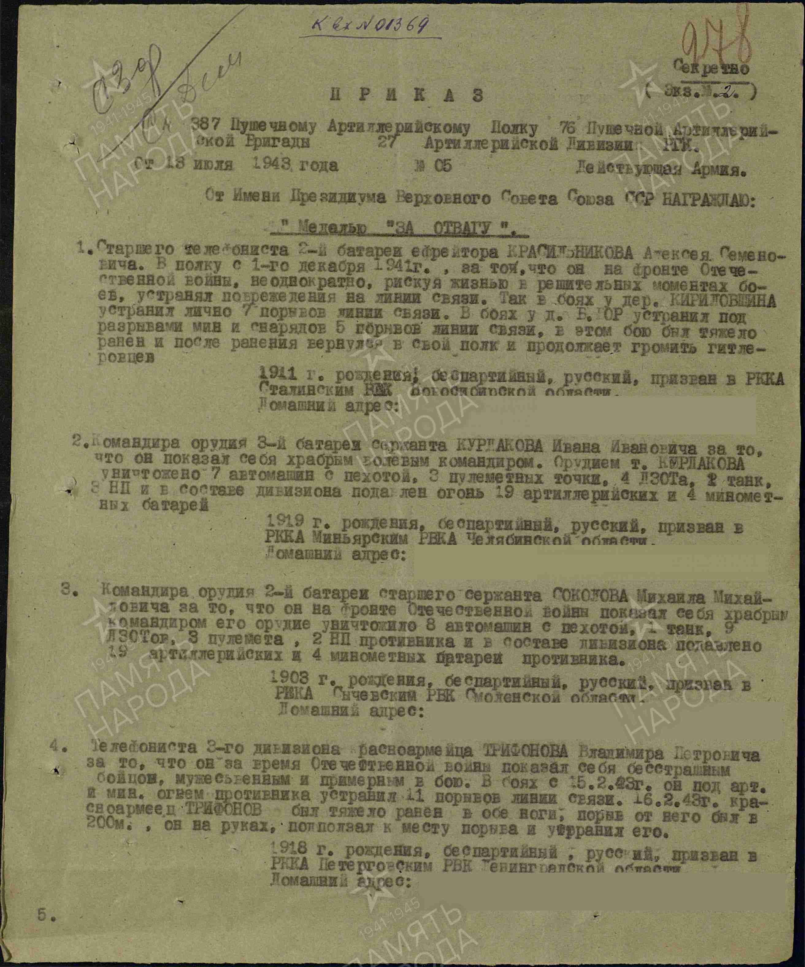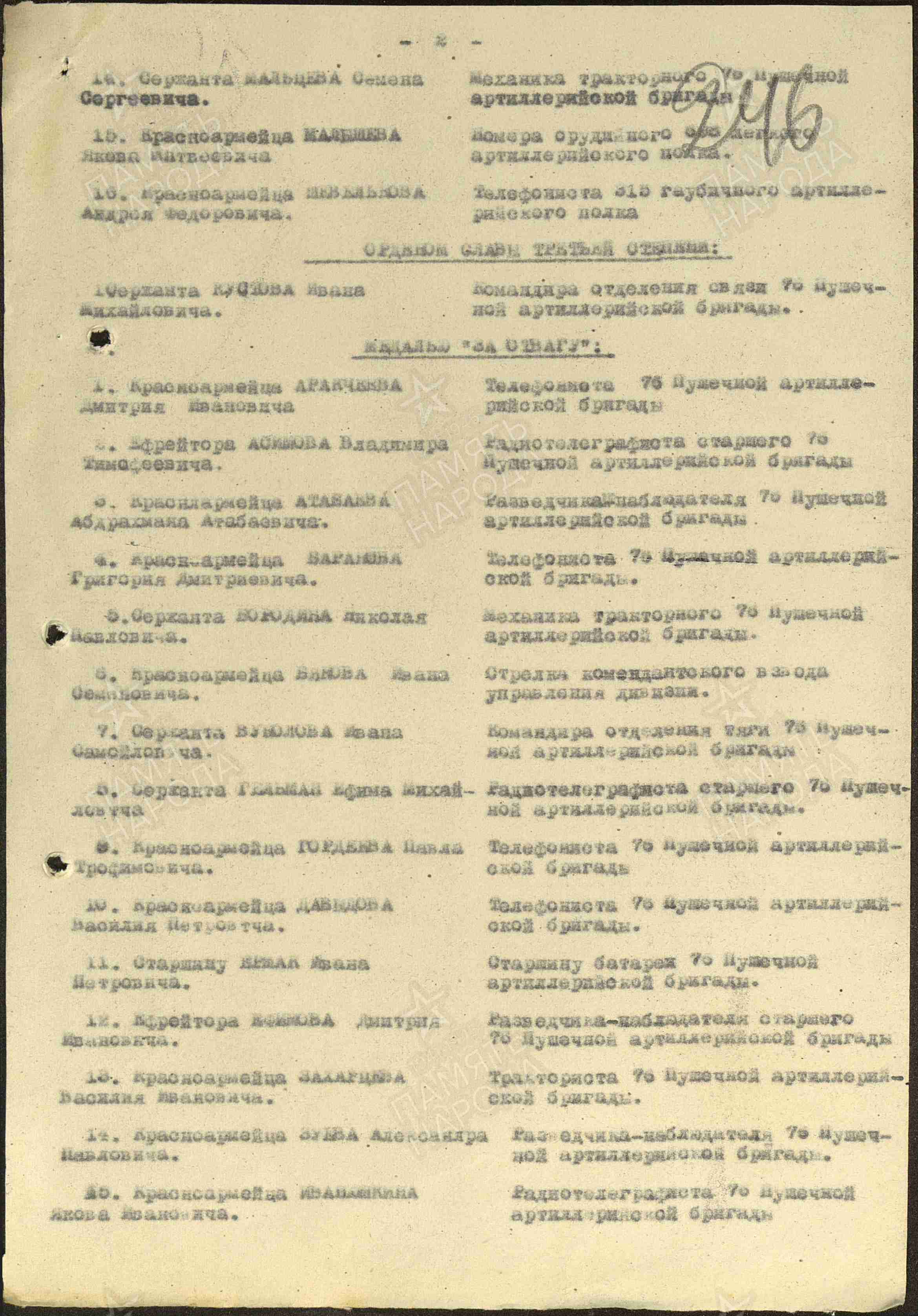 Из приказа от 13 июля 1943 года о награждении медалью "За боевые заслуги": «Командира отделения тяги 2-го д-на (дивизиона) сержанта Бородина Николая Павловича за то, что он за время Отечественной войны показал себя смелым, инициативным командиром и в любых условиях марша всегда в срок приводил свою материальную часть на боевые порядки, чем обеспечил выполнение боевых задач».