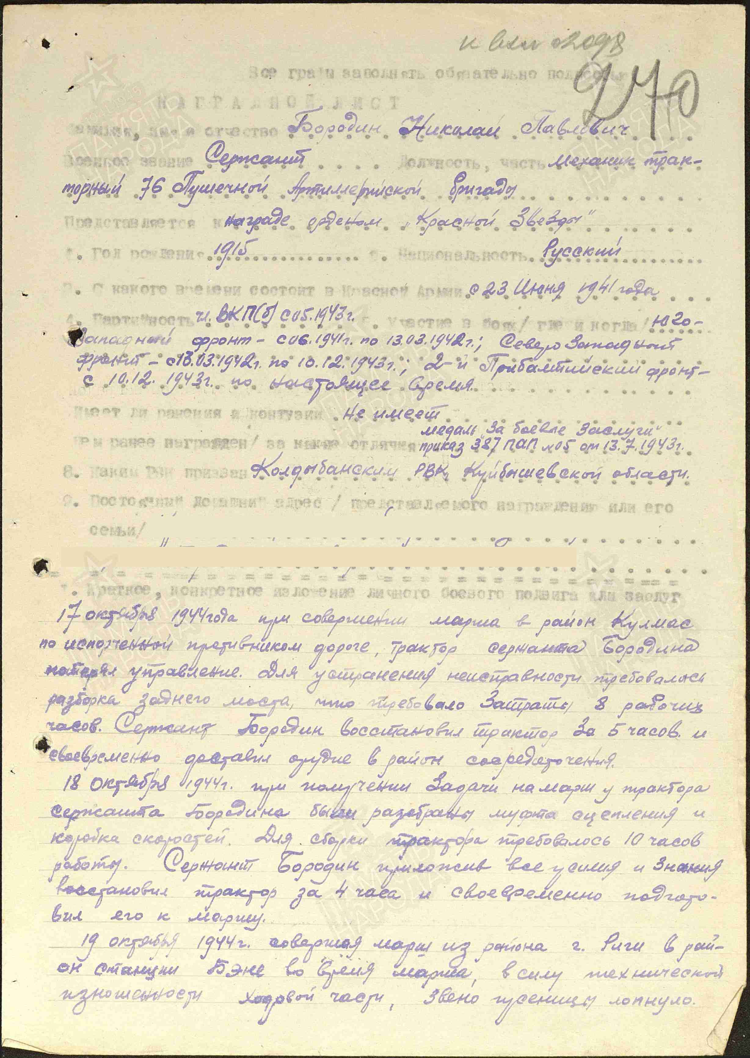 Информация из Наградного листа от 21 октября 1944 года: «17 октября 1944 года при совершении марша в район Кулмас по испорченной противником дороге, трактор сержанта Бородина потерял управление. Для устранения неисправности требовалась разборка заднего моста, что требовало затраты 8 рабочих часов. Сержант Бородин восстановил трактор за 5 часов и своевременно доставил орудие в район сосредоточения. 18 октября 1944 года при получении задачи на марш у трактора сержанта Бородина были разобраны муфта сцепления и коробка скоростей. Для сборки трактора требовалось 10 часов работы. Сержант Бородин, приложив все усилия и знания, восстановил трактор за 4 часа и своевременно подготовил его к маршу.