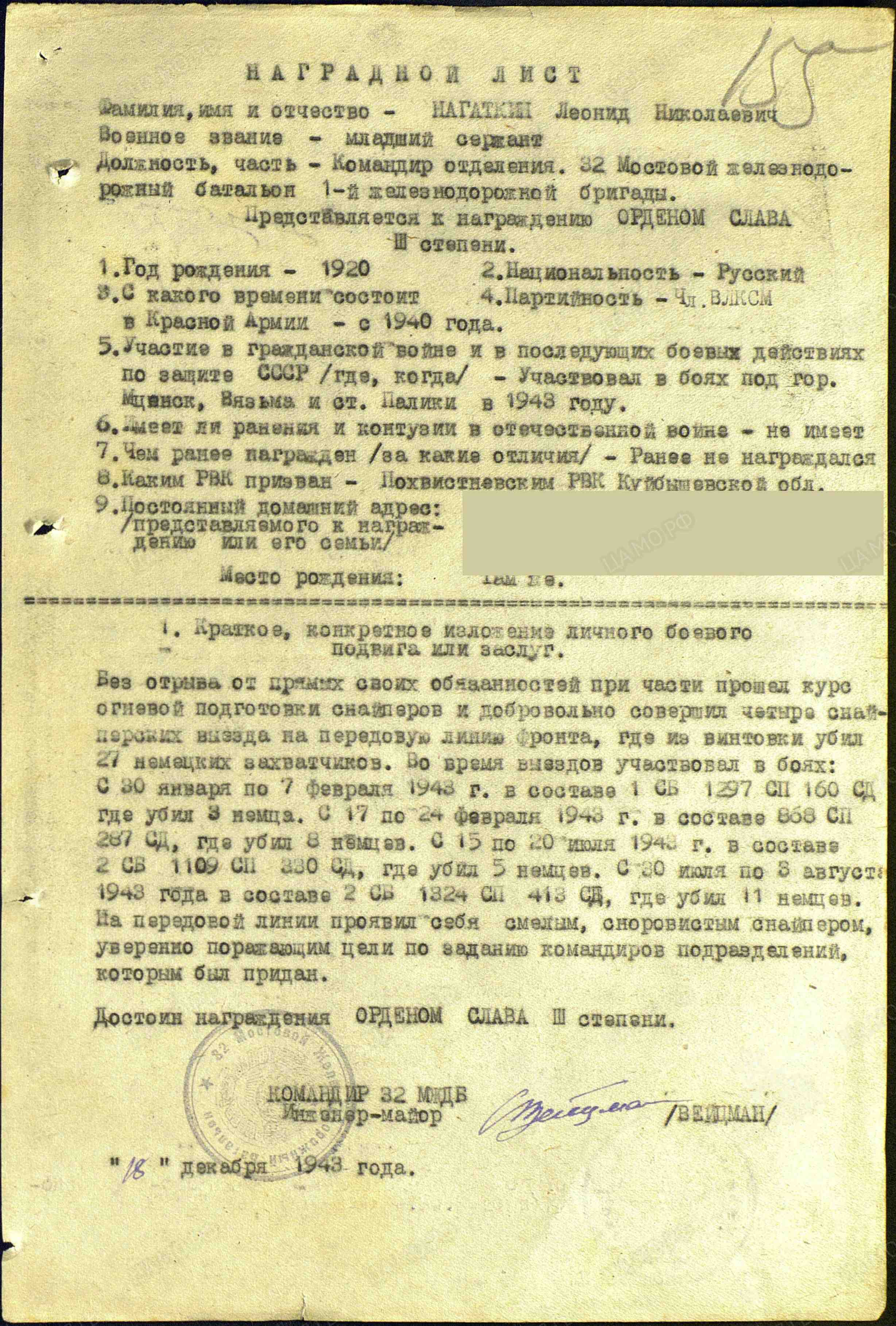 Без отрыва от своих прямых обязанностей при части прошел курс огневой подготовки снайперов и добровольно совершил четыре снайперских выезда на передовую линию фронта, где из винтовки убил 27 немецких захватчиков. Во время выездов участвовал в боях: с 30 января по 7 февраля 1943 г. в составе 1-го стрелкового батальона 1297-го стрелкового полка 160-й стрелковой дивизии, где убил 3-х немцев; с 17 по 24 февраля 1943 г. в составе 868-го стрелкового полка 287-й стрелковой дивизии, где убил 8 немцев; с 15 по 20 июля 1943 г. в составе 2-го стрелкового батальона 1109-го стрелкового полка 330-й стрелковой дивизии, где убил 5 немцев; с 30 июля по 3 августа 1943 г. в составе 2-го стрелкового батальона 1324-го стрелкового полка 413-й стрелковой дивизии, где убил 11 немцев. На передовой линии проявил себя смелым, сноровистым снайпером, уверенно поражающим цели по заданию командиров подразделений, которым был придан. Достоин награждения орденом Славы III степени (награжден медалью "За боевые заслуги"; наградной лист от 18.12.1943 г.).