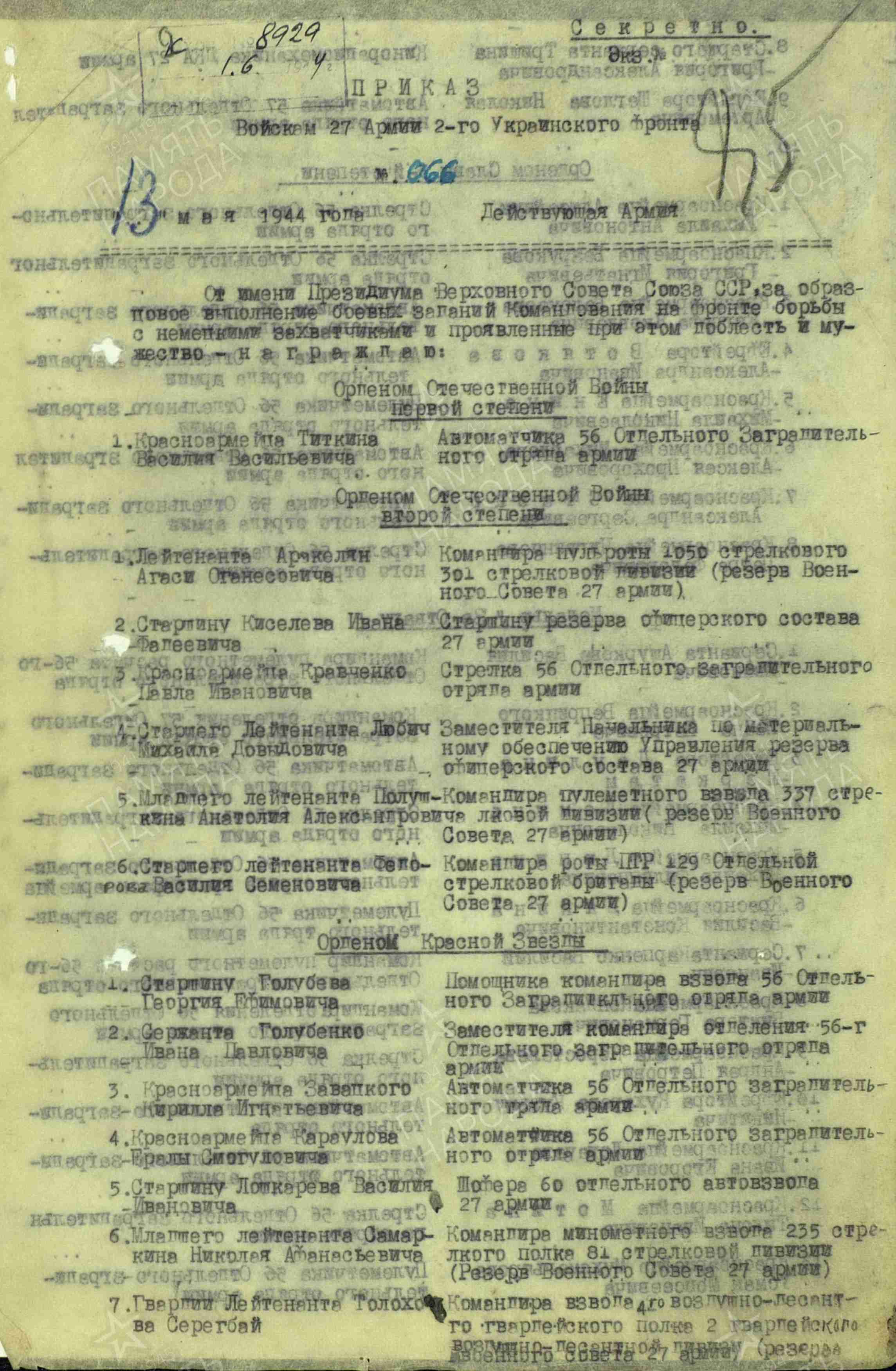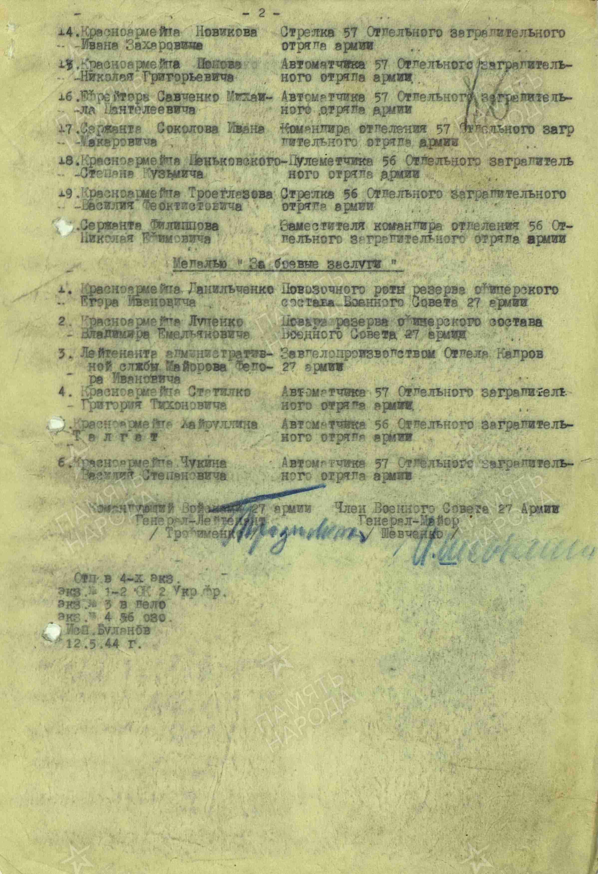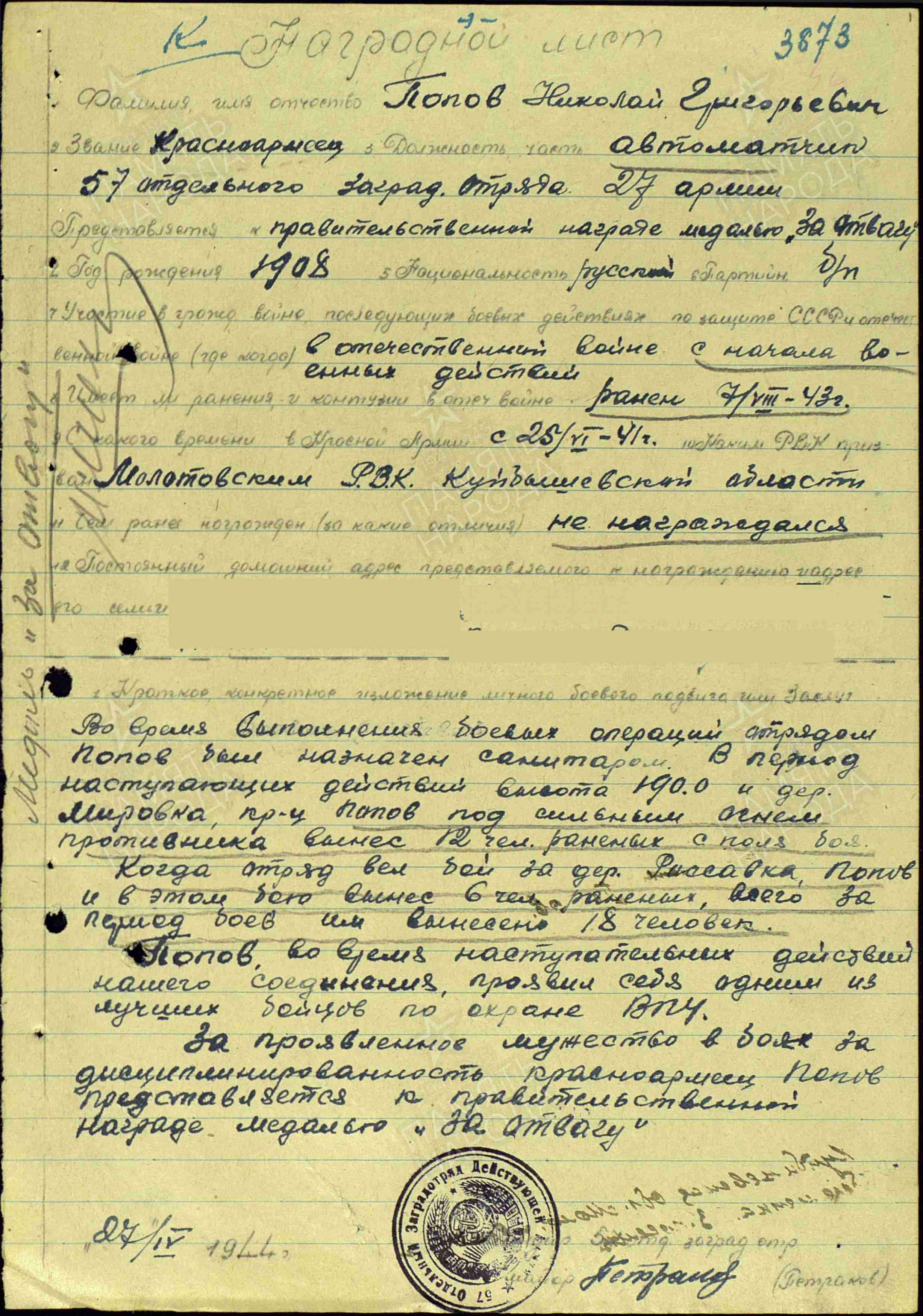 Информация из Наградного листа от 27 апреля 1944 года к медали «За отвагу»: «Во время выполнения боевых операций отрядом, Попов был назначен санитаром. В период наступающих действий высота 190,0 и деревня Мировка красноармеец Попов под сильным огнем противника вынес 12 чел. раненых с поля боя. Когда отряд вел бой за деревню Риссовка, Попов и в этом бою вынес 6 раненых. Всего за период боев им вынесено 18 человек. Во время наступательных действий нашего соединения, проявил себя одним из лучших бойцов по охране ВПУ. За проявленное мужество в боях, за дисциплинированность красноармеец Попов Н.А. представляется к правительственной награде медалью «За отвагу».