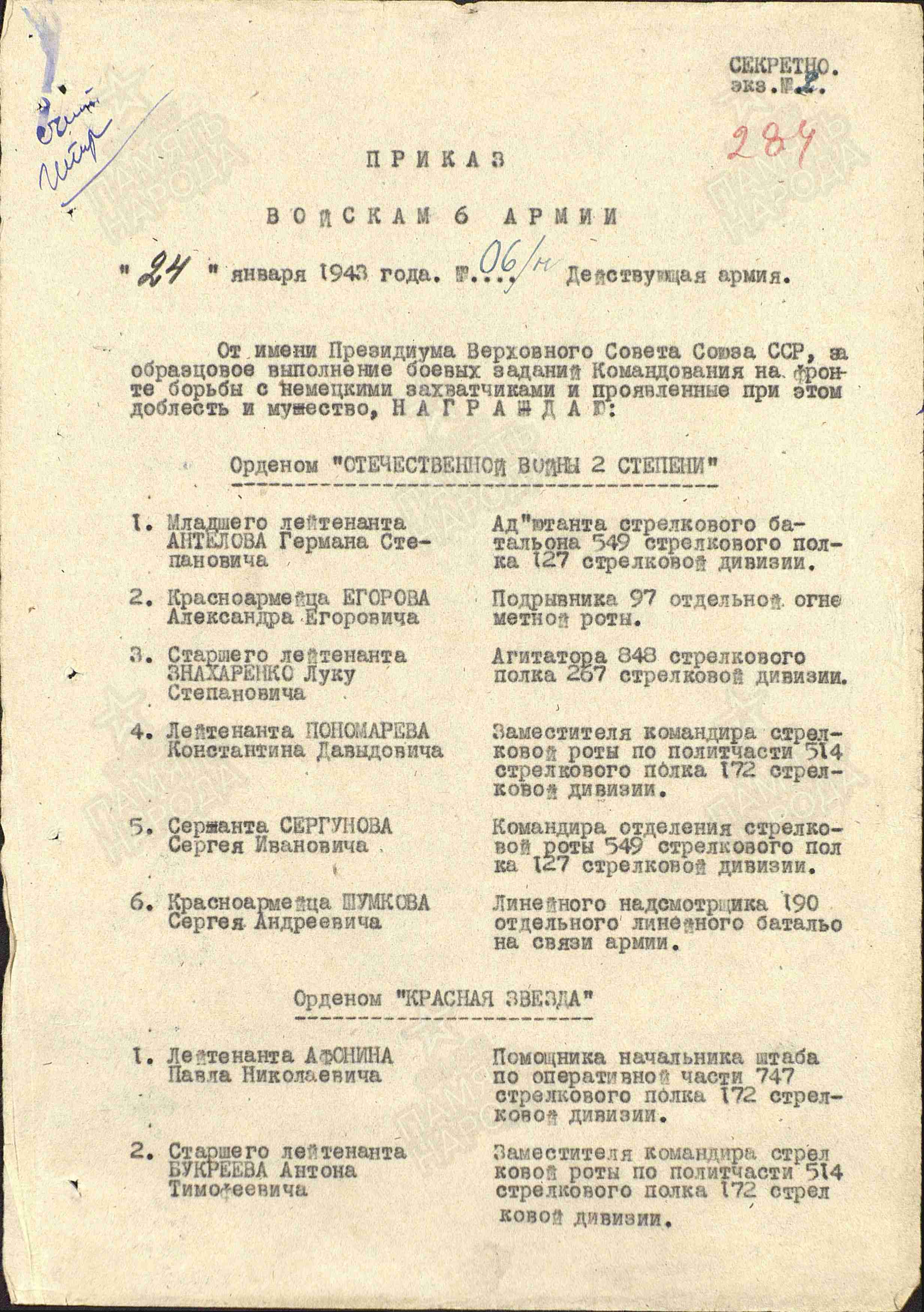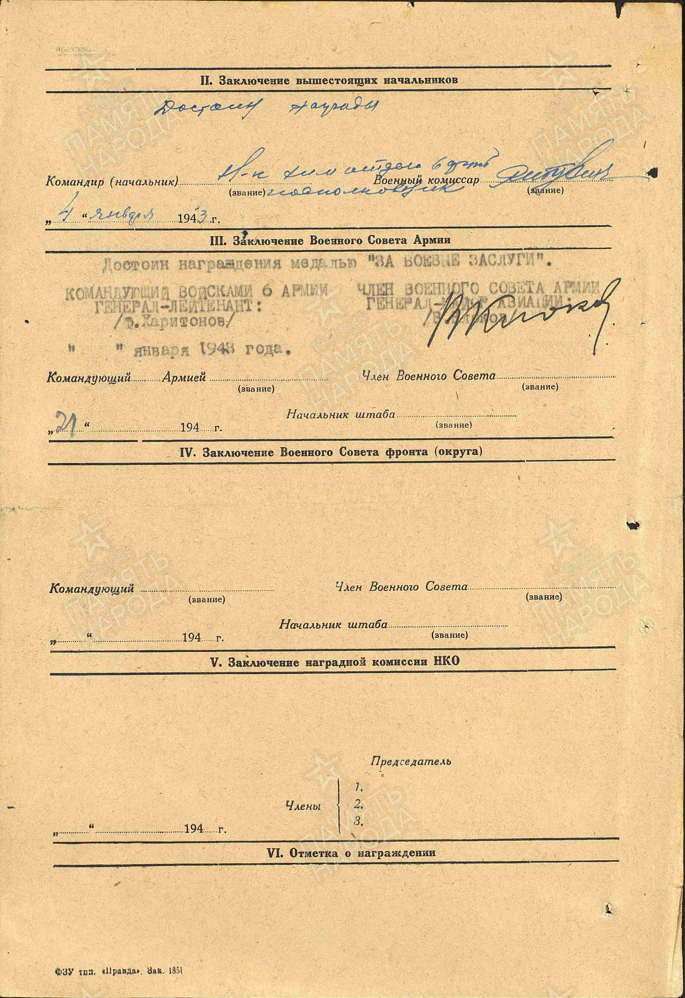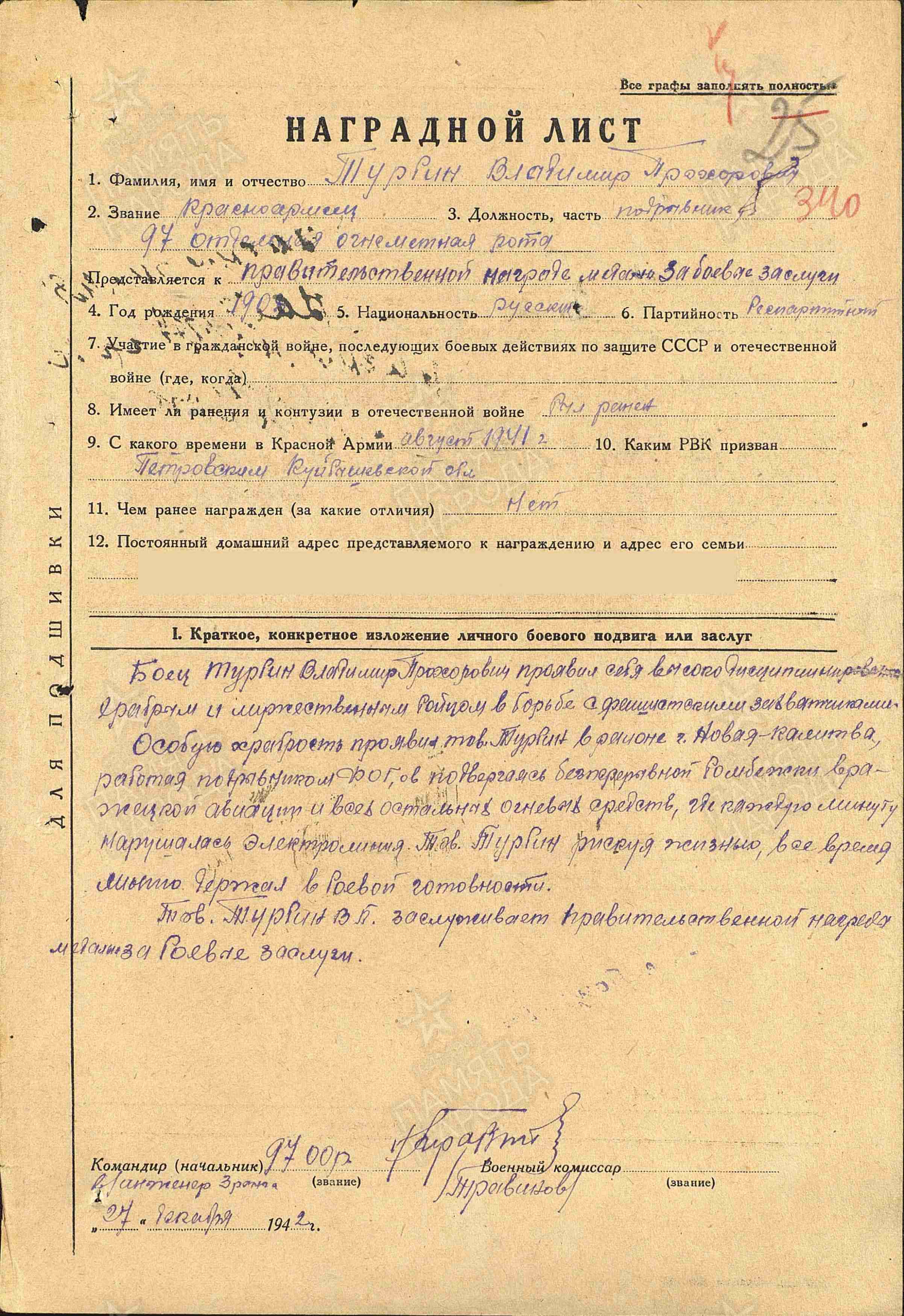 Информация из Наградного листа от 27 декабря 1942 года: «Боец Турбин Владимир Прохорович проявил себя высоко дисциплинированным, храбрым и мужественным бойцом в борьбе с фашистскими захватчиками. Особую храбрость проявил тов. Турбин в районе г. Новая Калитва, работая подрывником ФОГов, подвергаясь беспрерывной бомбежке вражеской авиации и всех остальных огневых средств, где каждую минуту нарушалась электролиния, тов. Турбин, рискуя жизнью, все время … (неразборчиво) держал в боевой готовности. Тов. Турбин заслуживает Правительственной награды медали «За боевые заслуги».