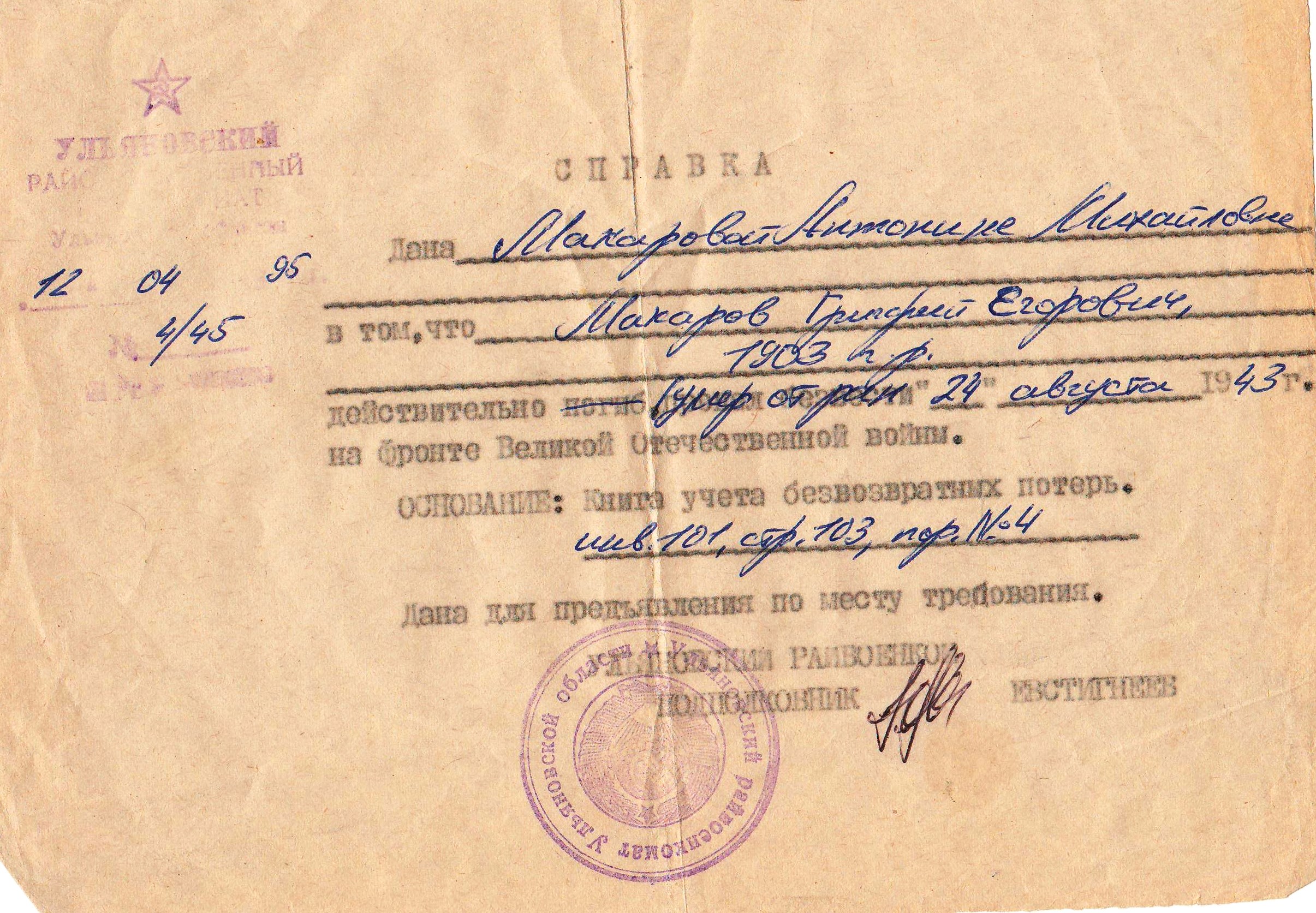 Родился в 1903 году в Ульяновской области (населенный пункт не установлен). Ушел на фронт 9 сентября 1941 г., в этот же день у него родилась младшая дочь Люба. Всего у Григория Егоровича было 5 дочерей. До войны работал бухгалтером в колхозе, имел бронь, но пошел на фронт защищать Родину.
