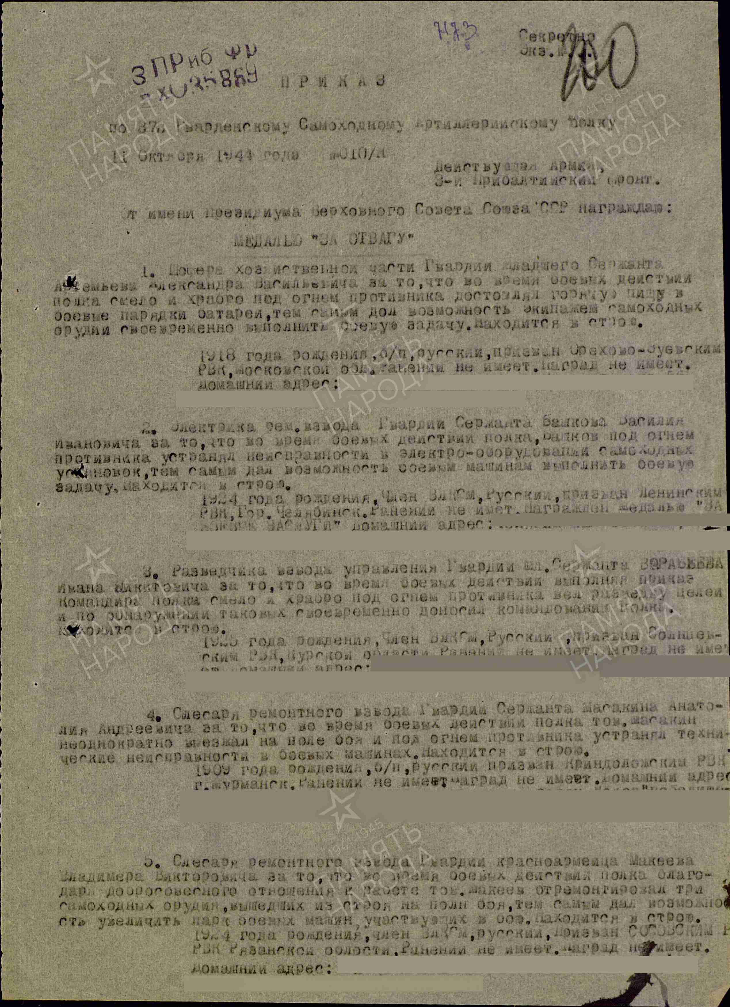 Сергей Васильевич – один из тех, кому довелось стать участников этих великих сражений. Родился он 10 сентября 1925 года в селе Борское. Окончил 4 класса Борской школы в 1937 году. В январе 1943 года 17-летний юноша был призван на военную службу Борским РВК Куйбышевской области и направлен в 6-й отдельный батальон химической защиты в звании химического разведчика, где и принял присягу.