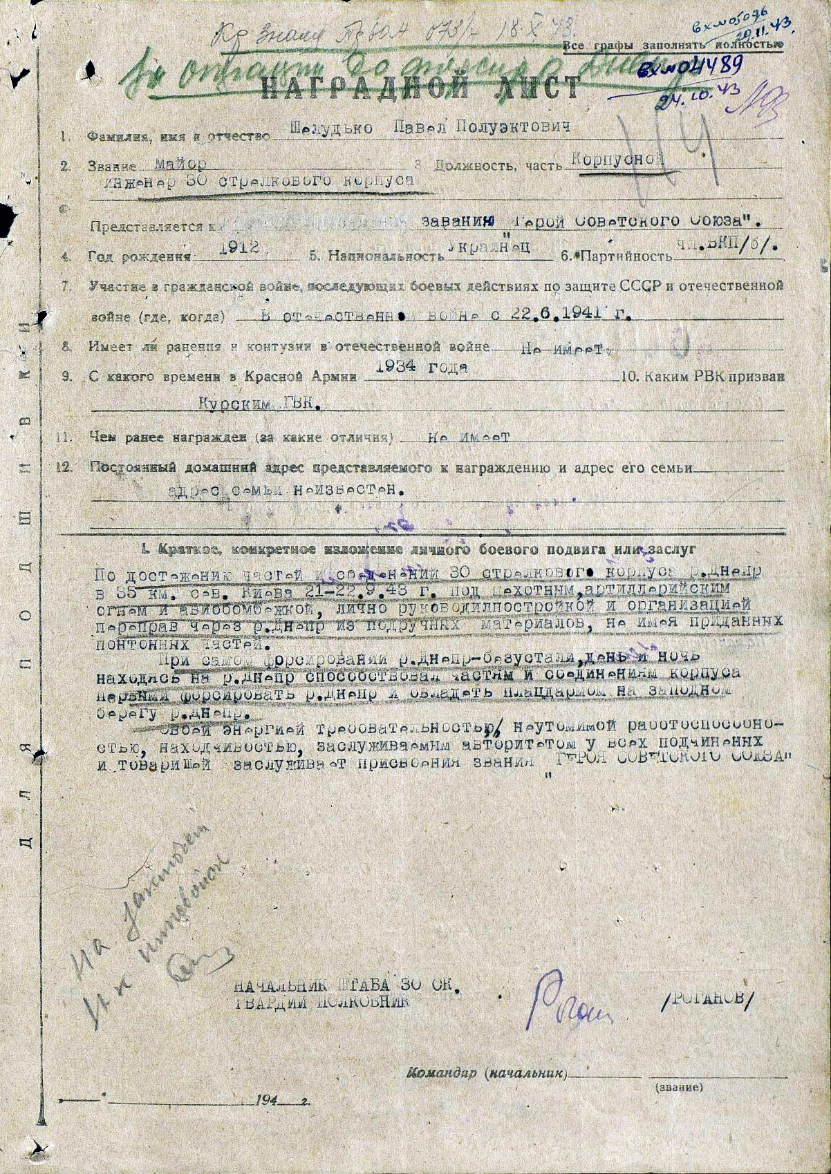 В июне 1943 года майора Шелудько назначают старшим помощником начальника штаба инженерных войск 40-ой Армии. В сентябре 1943 года прадед получает вторую награду - Орден Красного знамени за организацию 10 (десяти!!) переправ (из них шесть подручными средствами) реки Сейм (Курская область).