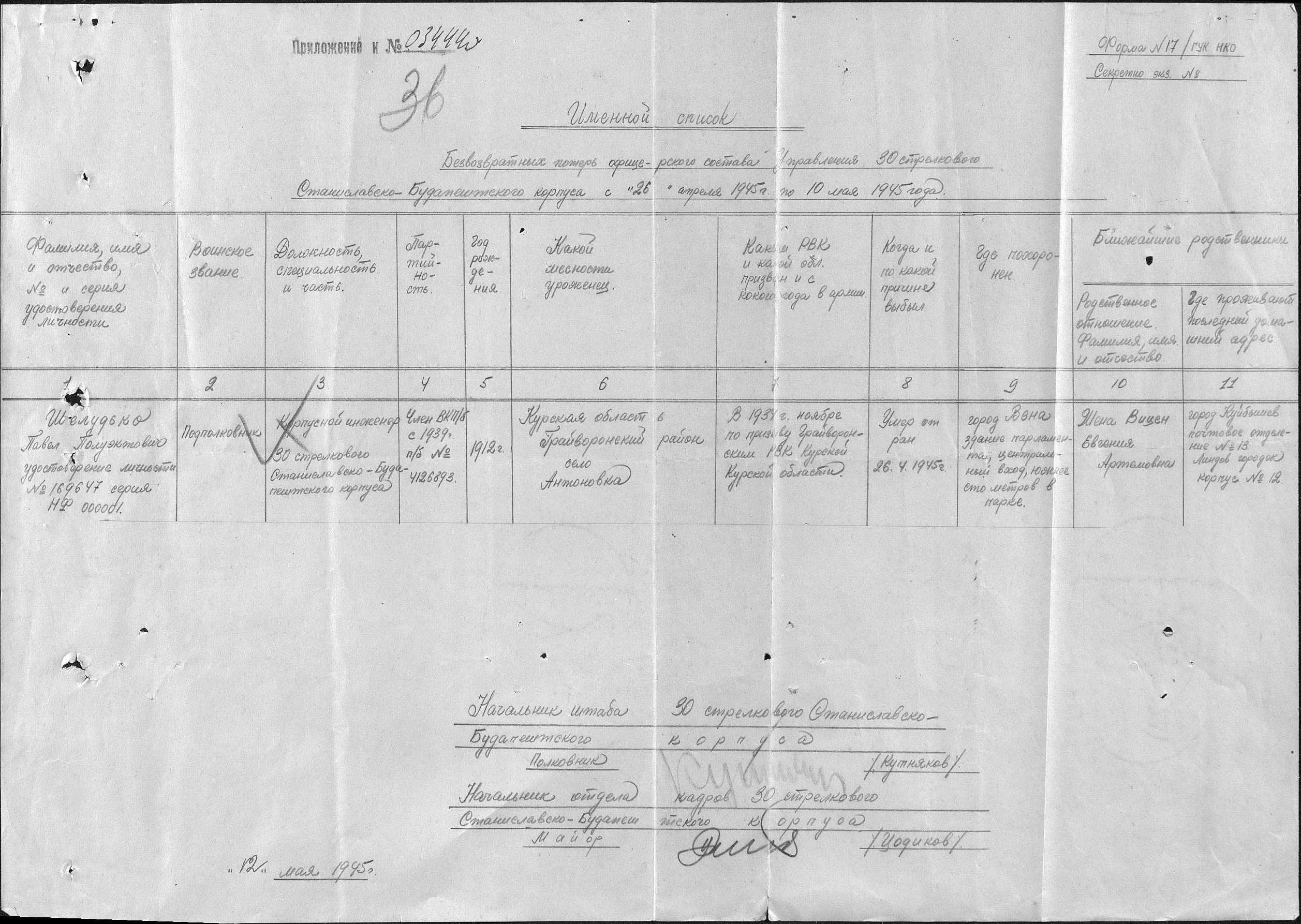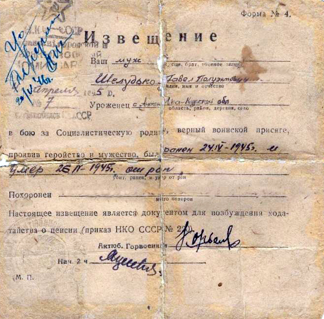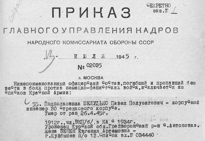 26 апреля 1945 года, в уже освобожденной от фашистов Вене, столице Австрии, Шелудько Павел Полуэктович погибает при расчистке города от оставшихся мин.