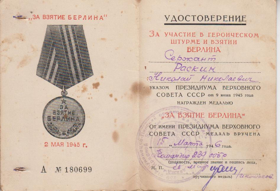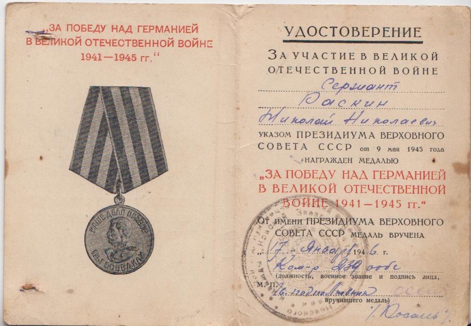 Был женат на односельчанке Раскиной Марии Ефимовне (29.02.1916 - 26.10.2002).