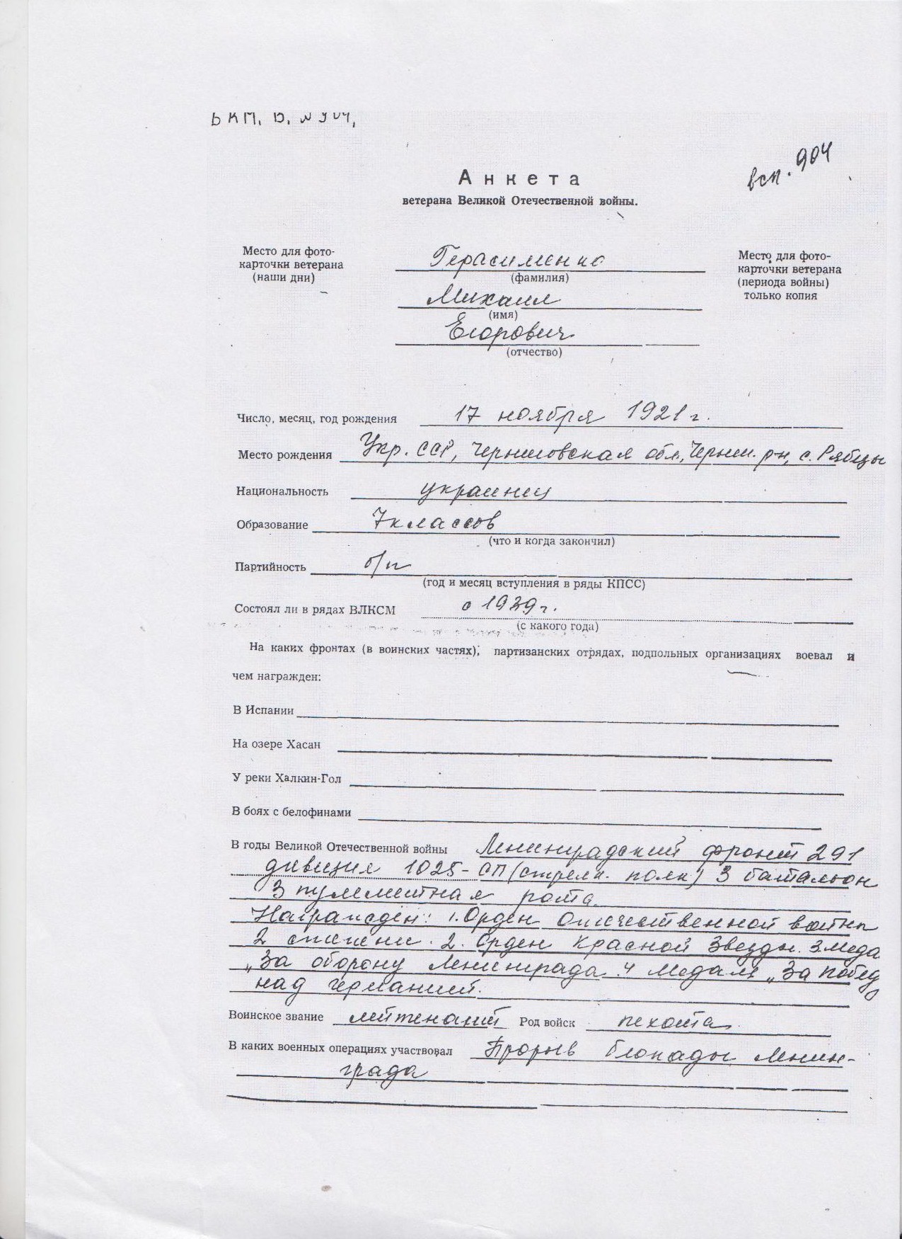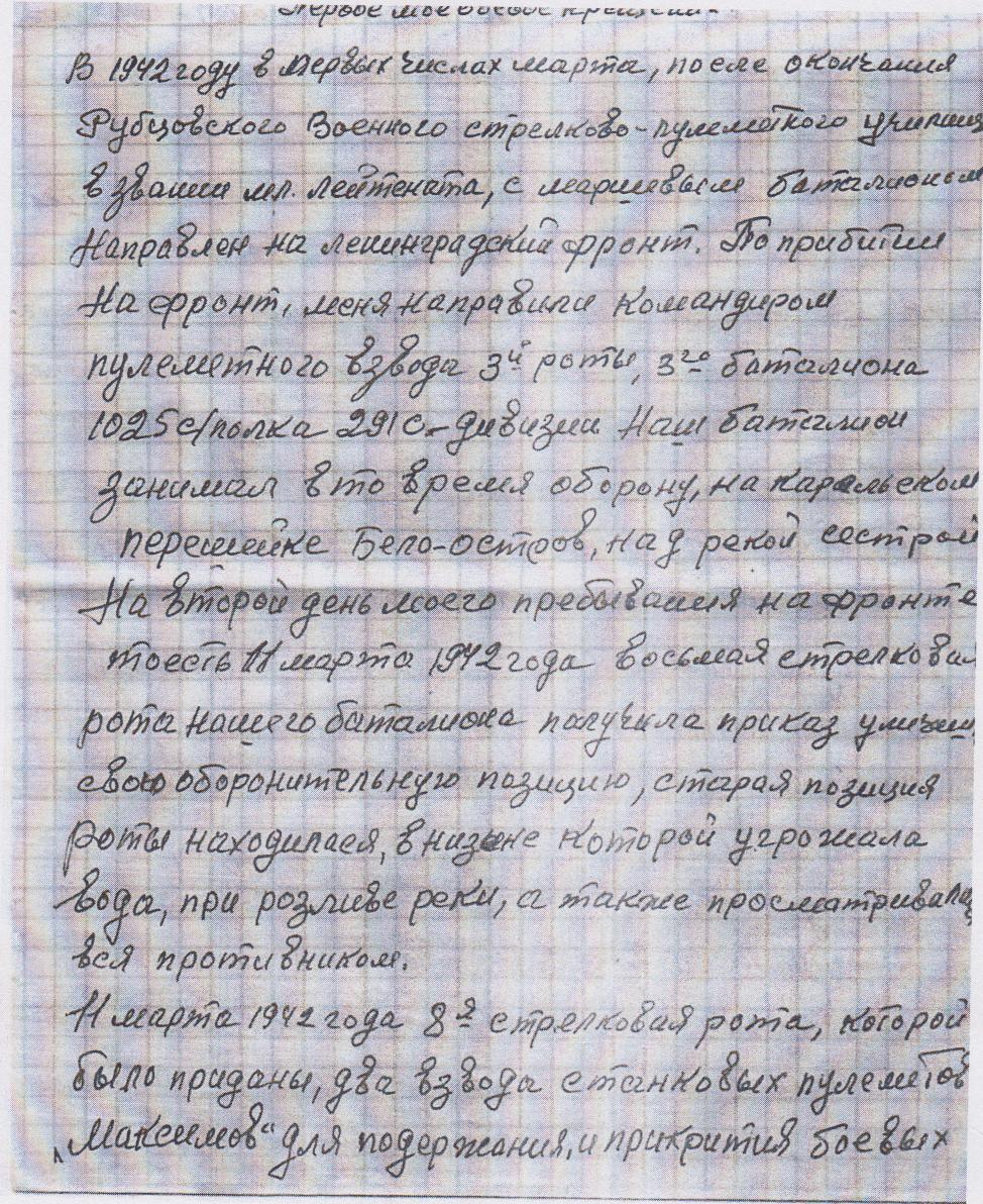 Михаил Егорович родился 17 ноября 1921 в селе Рябцы Черниговского района Черниговской области (Украина). Участник Великой Отечественной войны. Воевал на Ленинградском фронте в составе 291 дивизии, 1025 стрелковый полк, 3 батальон 3 пулеметная рота. Принимал участие в прорыве блокады Ленинграда. Он собственноручно записал свои фронтовые воспоминания (прилагаются).