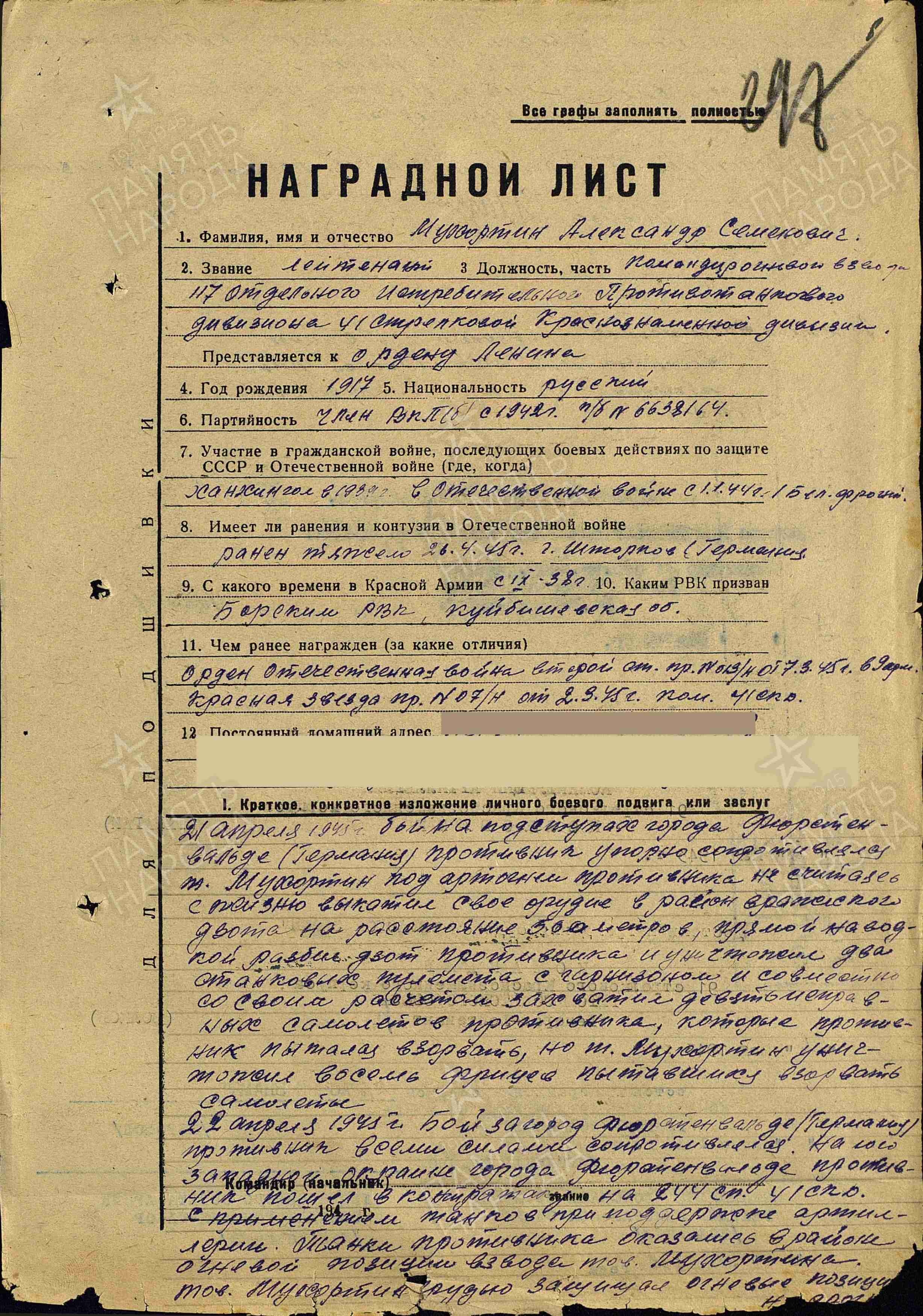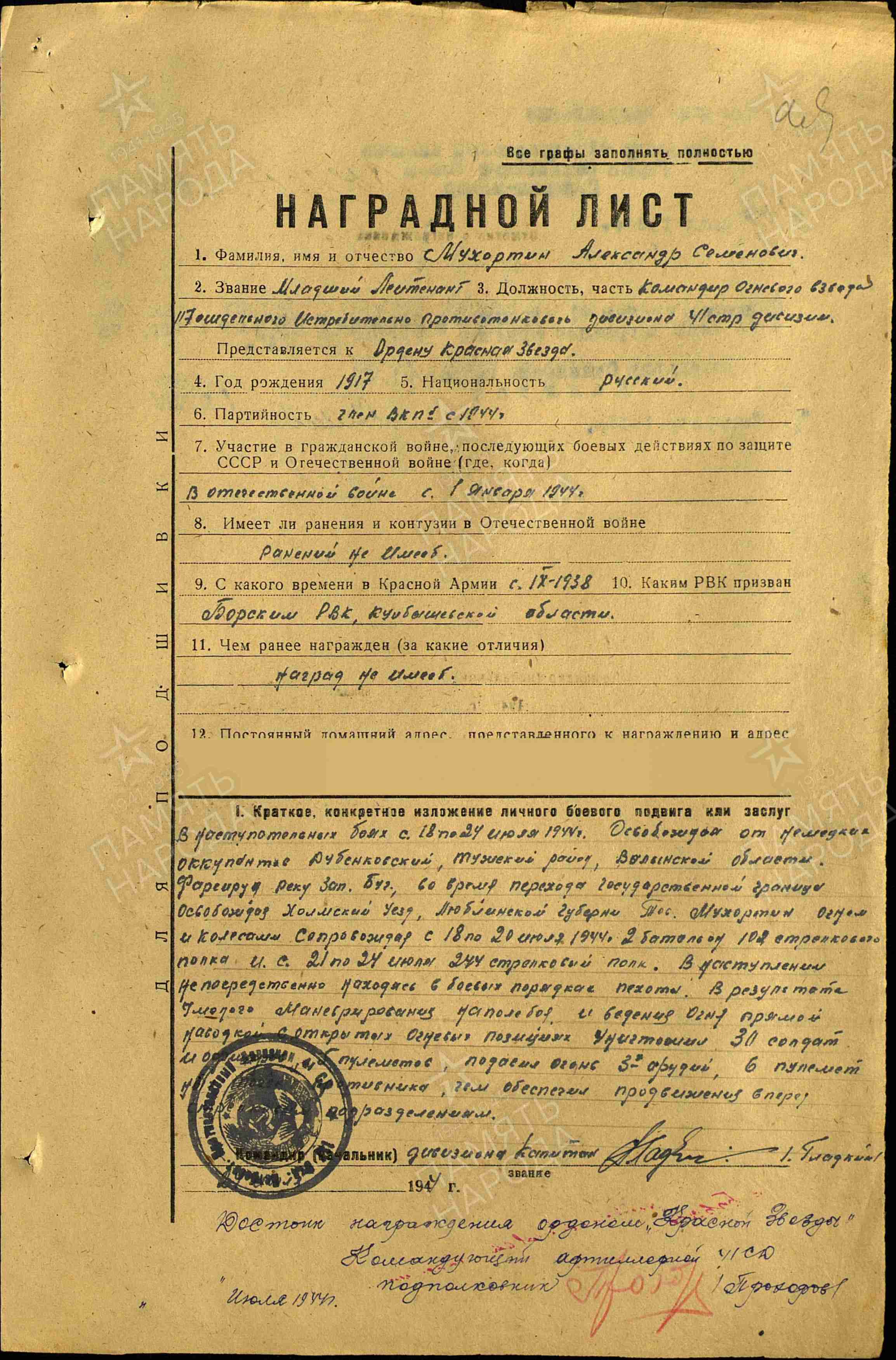 Александр Мухортин родился в 1917 году в селе Борское. До войны работал монтером Борского радиоузла. В 1939 году участвовал в боях на Халхин-Голе в качестве командира радиоотделения 57 Краснознаменной Уральской дивизии, в 1969 году был награжден медалью "30 лет Халхин-Гольской Победы".