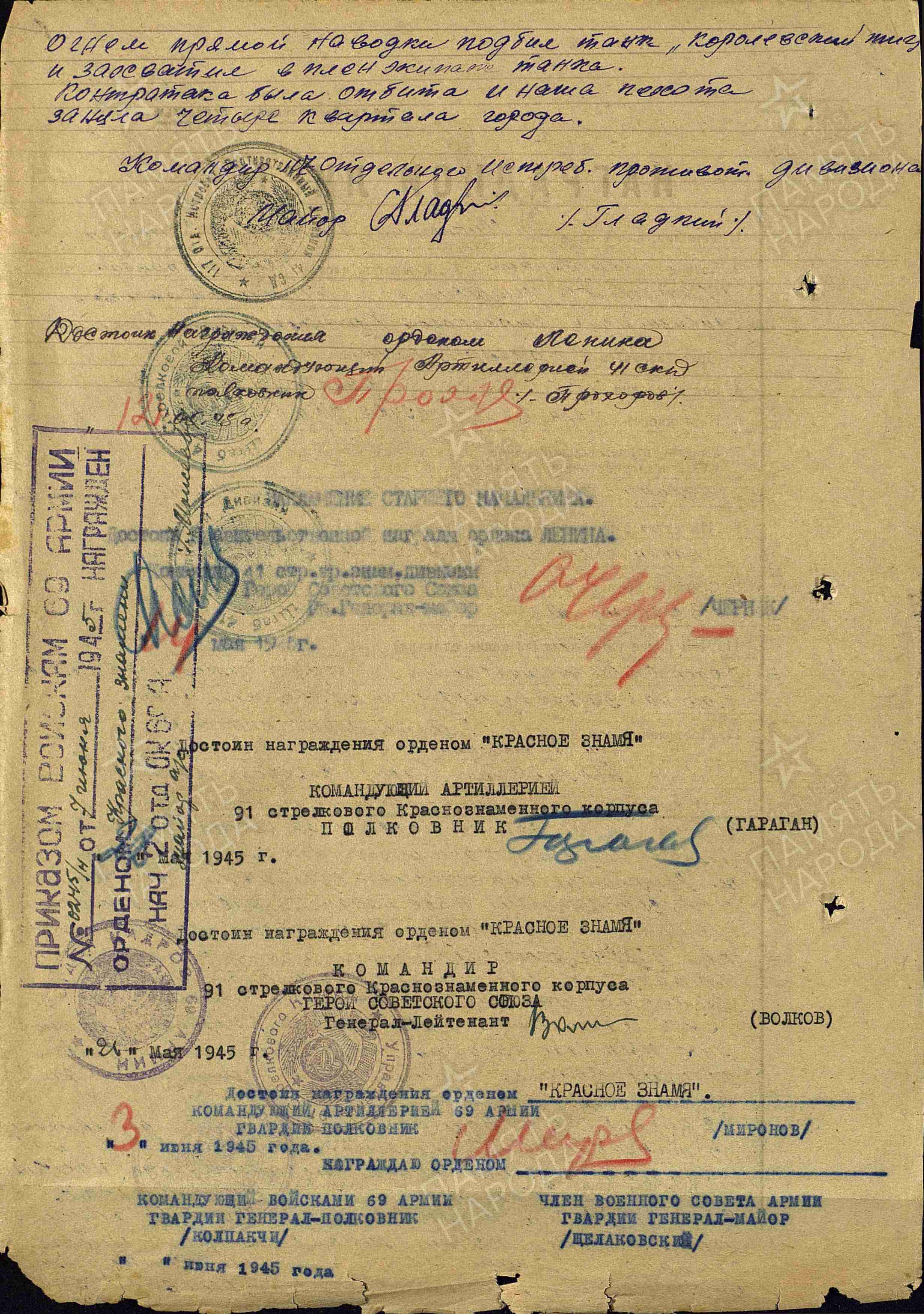 Награды: орден Красной Звезды (дважды), орден Красного Знамени, орден Отечественной войны I и II степени, медали «За взятие Берлина», «За боевые заслуги», «За освобождение Варшавы», «За победу над Германией в Великой Отечественной войне 1941–1945 гг.».
