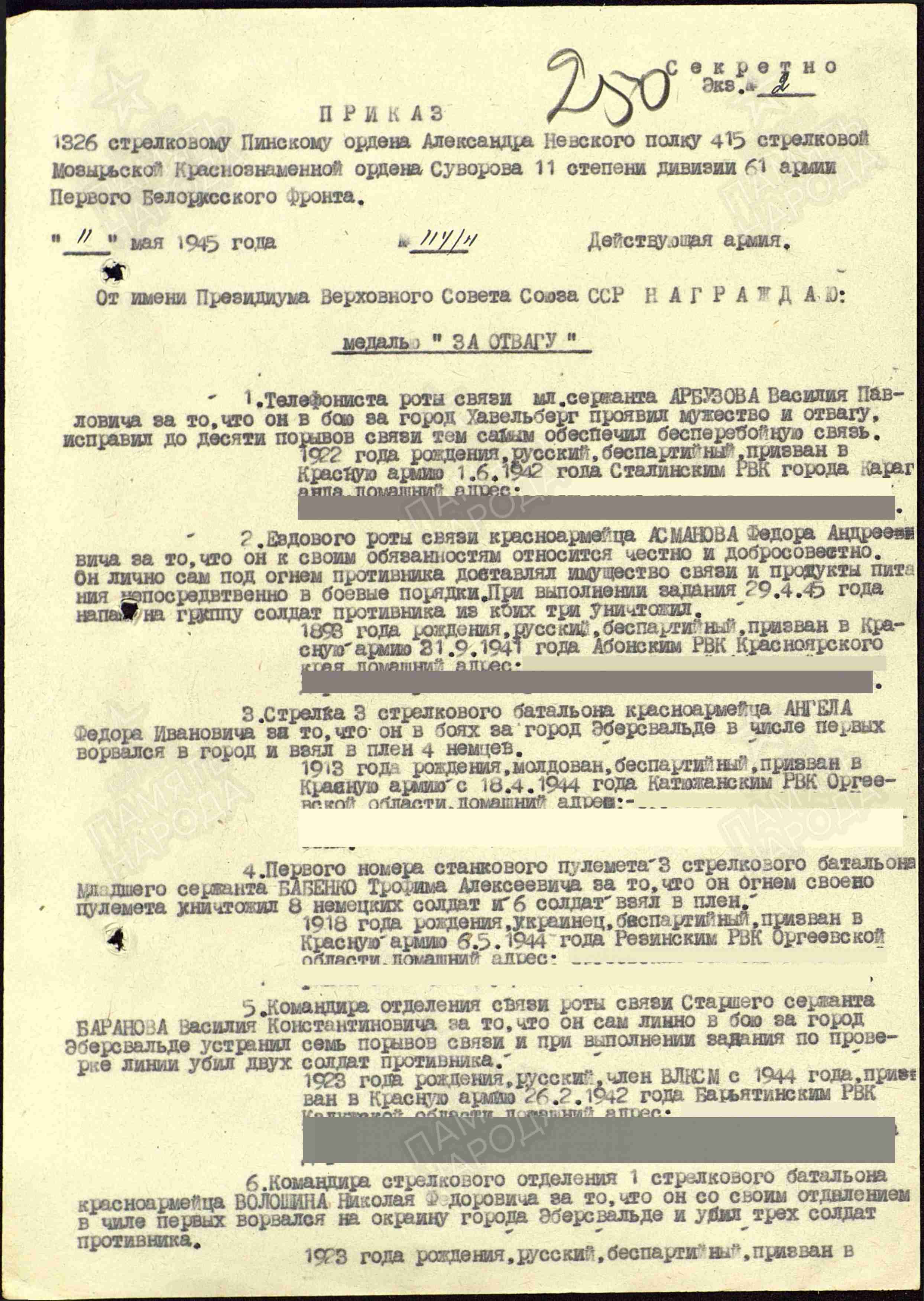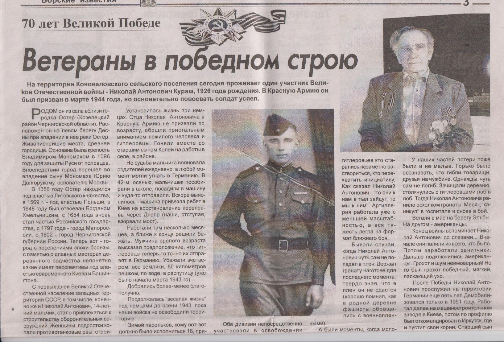 Информация из Приказа от 11 мая 1945 года о награждении медалью «За отвагу»: «наградить стрелка 3 стрелкового батальона красноармейца Кураш Николая Антоновича за то, что он в бою на подступах к городу Эберсвальде захватил в плен 7 немецких солдат и уничтожил из личного оружия 2».
