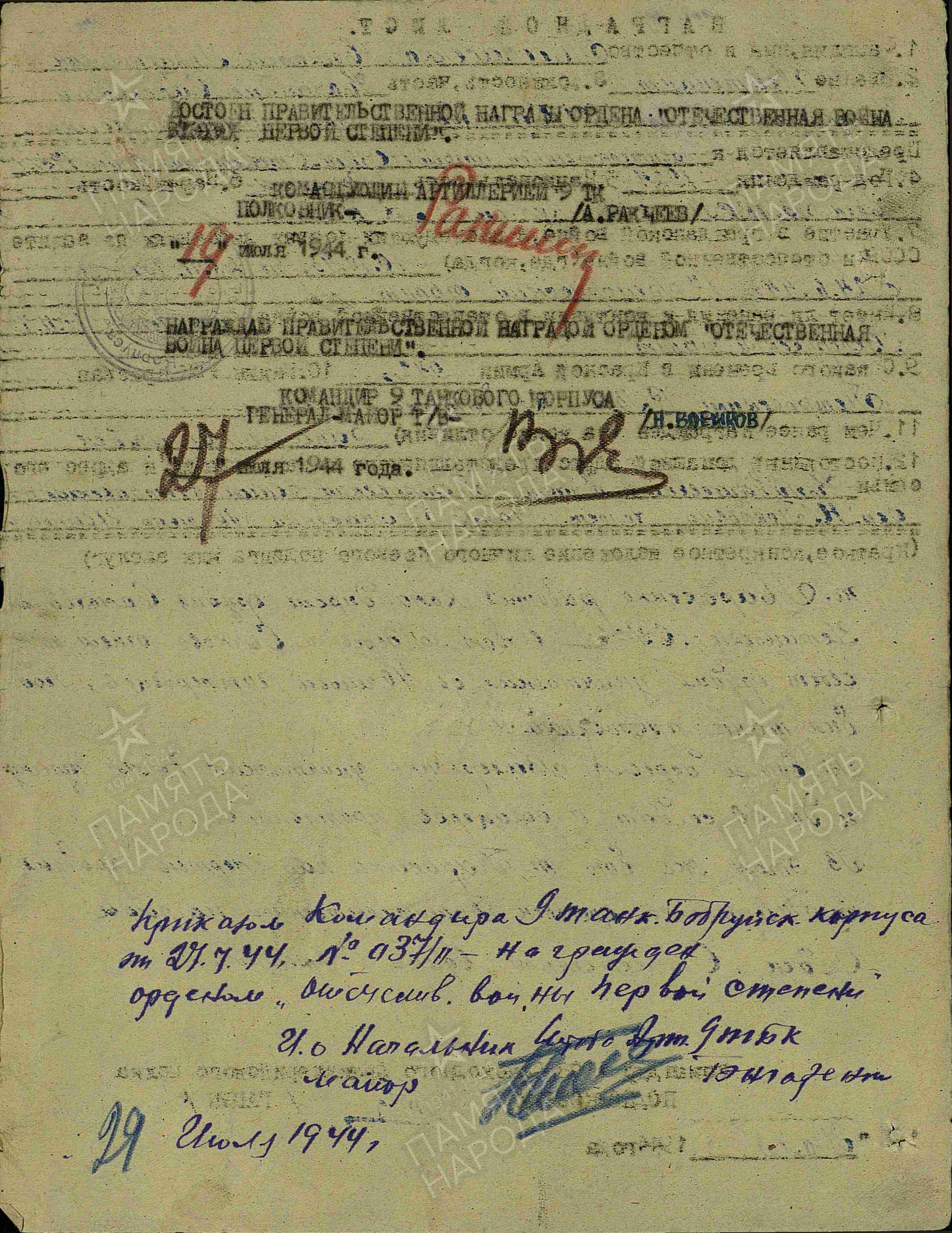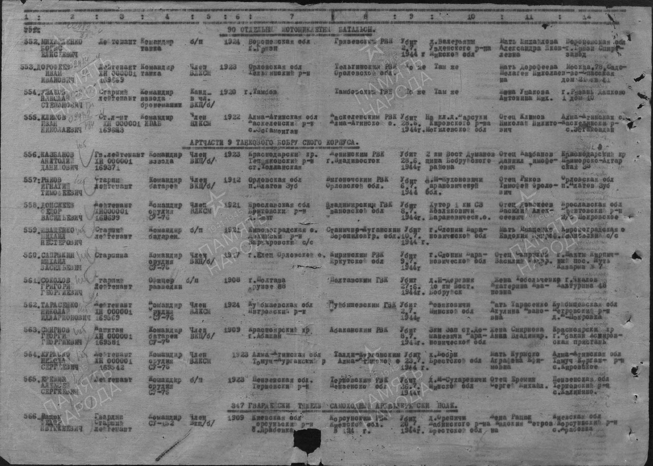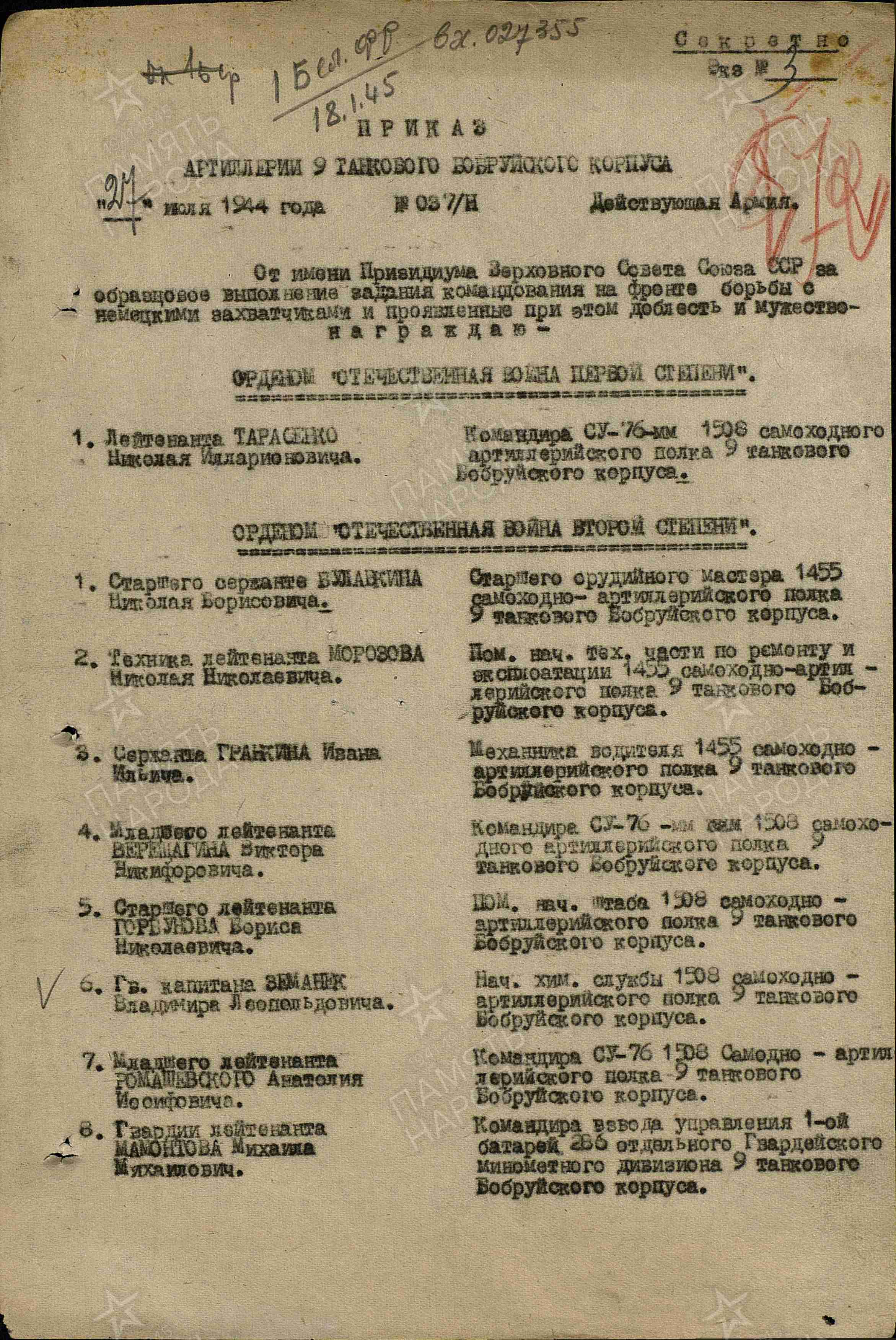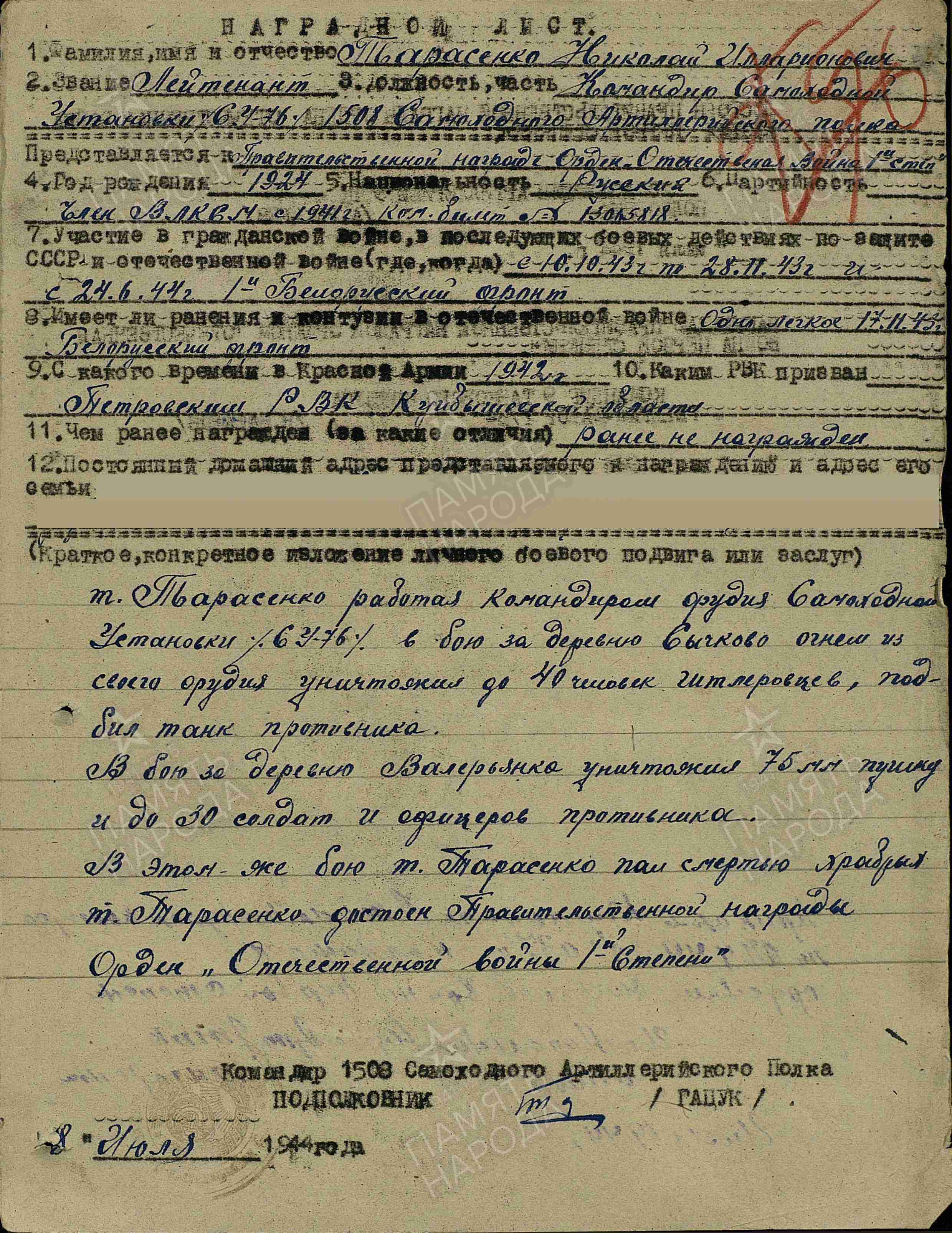 Информация из Наградного листа от 8 июля 1944 года к ордену Отечественной войны I степени: «т. Тарасенко, работая командиром орудия самоходной установки СУ-76, в бою за деревню Сычково огнем из своего орудия уничтожил до 40 человек гитлеровцев, подбил танк противника. В бою за деревню Валерьянка уничтожил 75 мм пушку и до 30 солдат и офицеров противника. В этом же бою т. Тарасенко пал смертью храбрых. т. Тарасенко достоин Правительственной награды Орден «Отечественной войны I степени».
