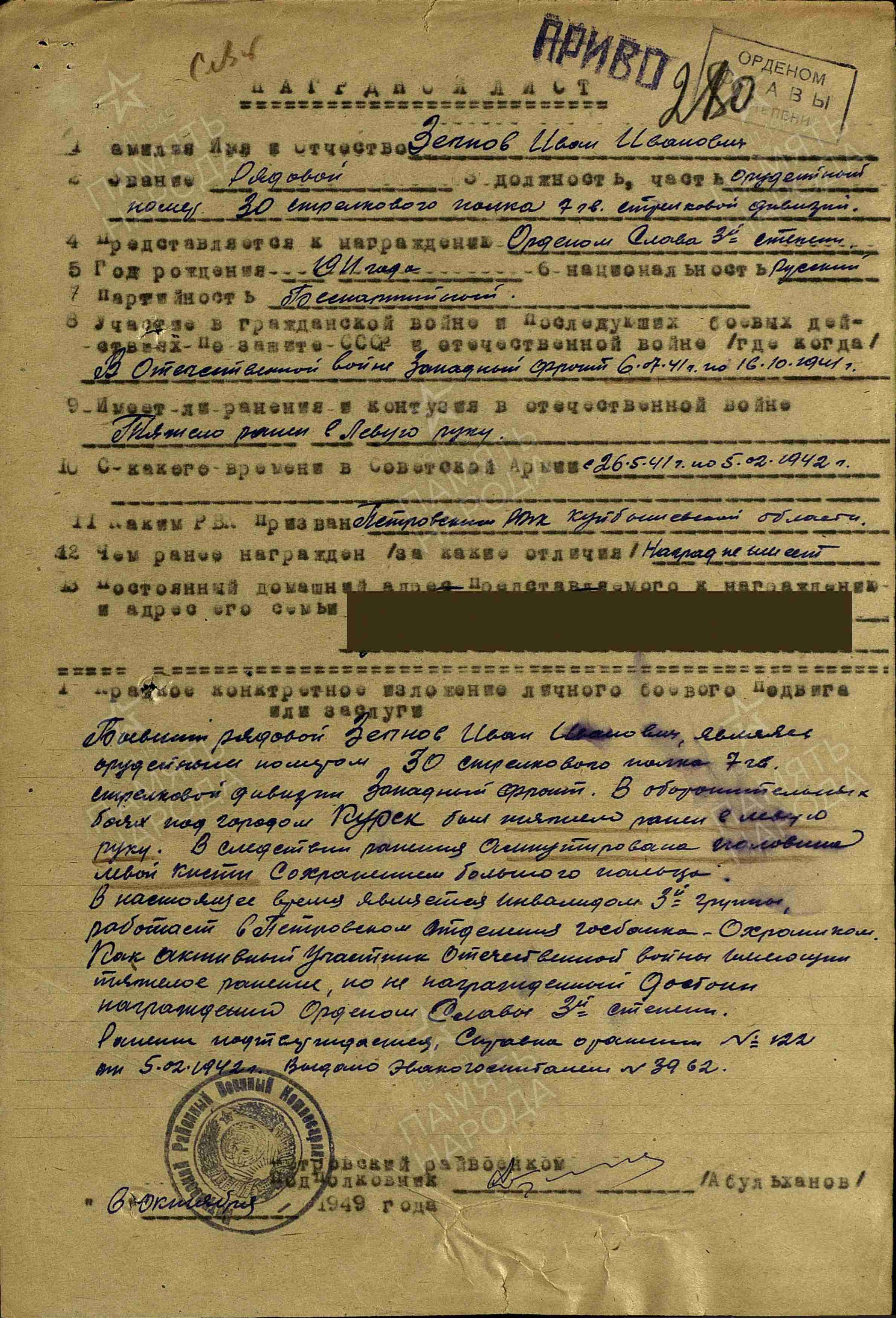Информация из Наградного листа от 6 октября 1949 года к ордену Славы III степени: «Бывший рядовой Зепнов Иван Иванович являлсяорудийным номером 30 стрелкового полка 7 гвардейской стрелковой дивизии Западный фронт. В оборонительных боях под городом Курск был тяжело ранен в левую руку. Вследствие ранения ампутирована половина левой кисти с сохранением большого пальца. В настоящее время является инвалидом 3-й группы, работает в Петровском отделении госбанка охранником. Как активный участник Отечественной войны, имеющий тяжелое ранение, но не награжденный, достоин награждения орденом Славы III степени».