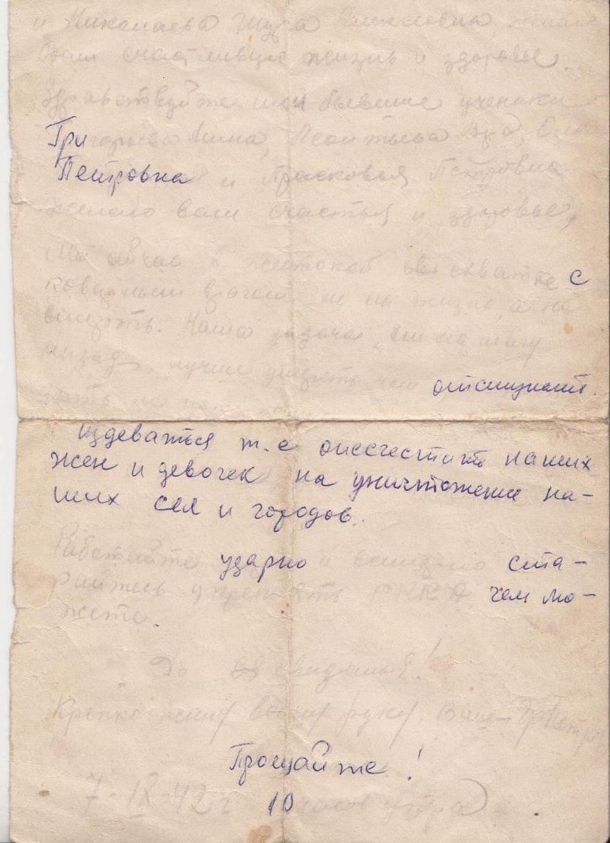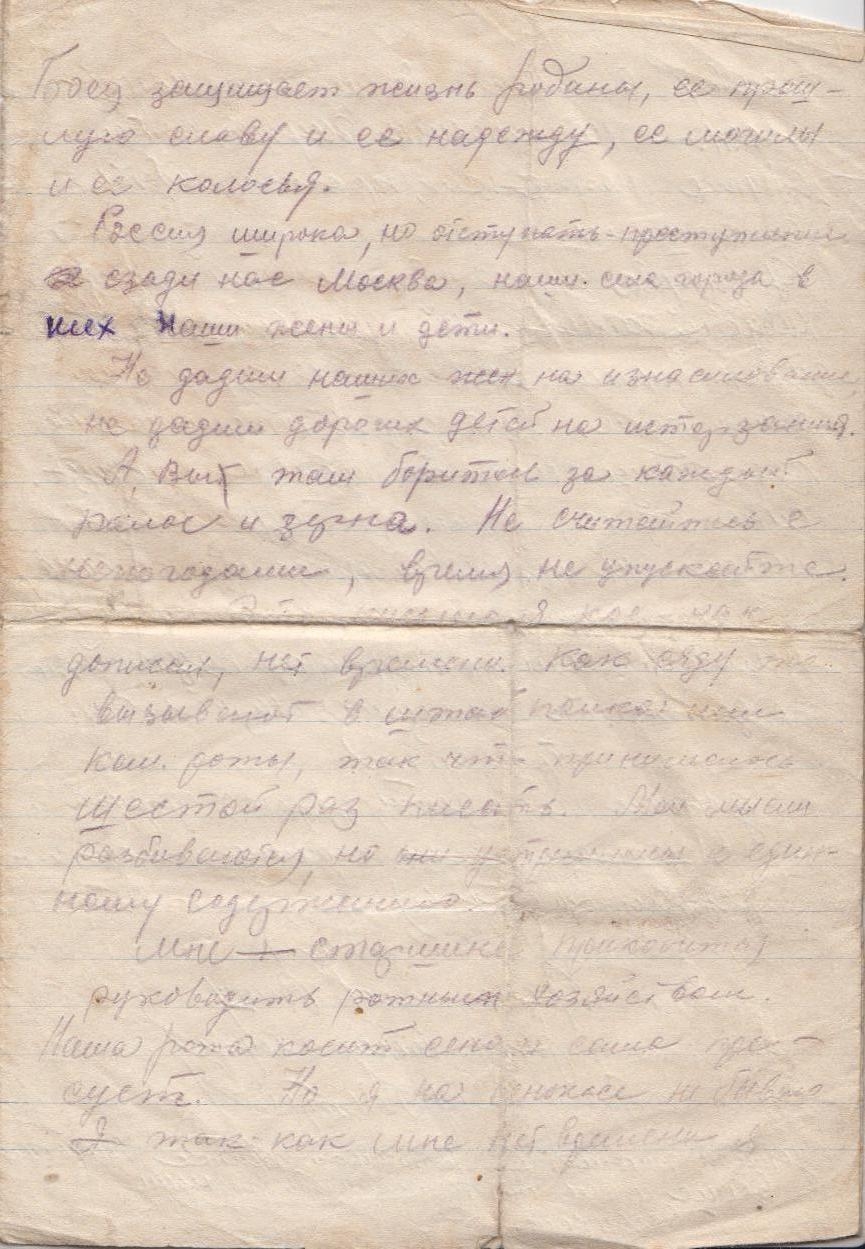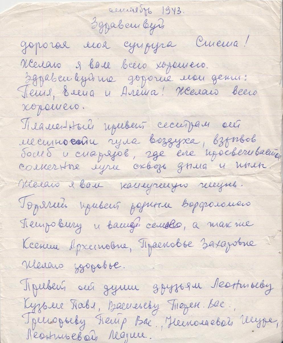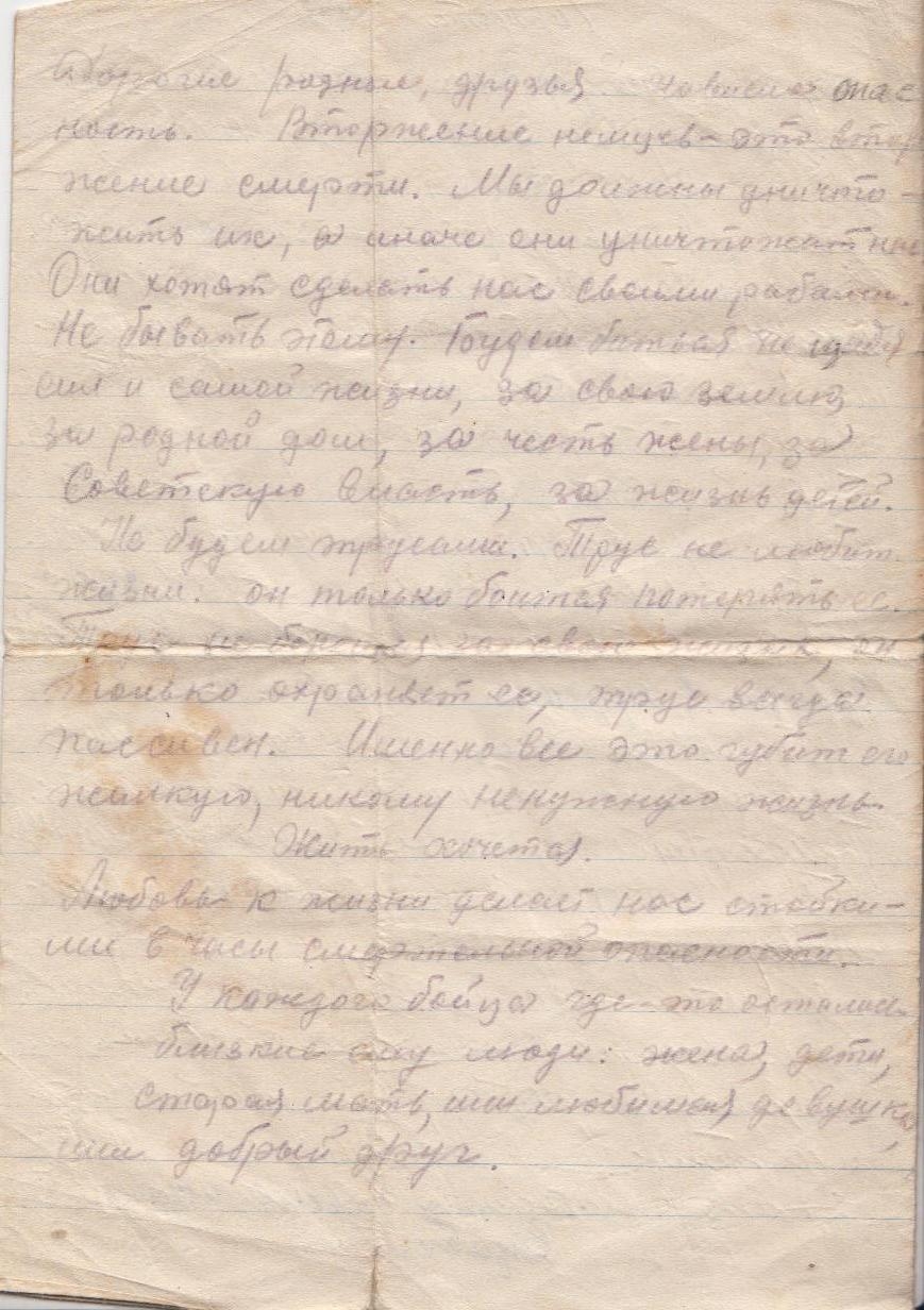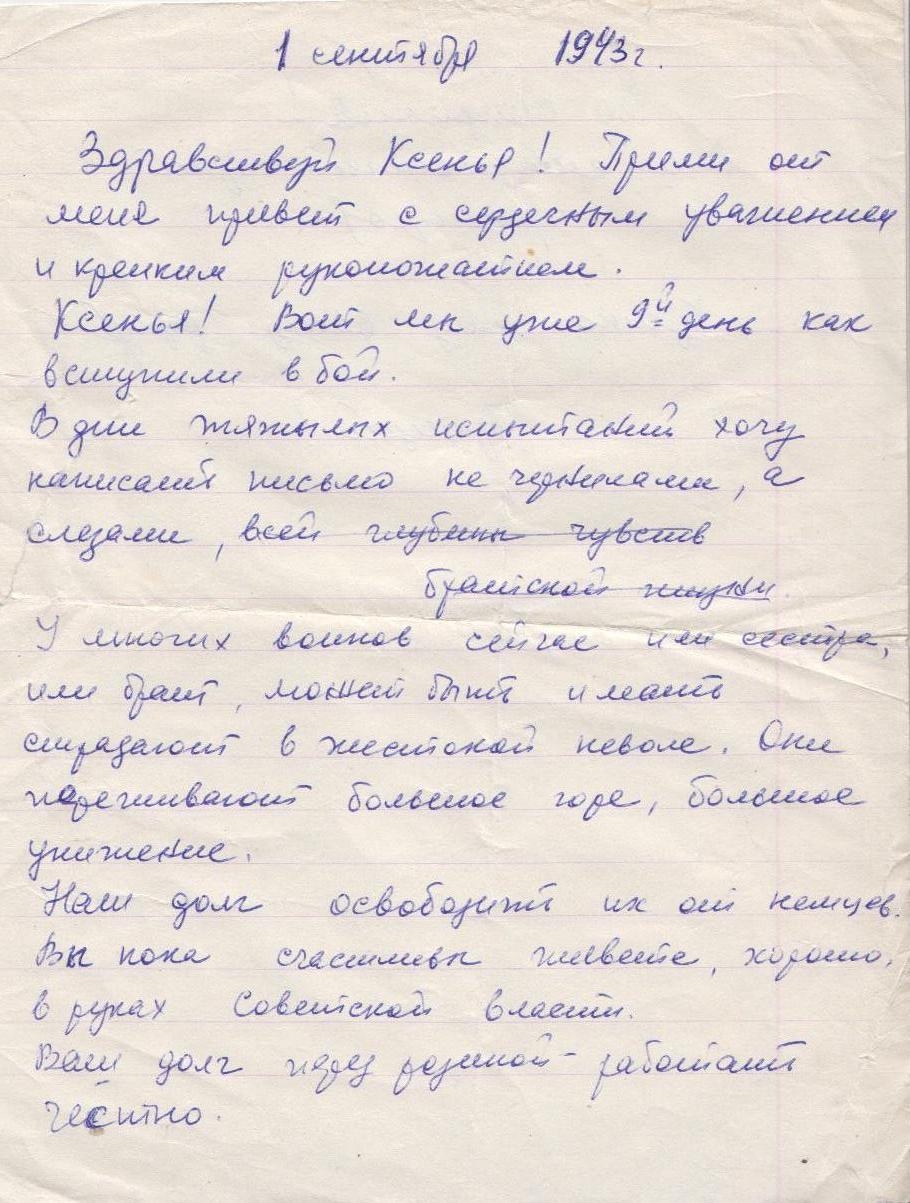 Из письма от 3 сентября 1943 года: «В дни тяжелых испытаний хочу написать письмо не чернилами, а слезами. У многих воинов сейчас или сестра, или брат, может быть, и мать страдают в жестокой неволе. Они переживают большое горе, большое унижение. Наш долг освободить их от немцев. Вы пока счастливо живете, хорошо, в руках Советской власти. Ваш долг перед Родиной – работать честно».