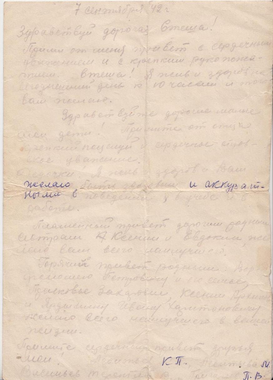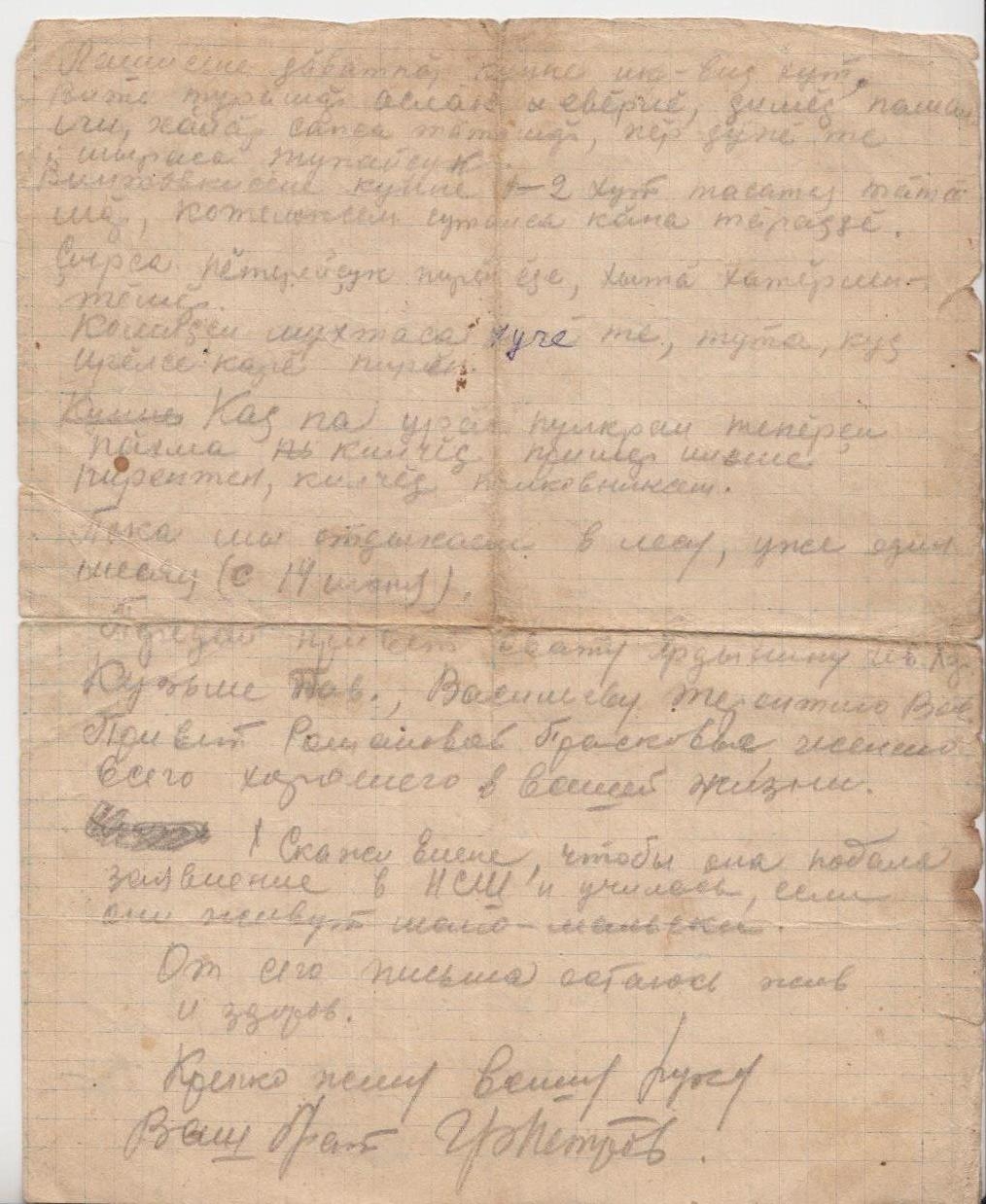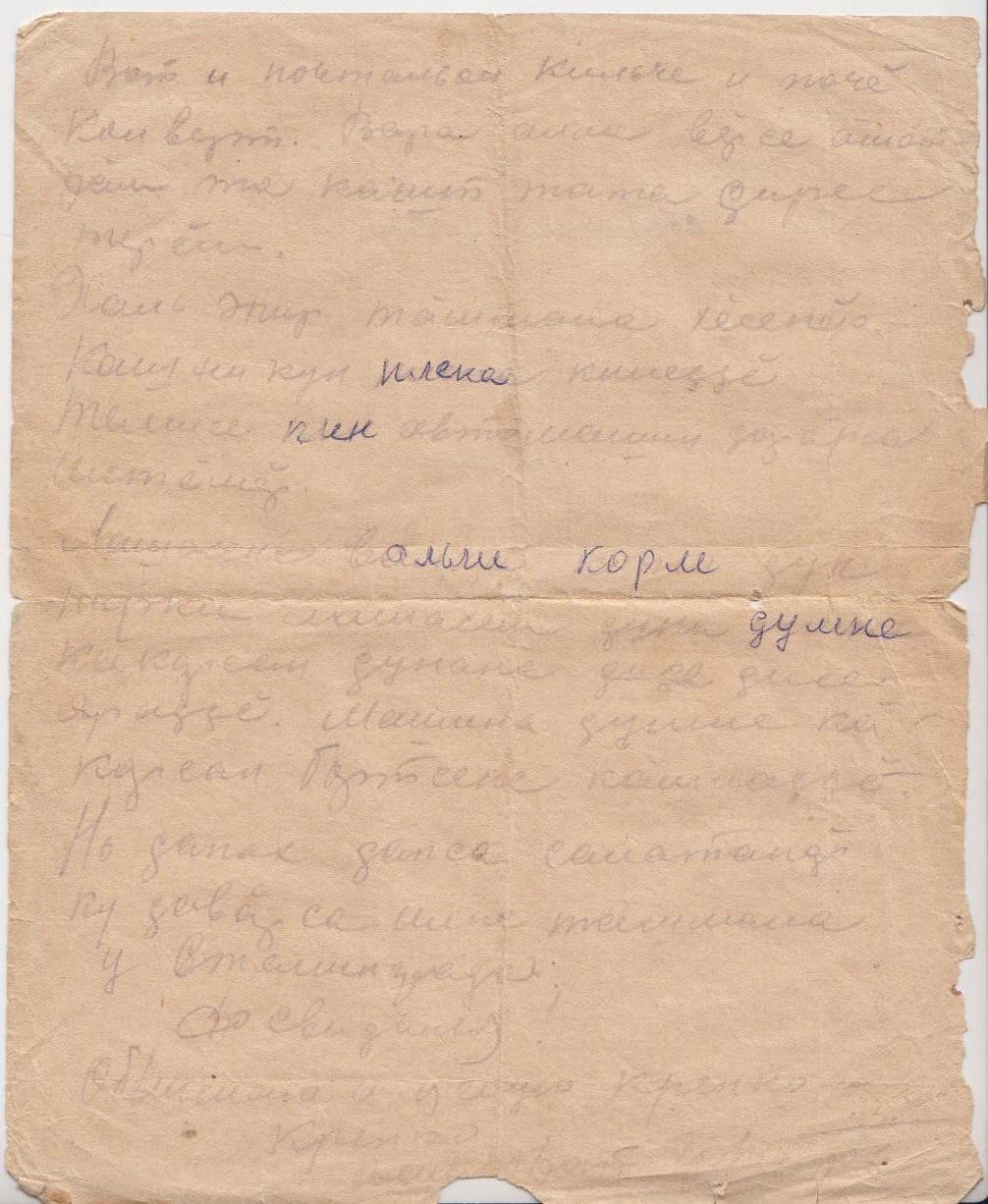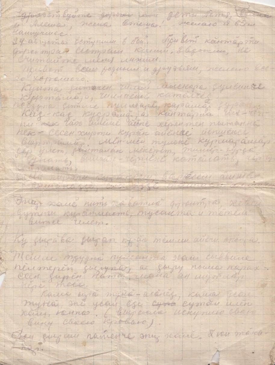 Из письма от 3 сентября 1943 года: «В дни тяжелых испытаний хочу написать письмо не чернилами, а слезами. У многих воинов сейчас или сестра, или брат, может быть, и мать страдают в жестокой неволе. Они переживают большое горе, большое унижение. Наш долг освободить их от немцев. Вы пока счастливо живете, хорошо, в руках Советской власти. Ваш долг перед Родиной – работать честно».